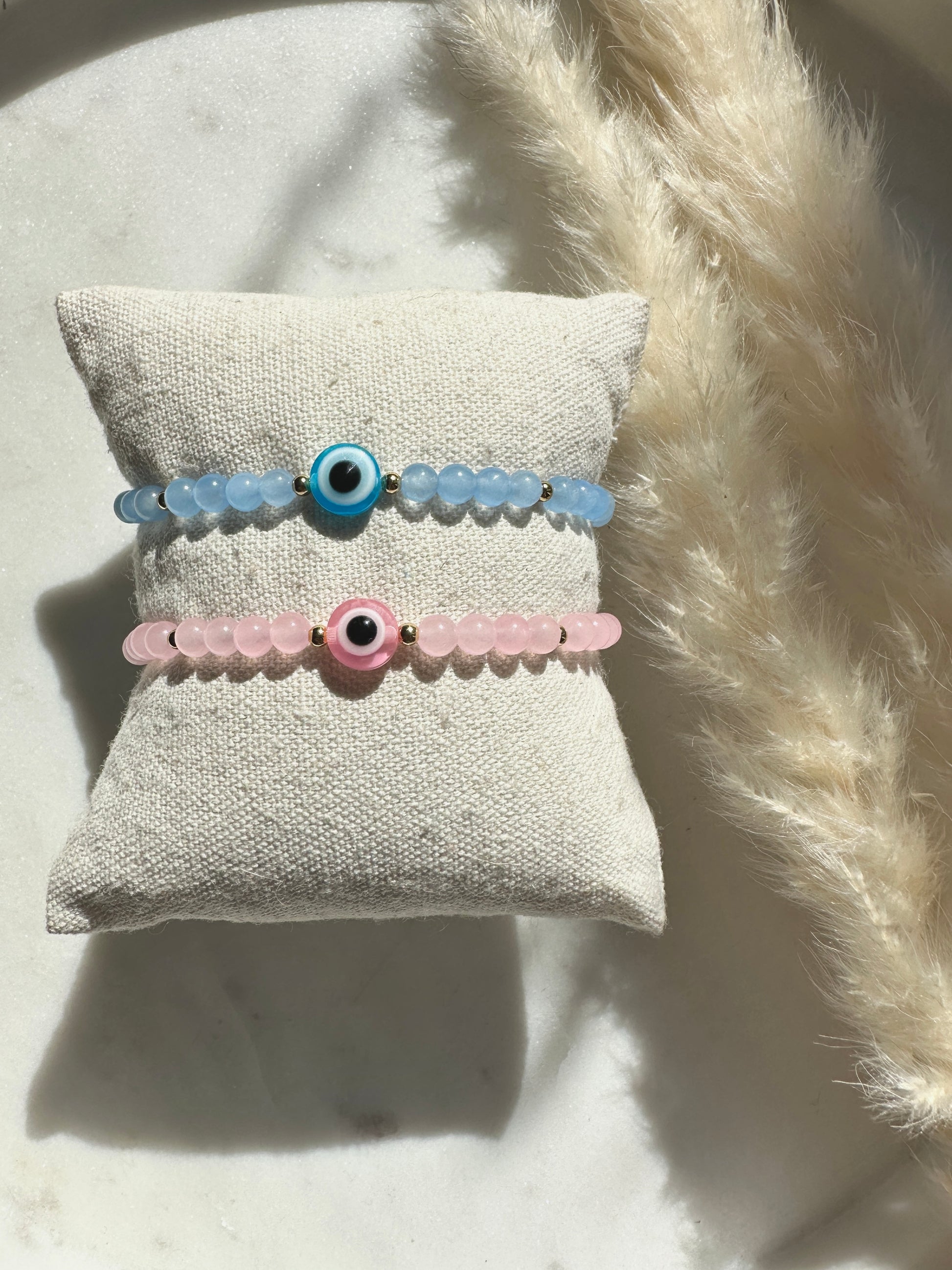 Light blue jade or rose quartz paired with your choice of gold or silver accents and an evil eye.