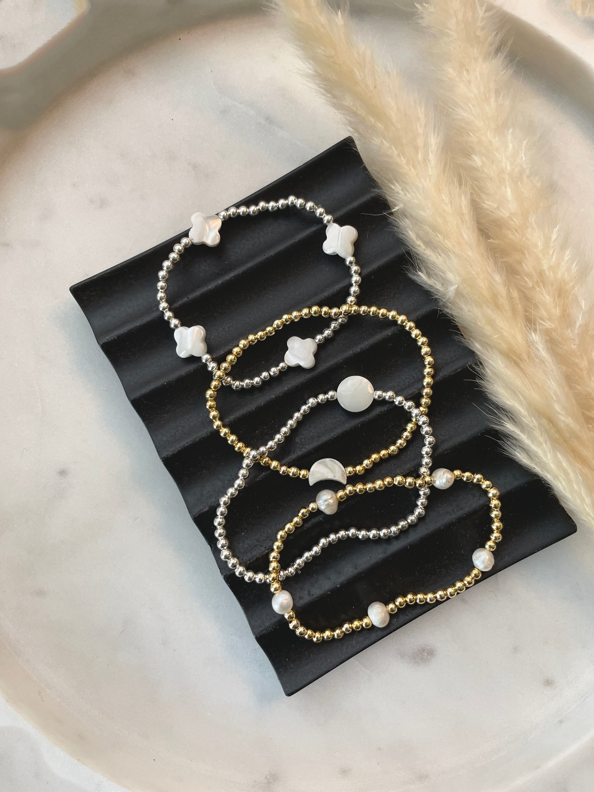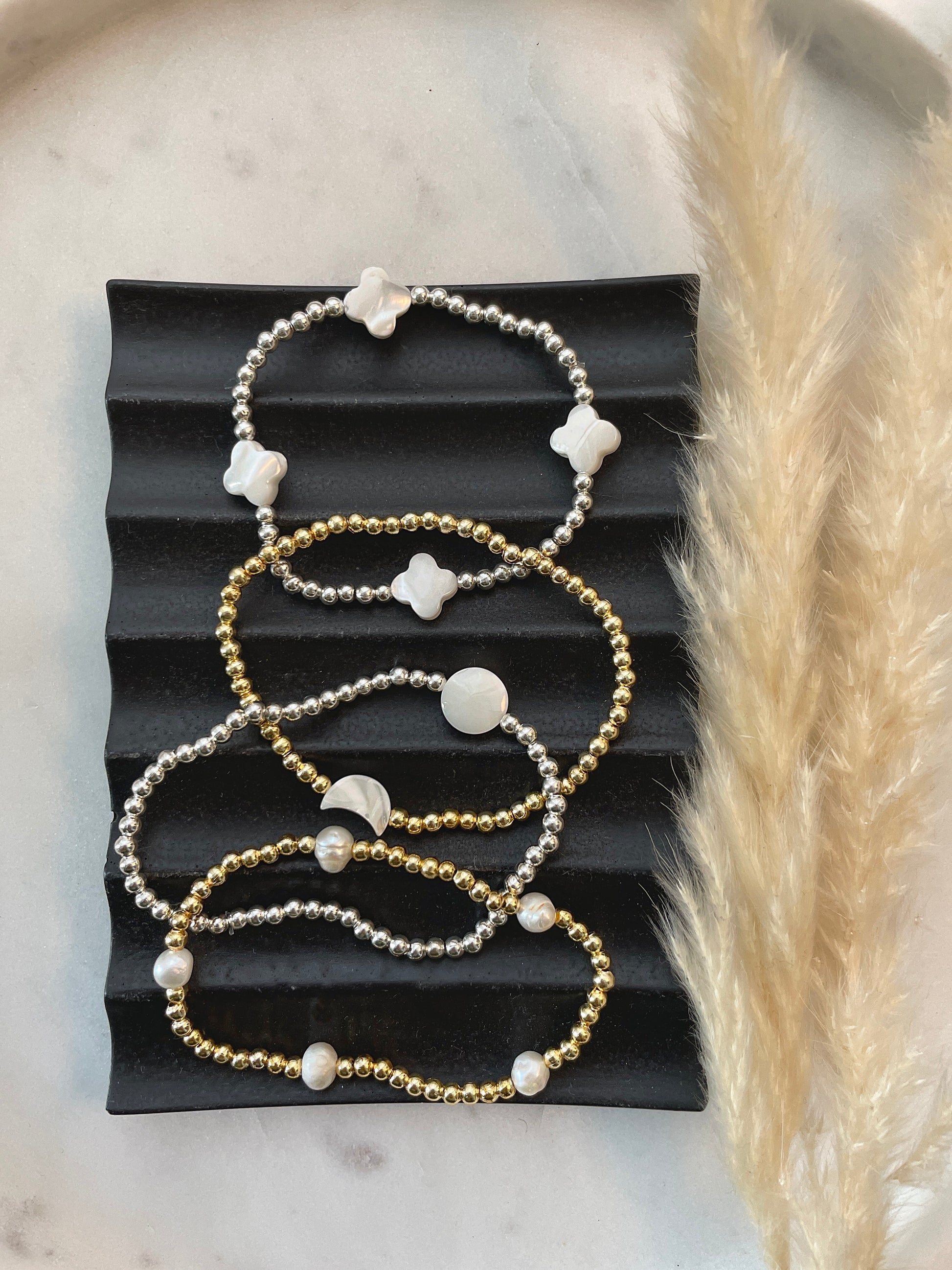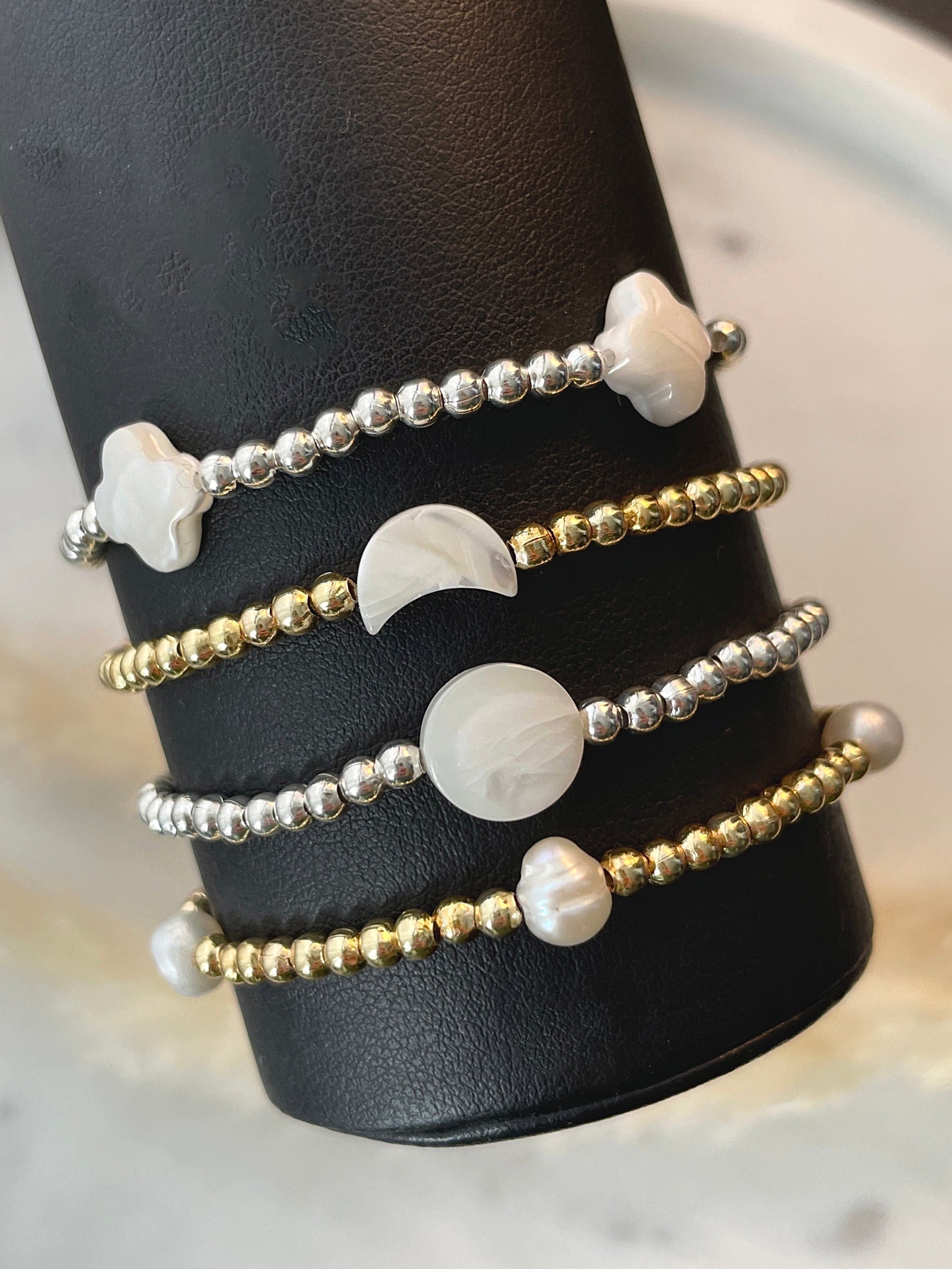 Gold or silver 3mm beads paired with genuine potato, disc, clover or crescent moon pearls.