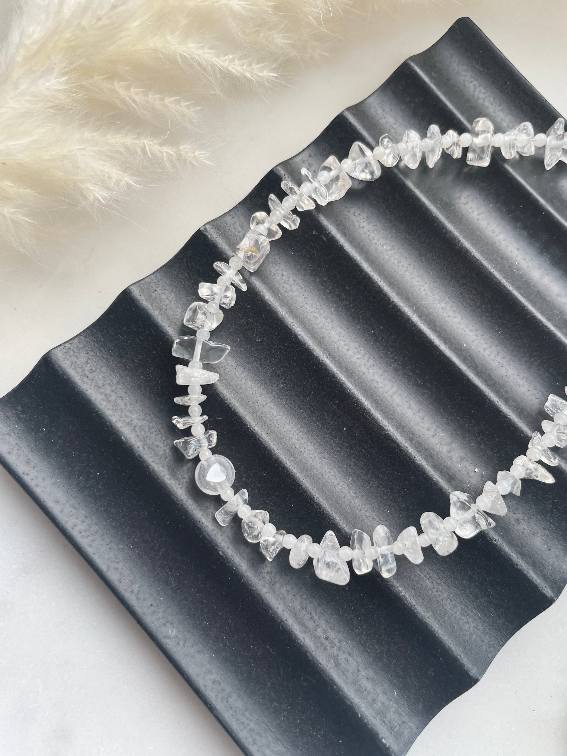 Crystal chip necklace, 17” in length with your choice of silver or gold toggle fastening.