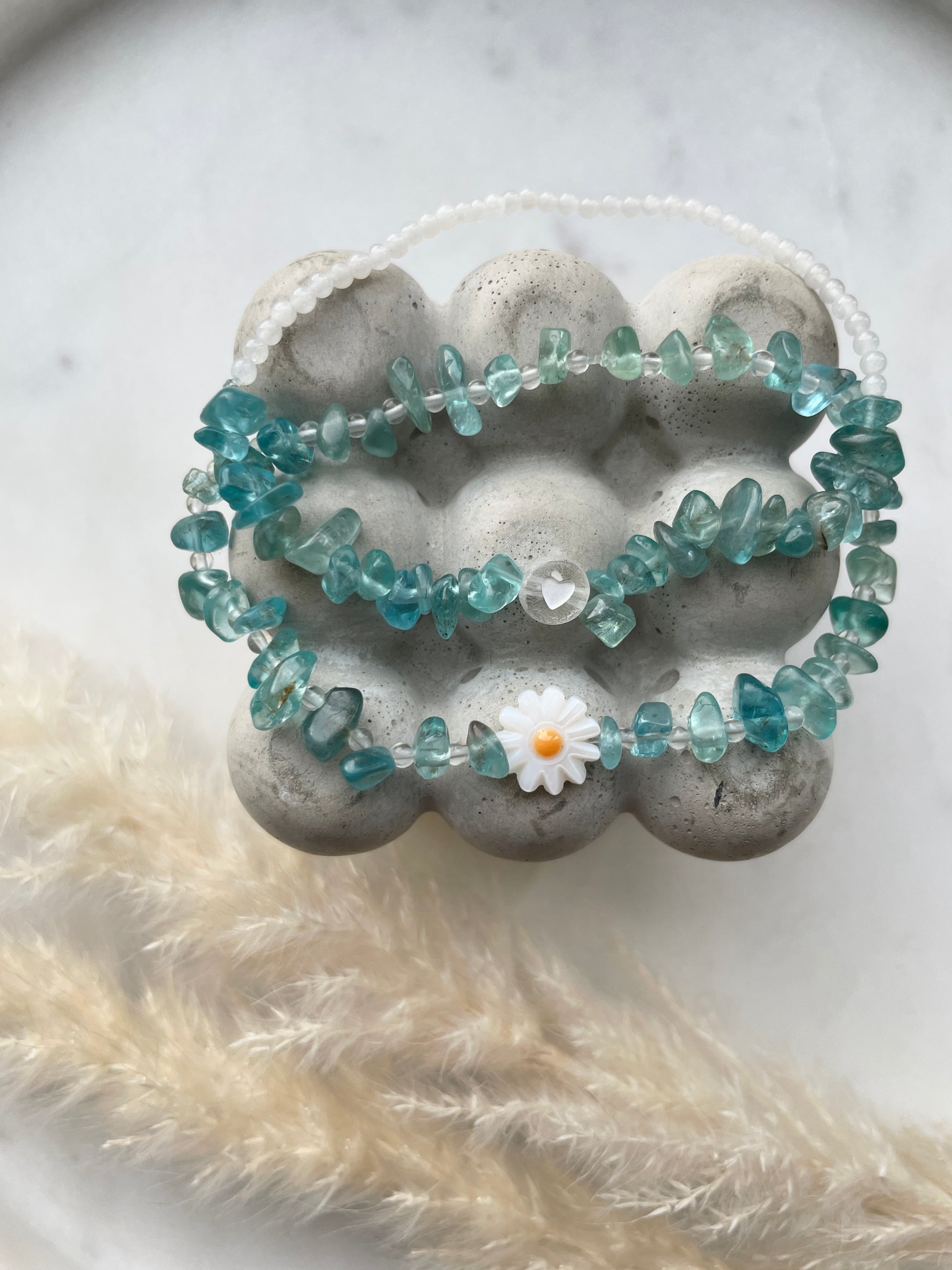 Shown here with a mother of pearl daisy or with a heart half & half with white jade spacers.