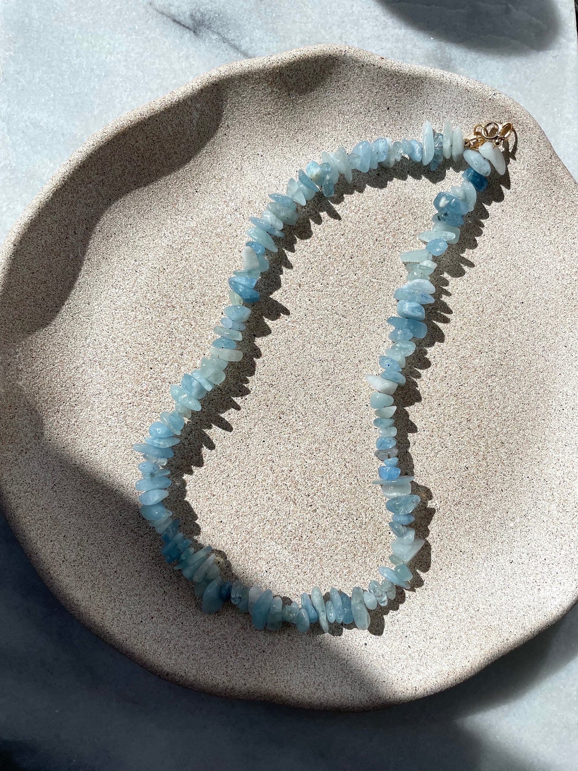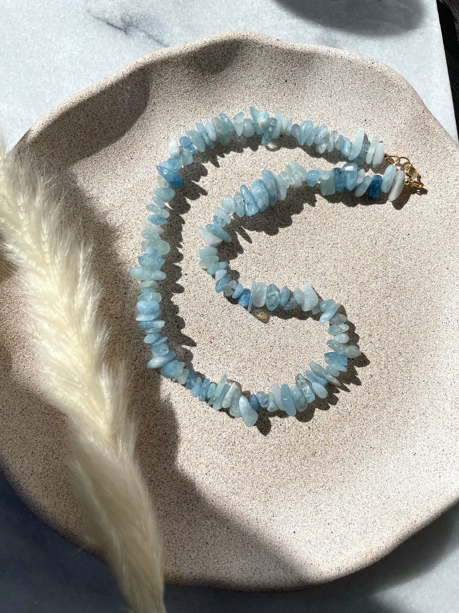 Aquamarine crystal chips in a choker style with your choice of gold or silver accents & clasp fastening