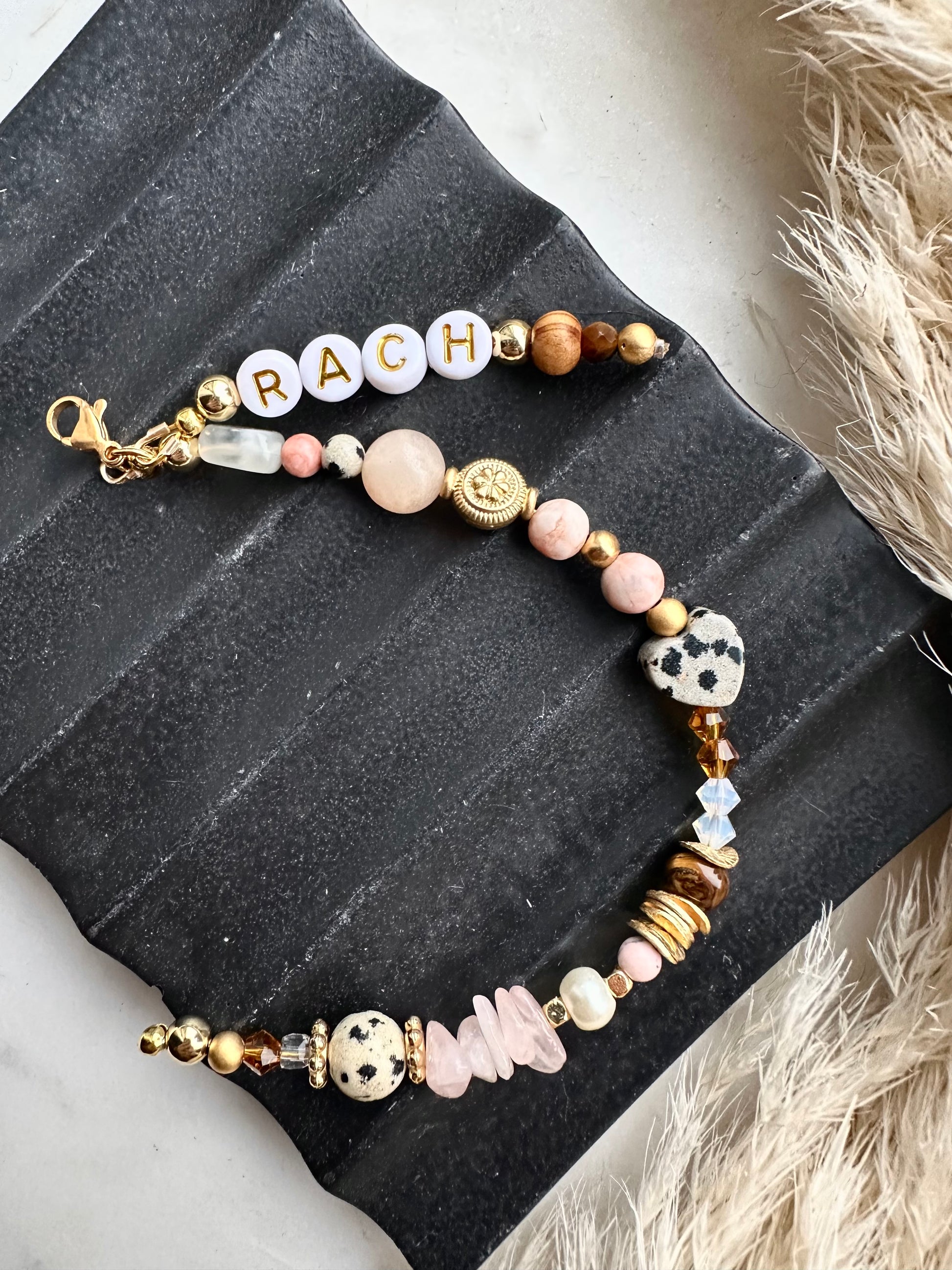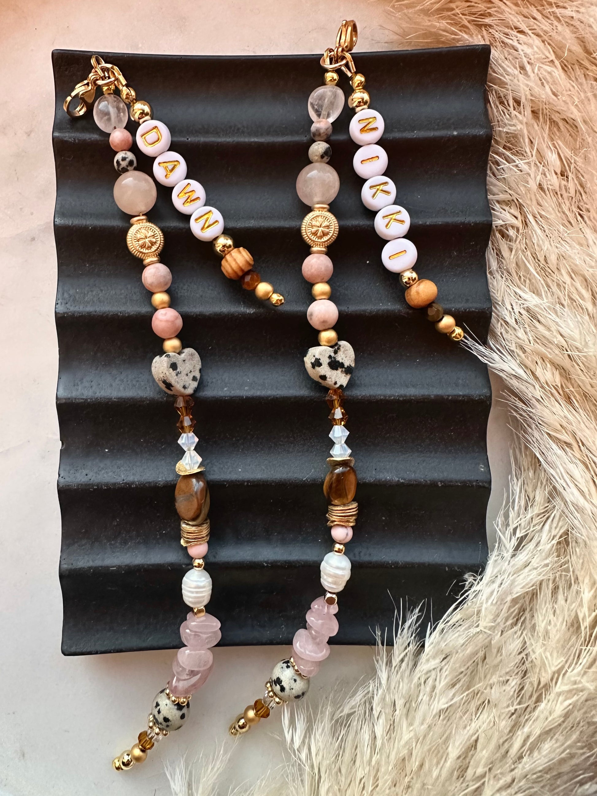 neutral - strung with a mix of rose quartz, sunstone, moonstone, agate, tigers eye, dalmatian jasper, gold plated accents & more