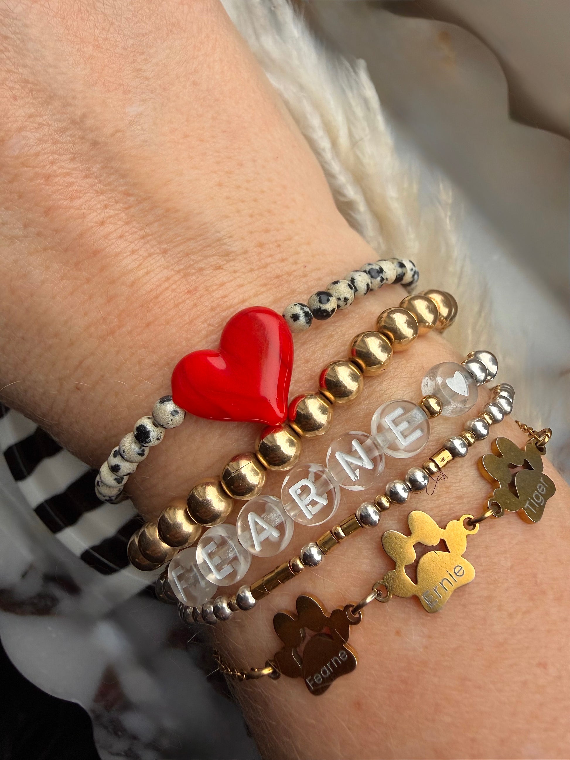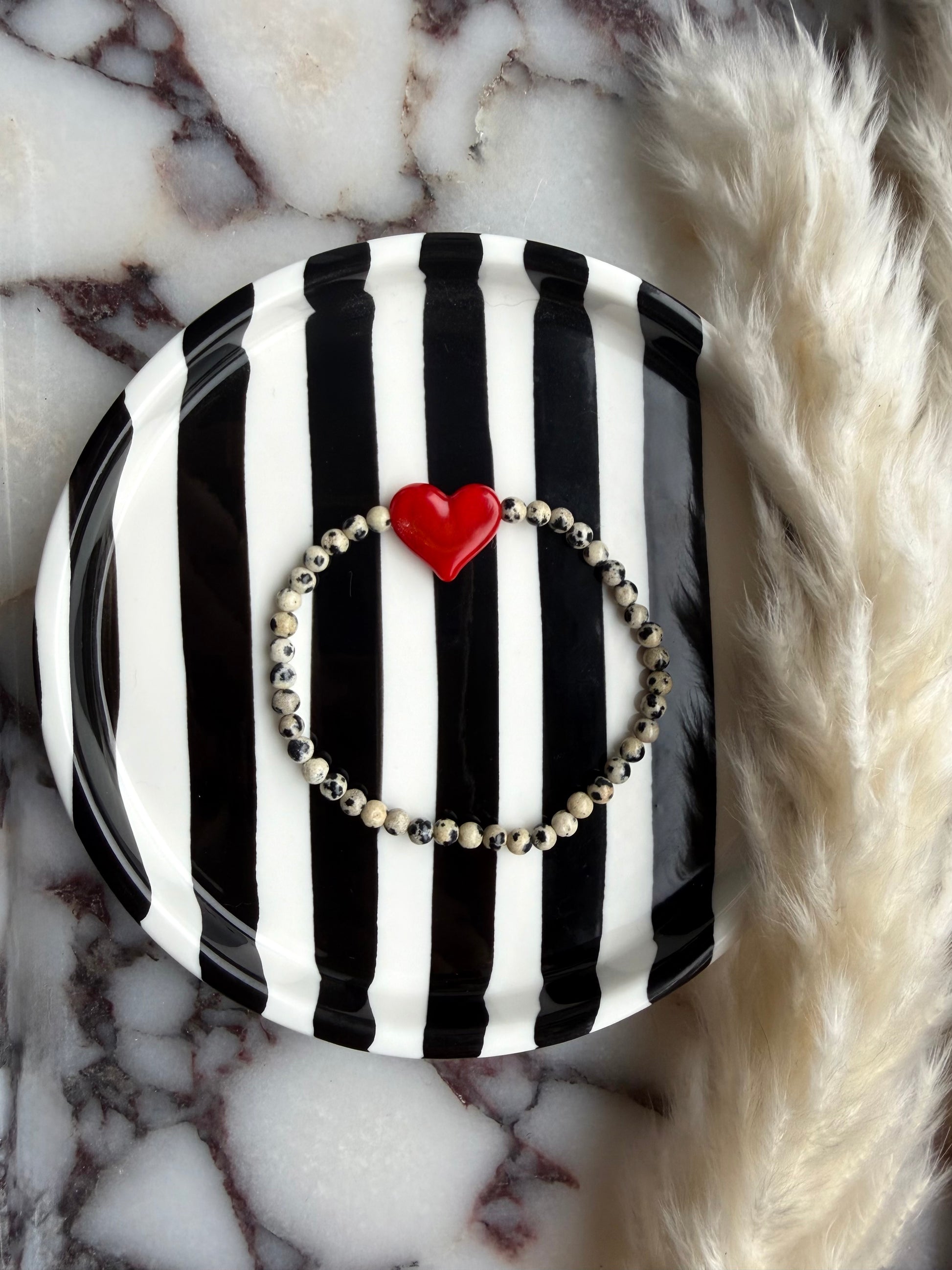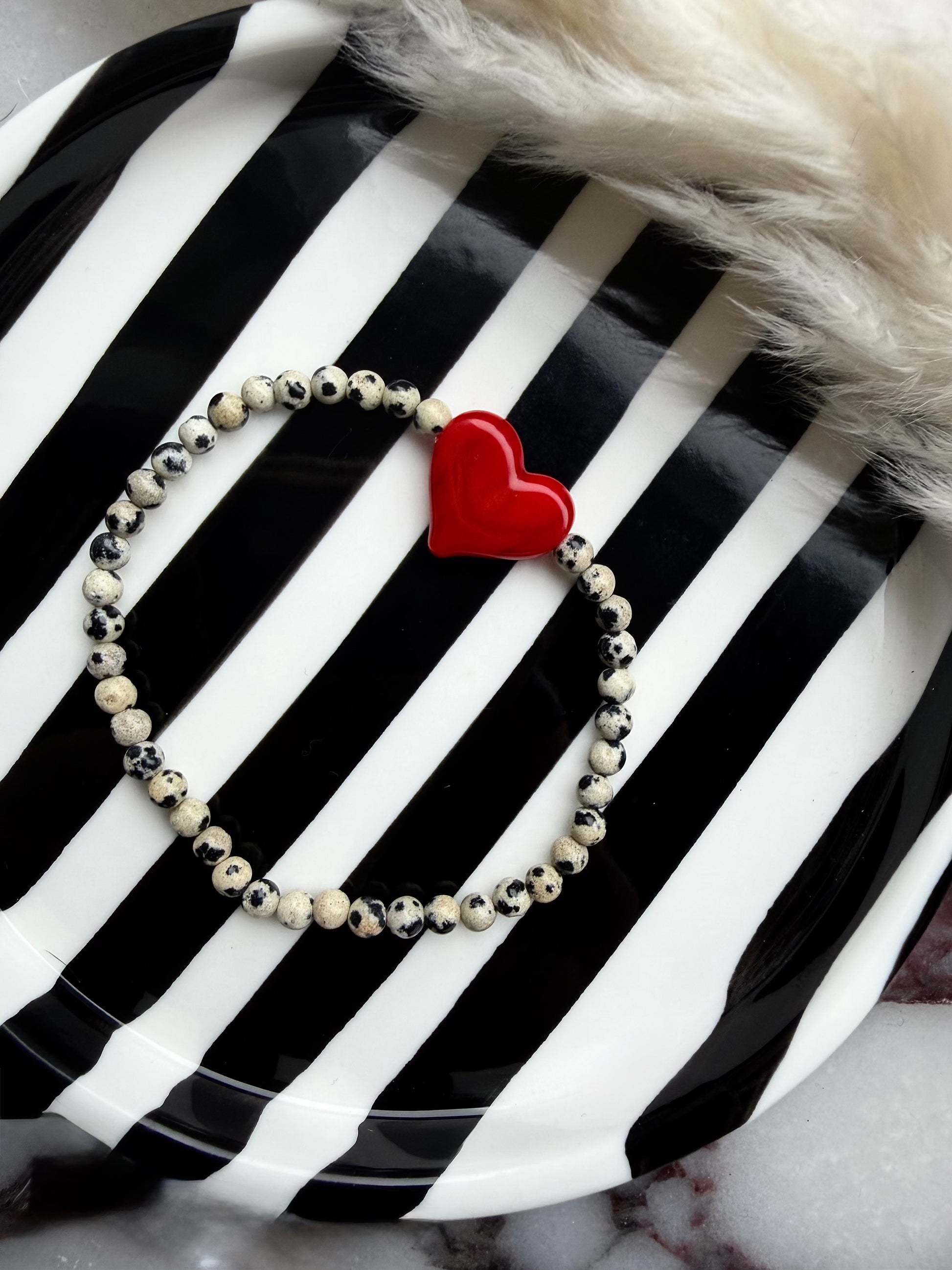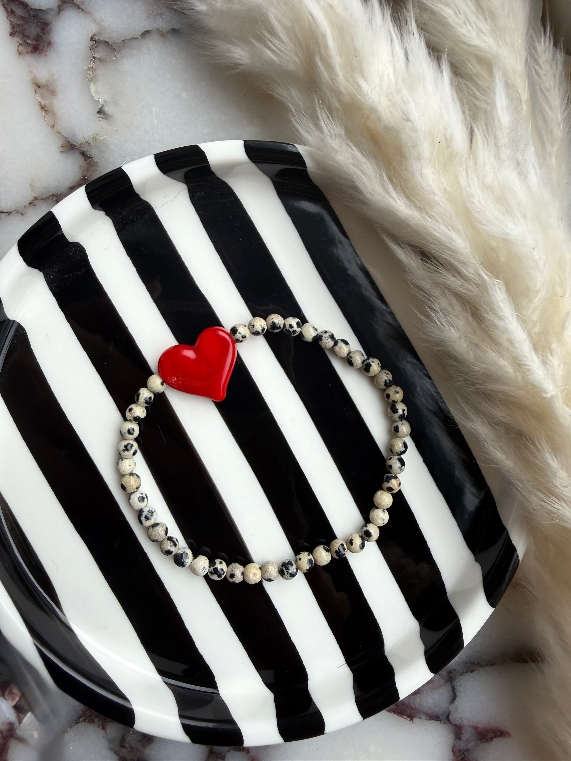 Dalmatian Jasper 4mm beads combined with a striking glass red heart is made to stand out & steal hearts.