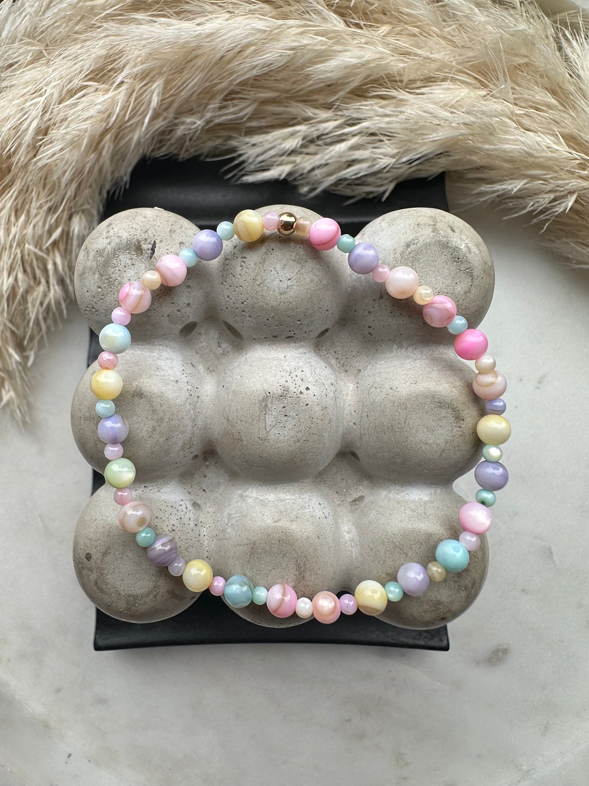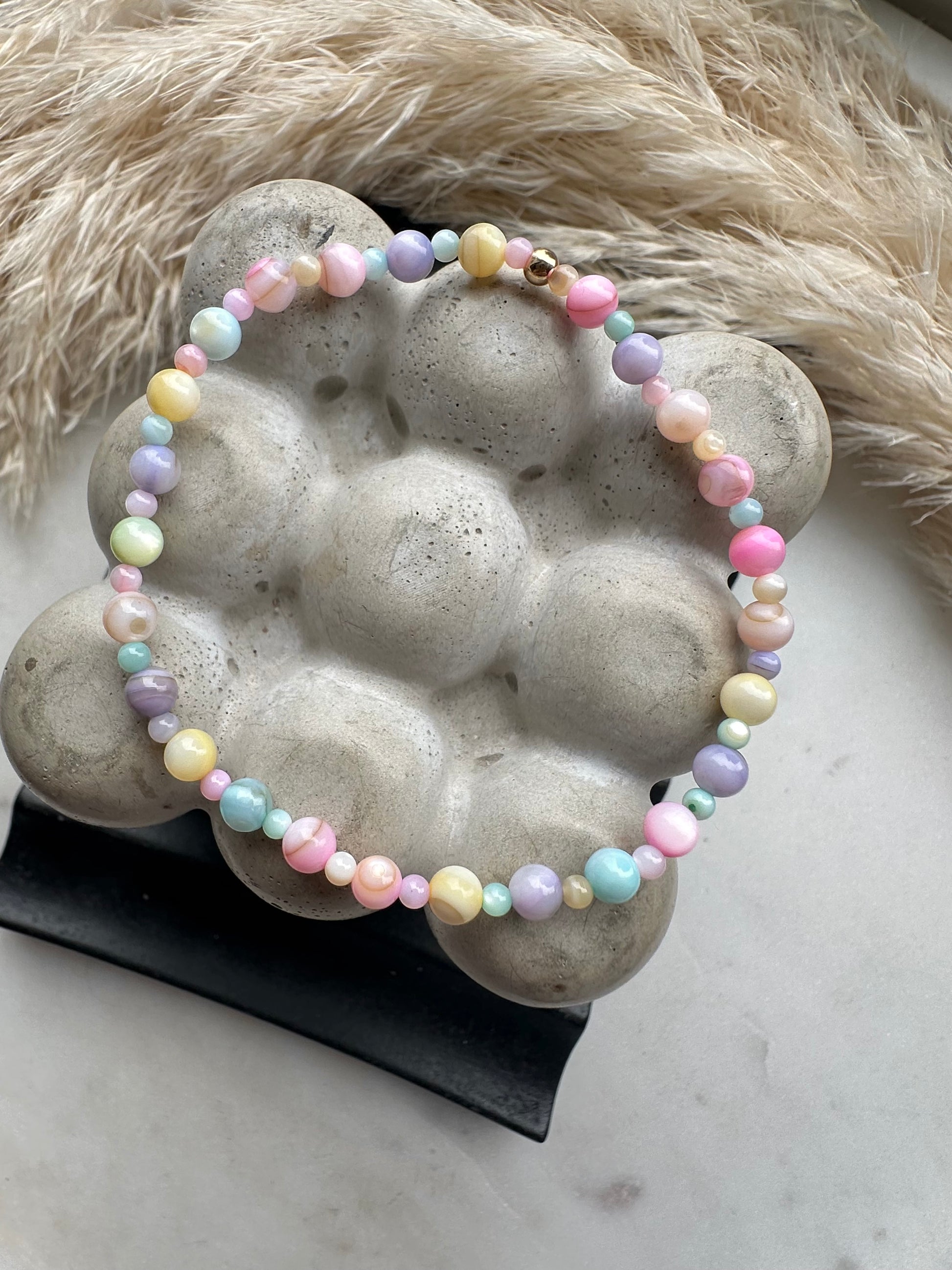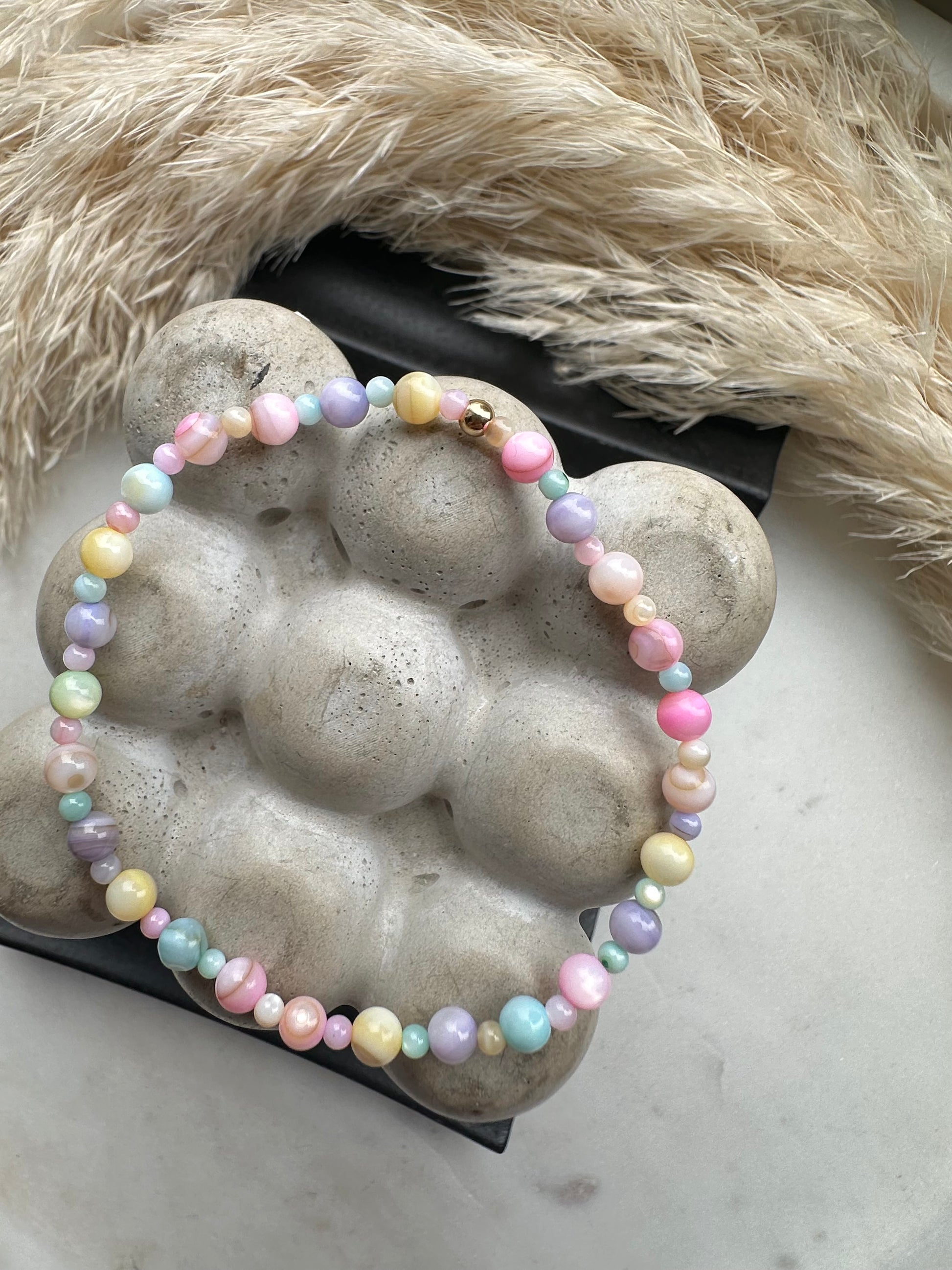 gorgeous pastel candy coloured mother of pearl beads strung together to make this compact satellite style. perfect to stack or to wear alone.