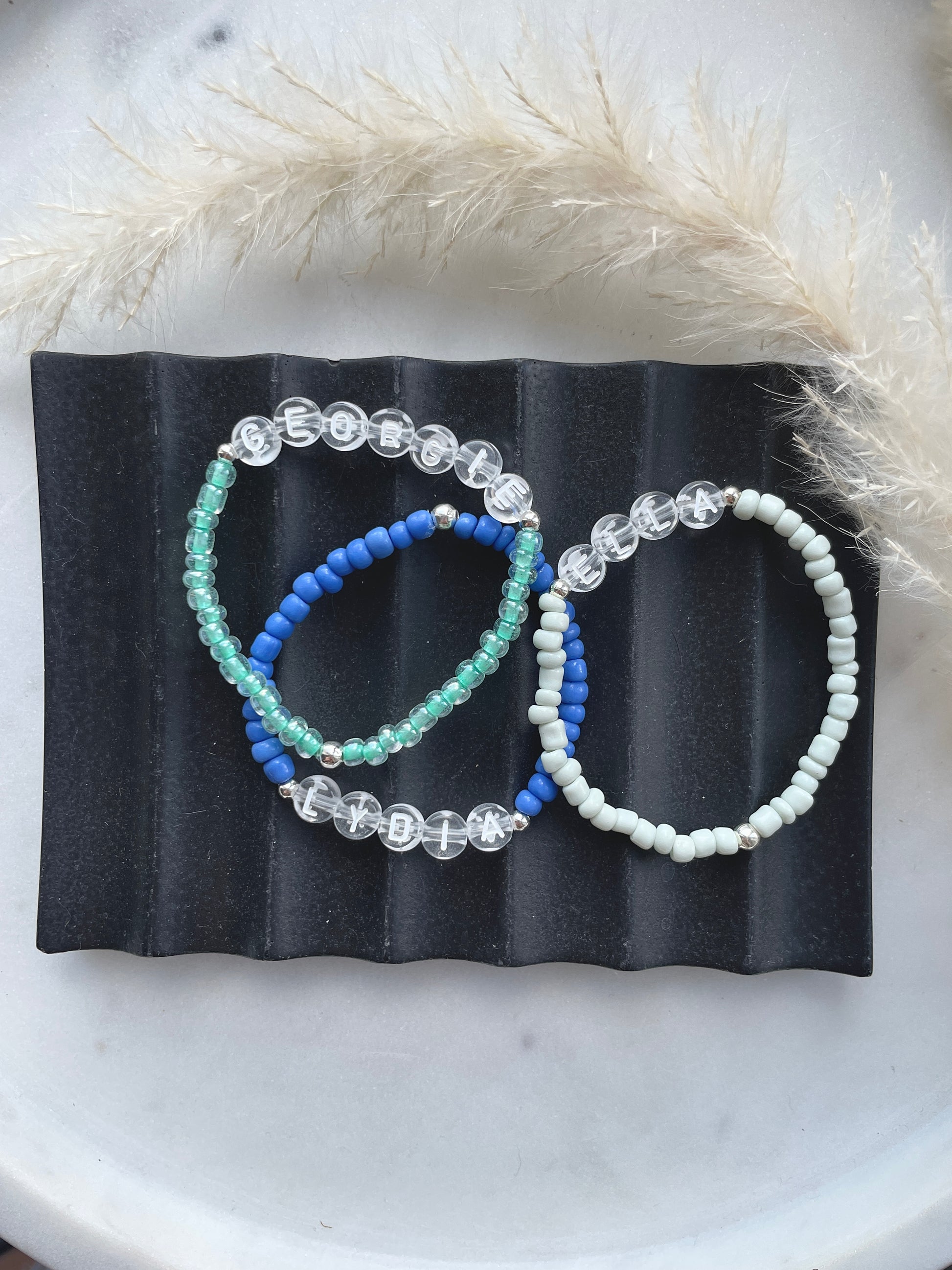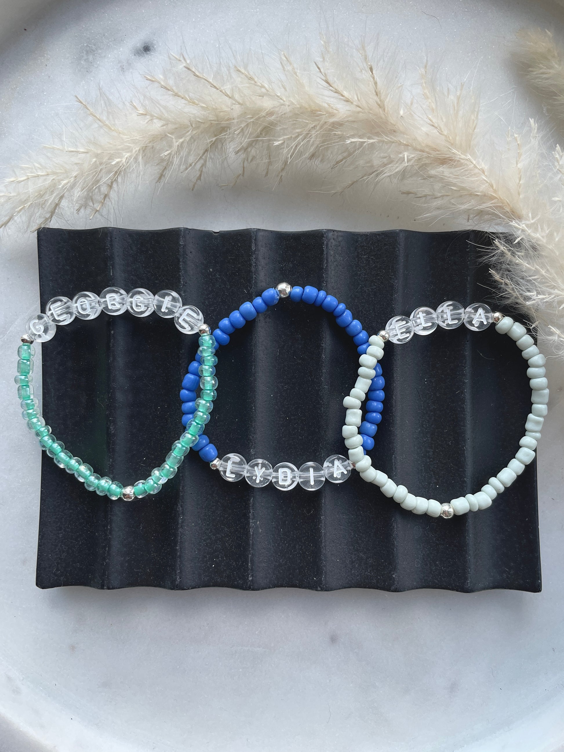 Glass seed bead personalised 4mm beaded bracelets with clear letter beads and your choice of colour and accent bead.