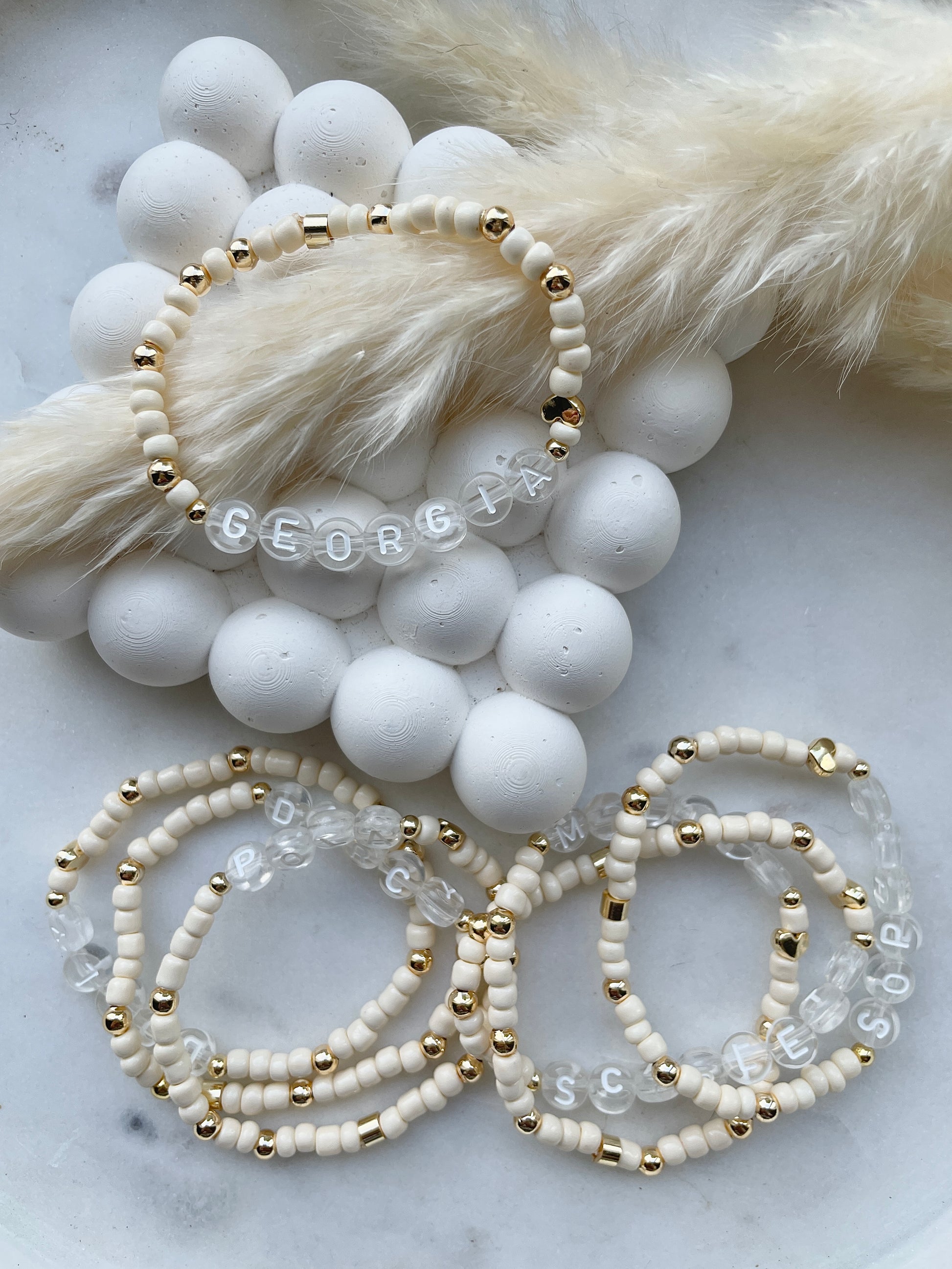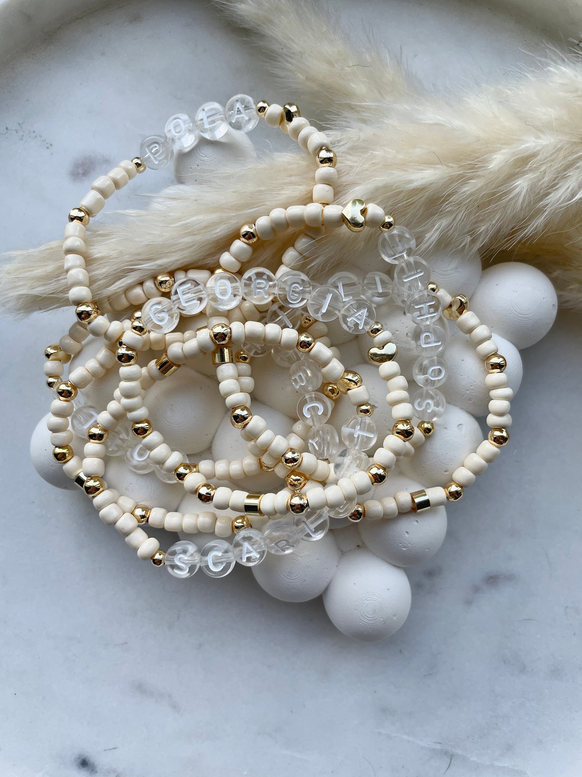 Cream seed bead children’s bracelets with a heart and your choice of gold or silver accents.