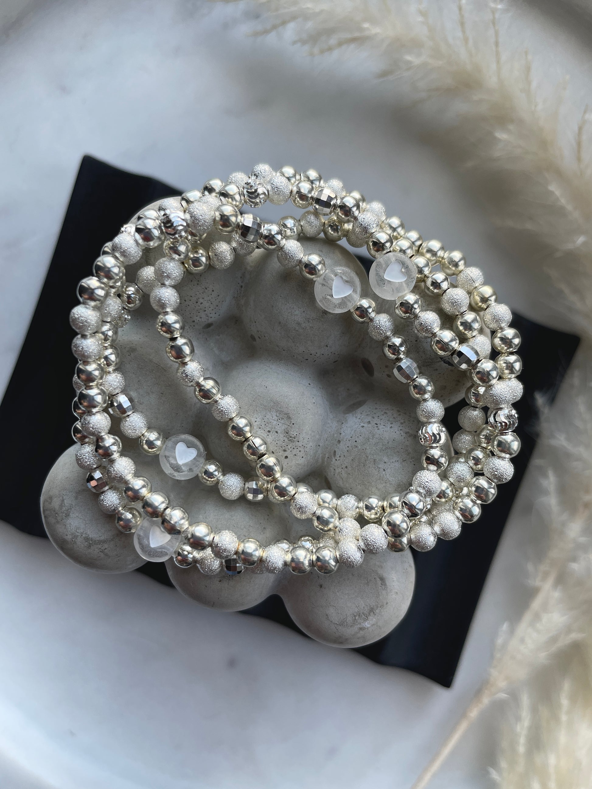 A mix of silver plated 4mm beads paired with a clear heart bead.
