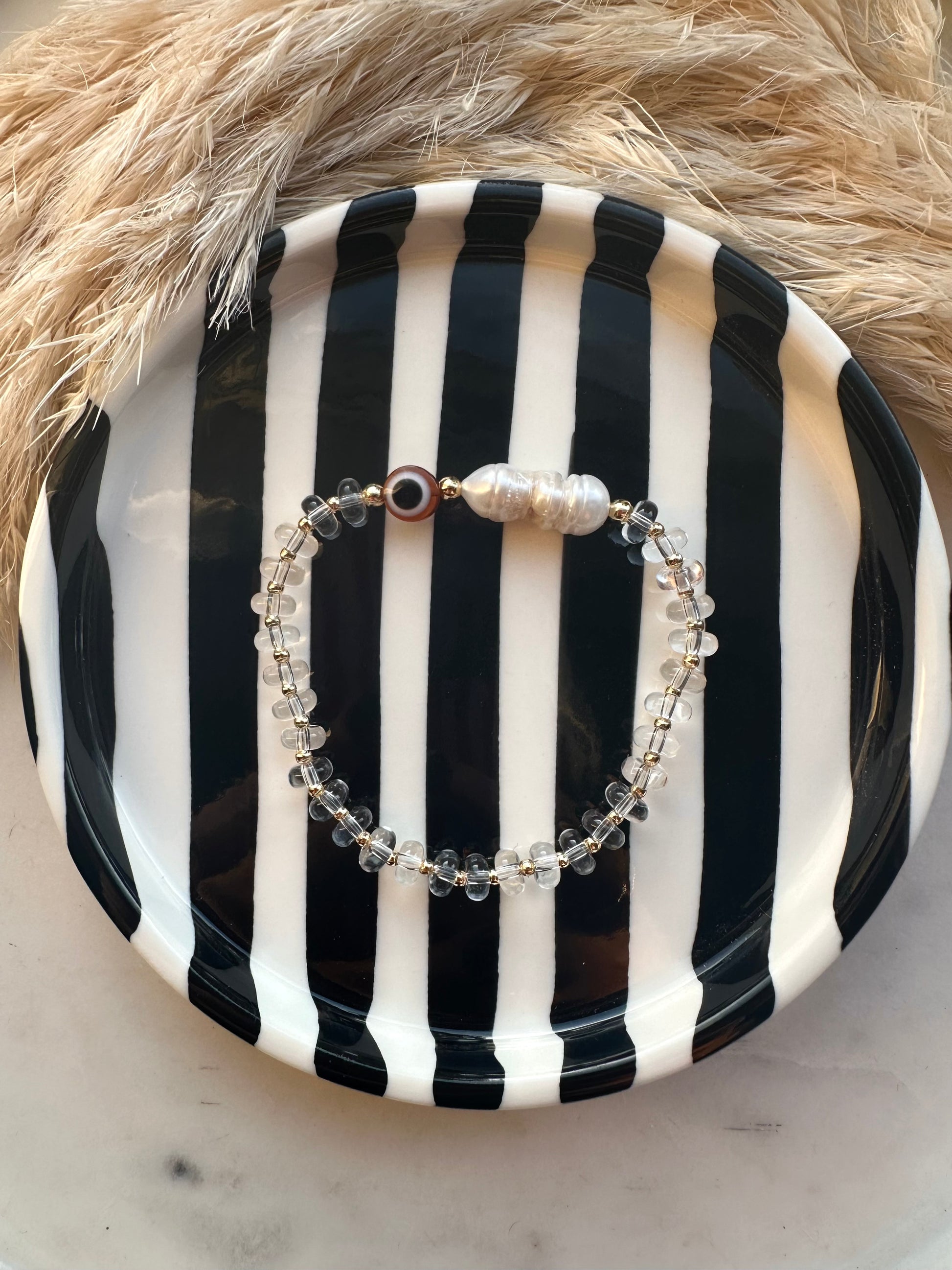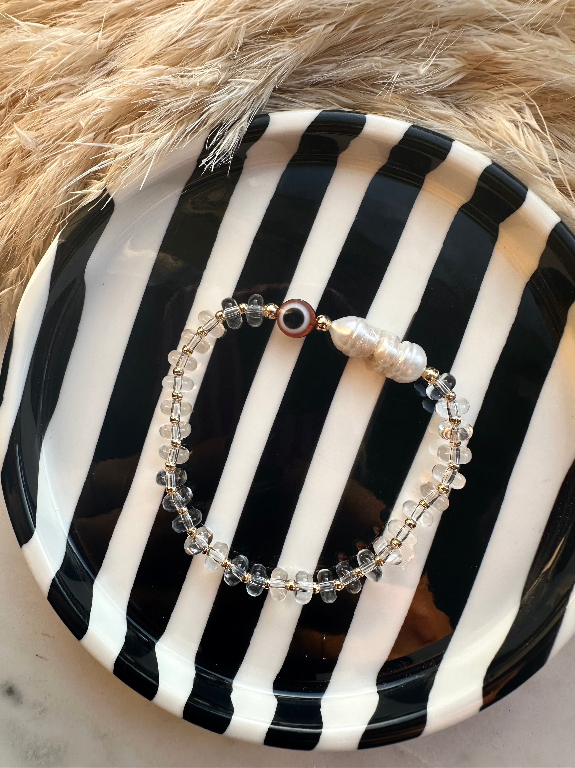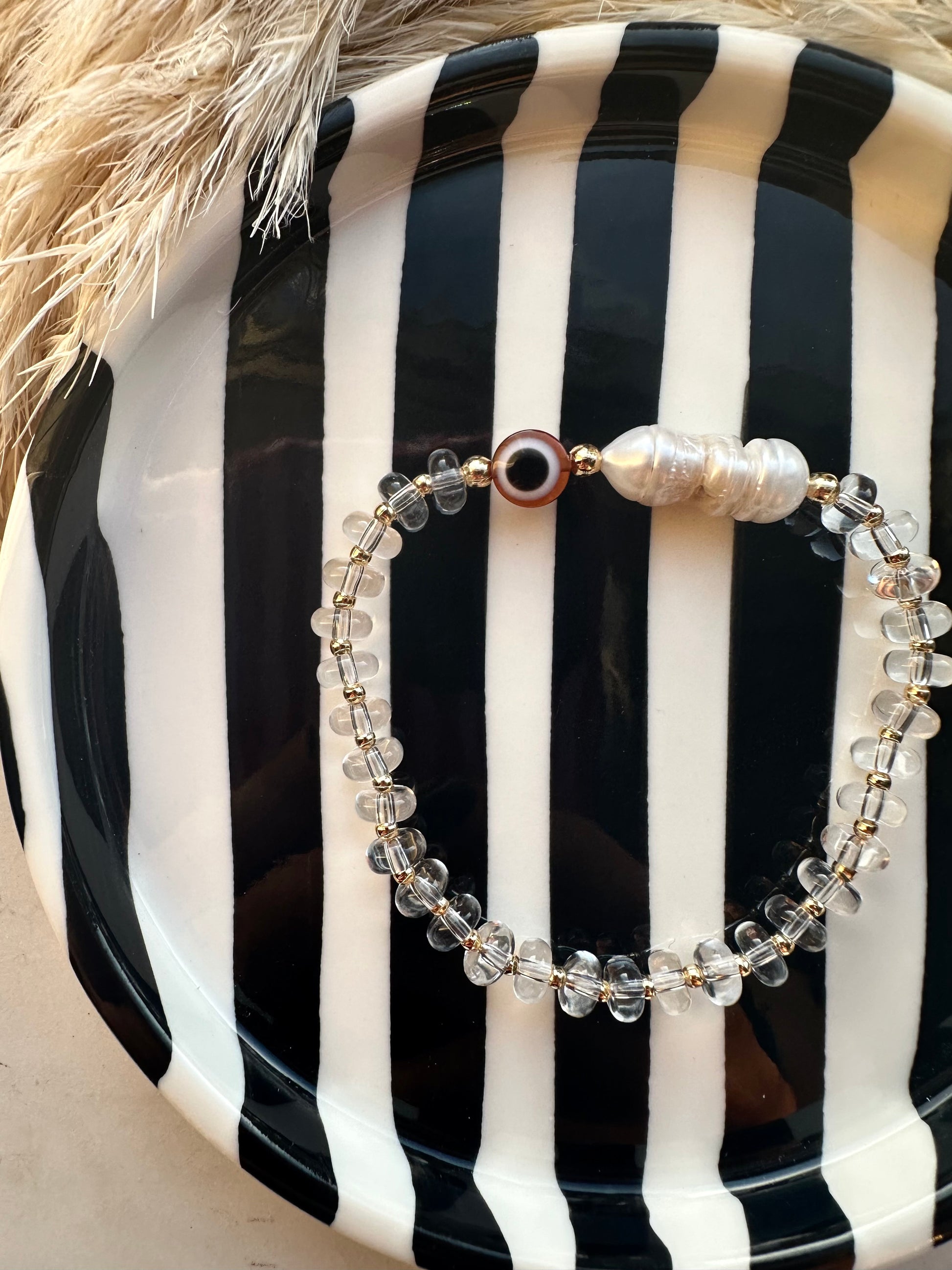 This one has it all. The elegance of a freshwater pearl, clarity of clear quartz and protection of the evil eye. The perfect addition to your autumn accessory stash.