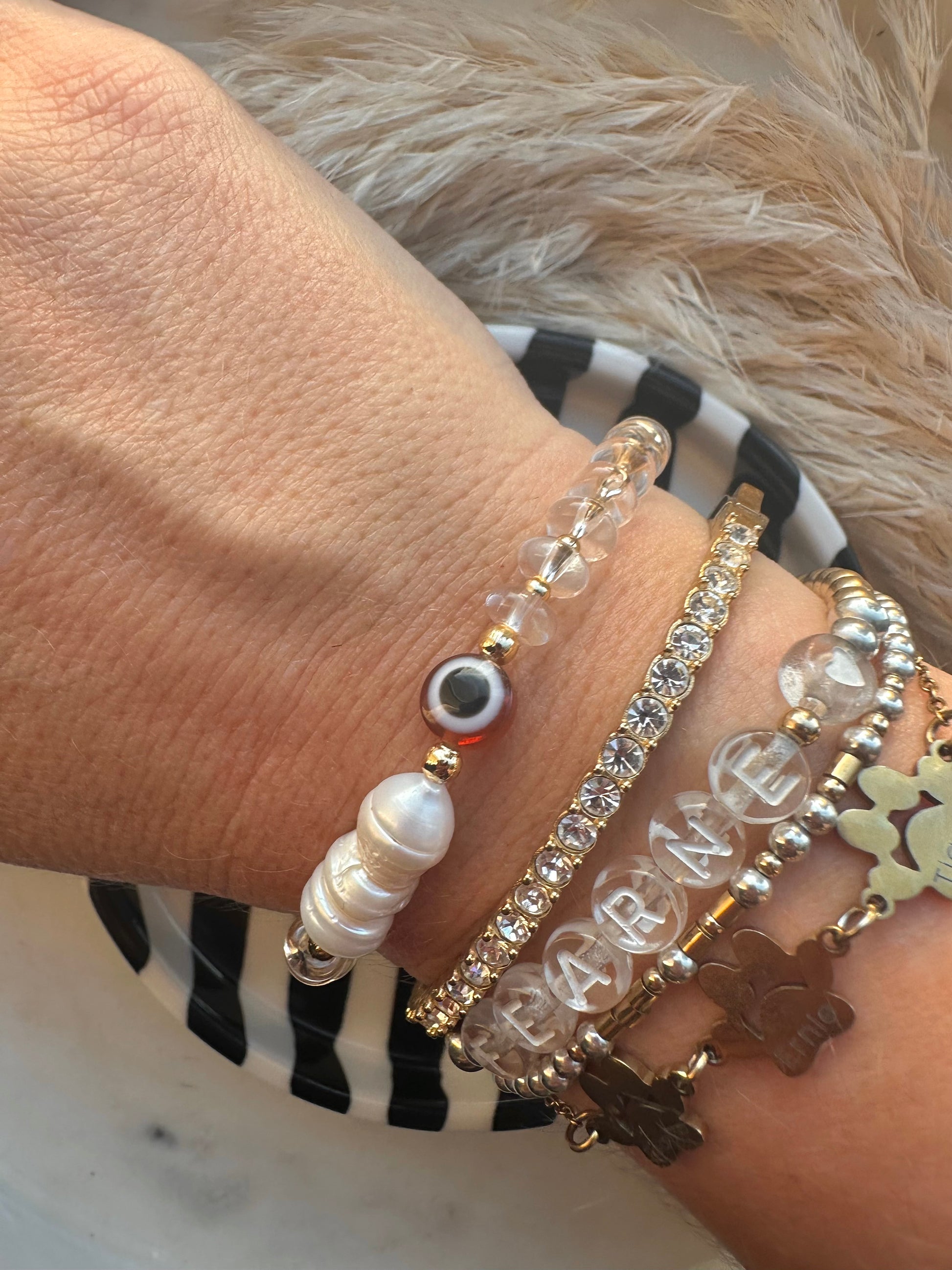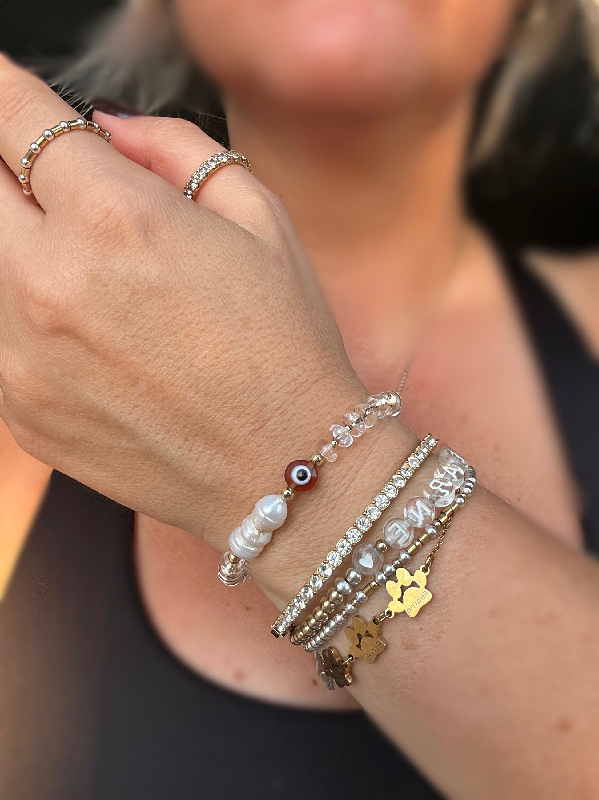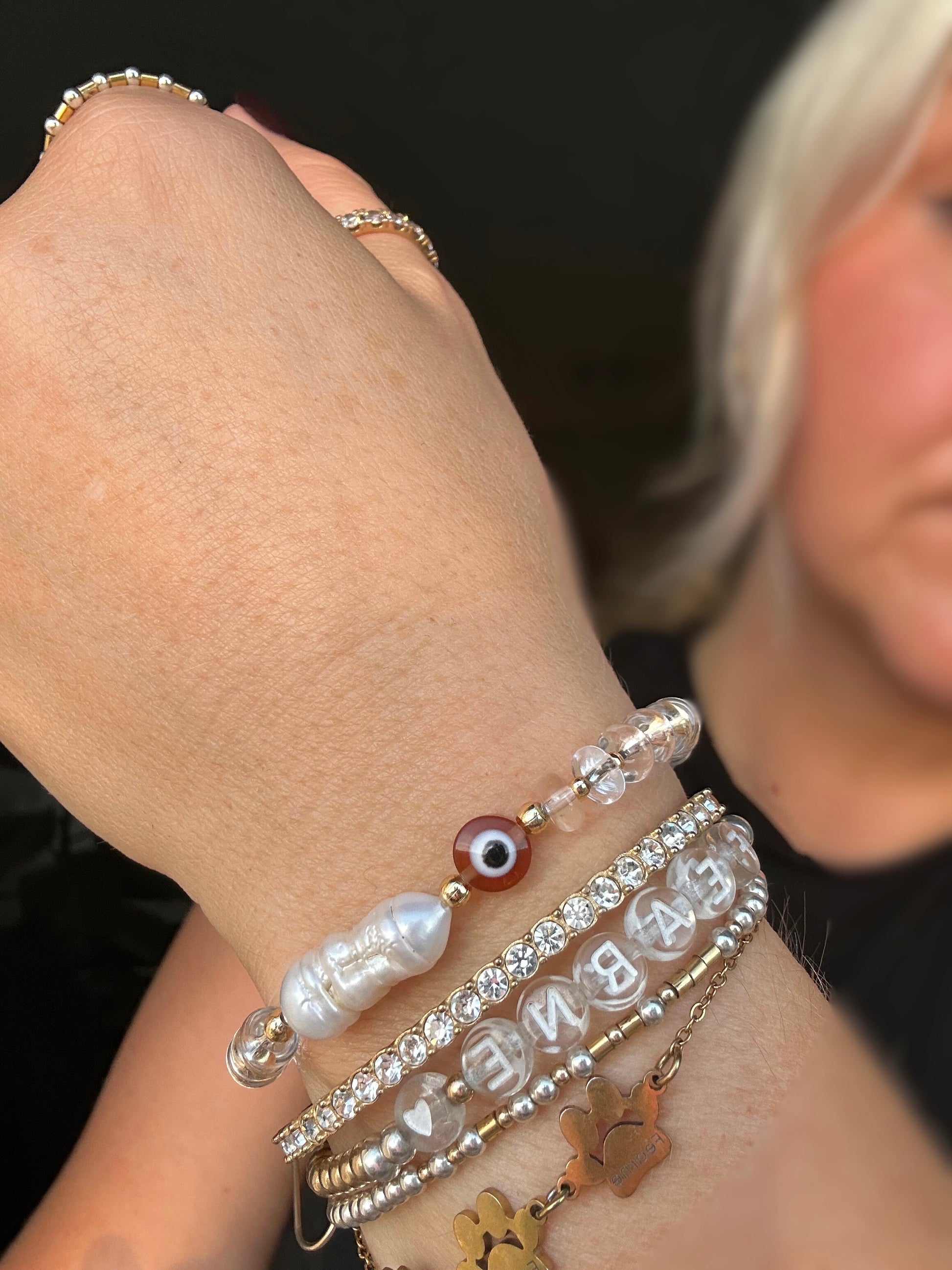 This one has it all. The elegance of a freshwater pearl, clarity of clear quartz and protection of the evil eye. The perfect addition to your autumn accessory stash.