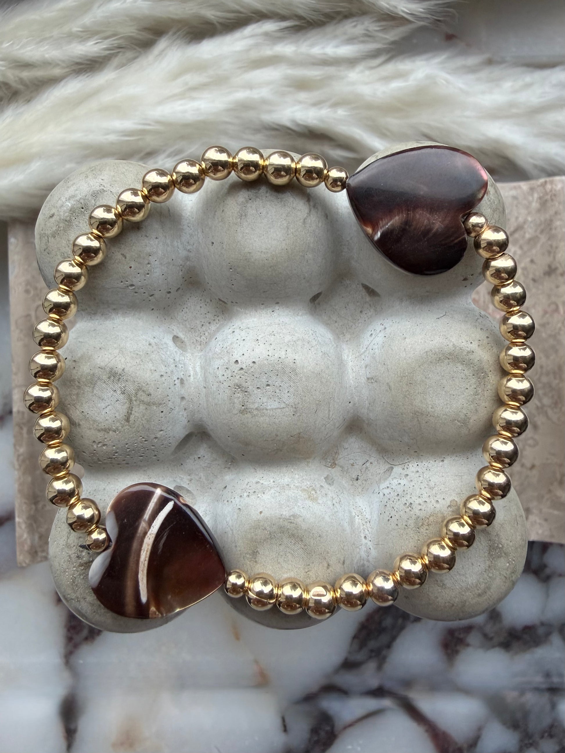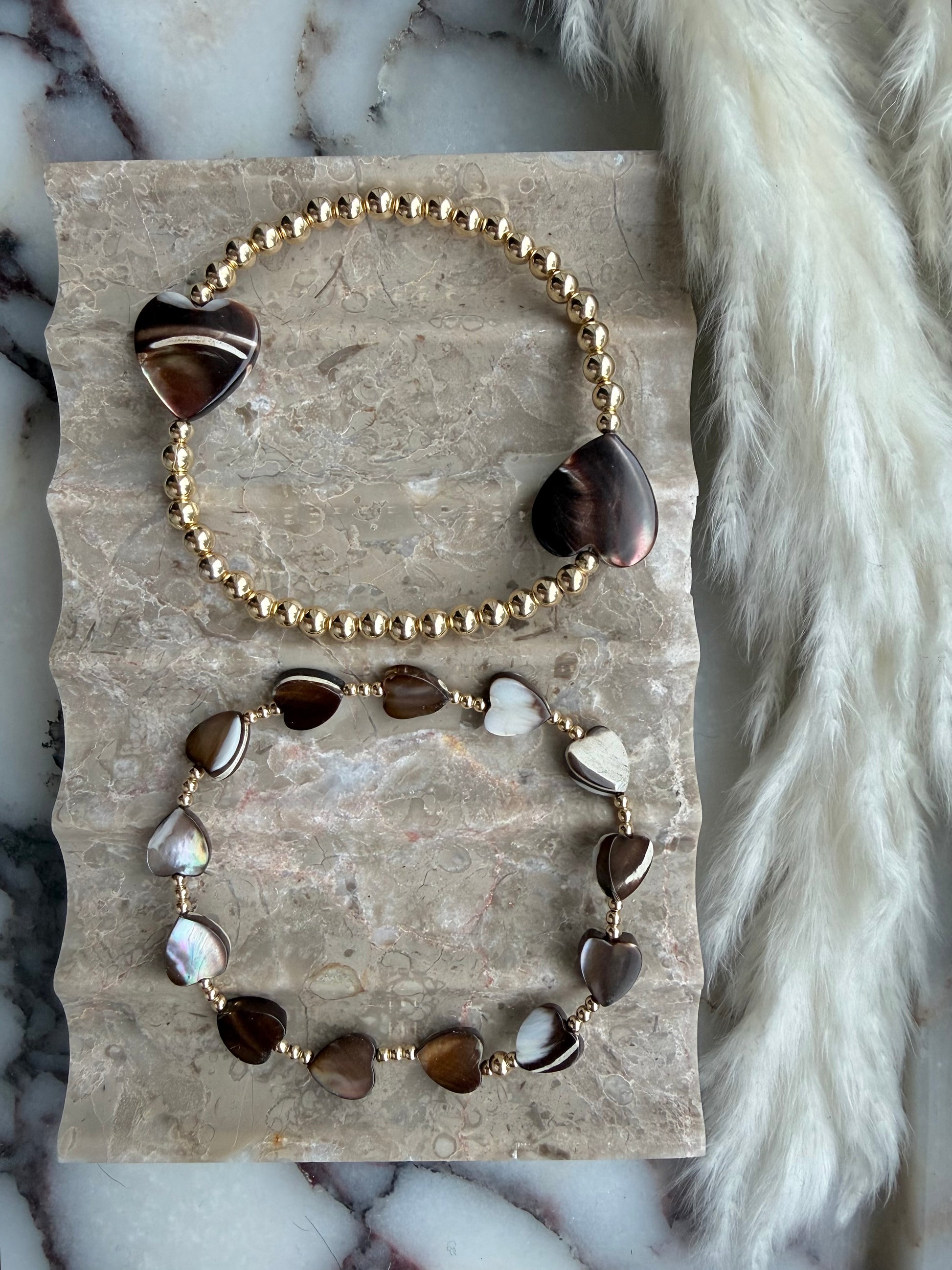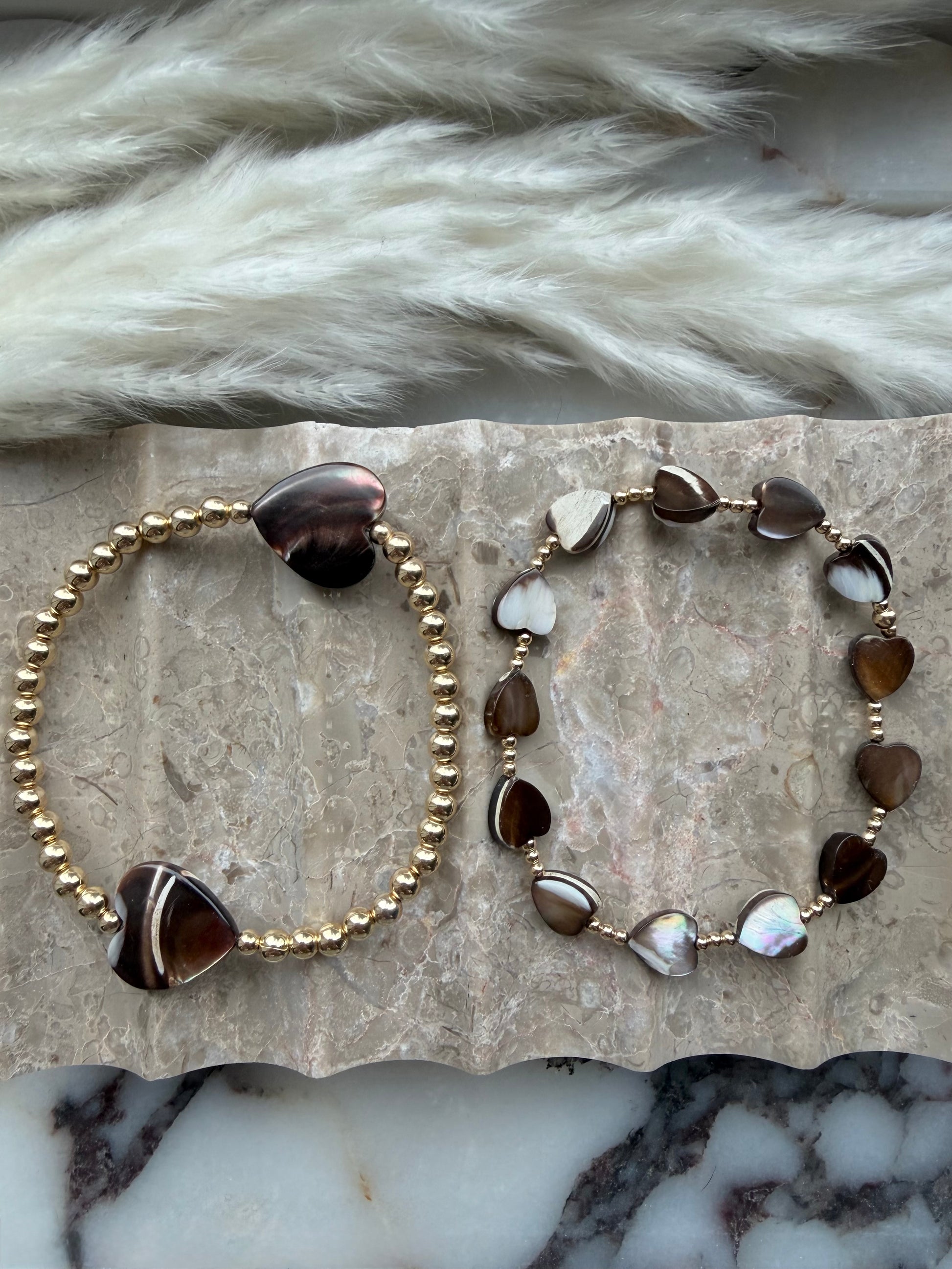 Coffee coloured mother of pearl heart beads strung to make these chic pieces.