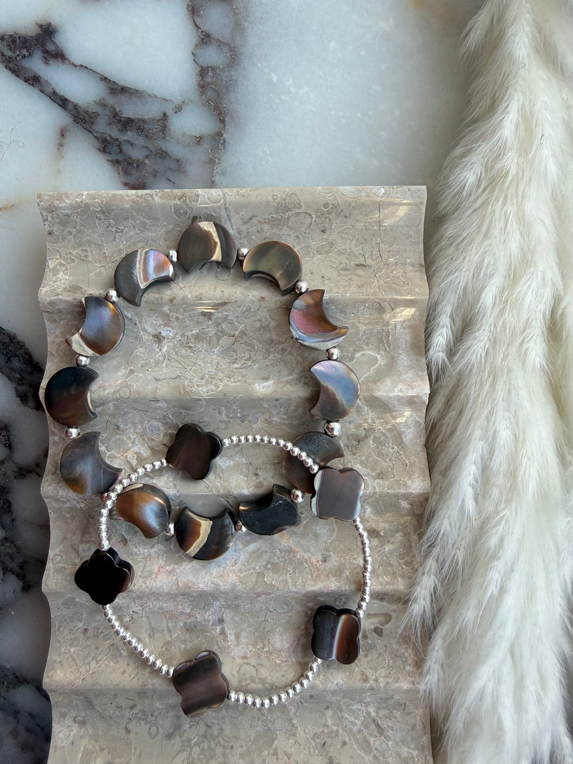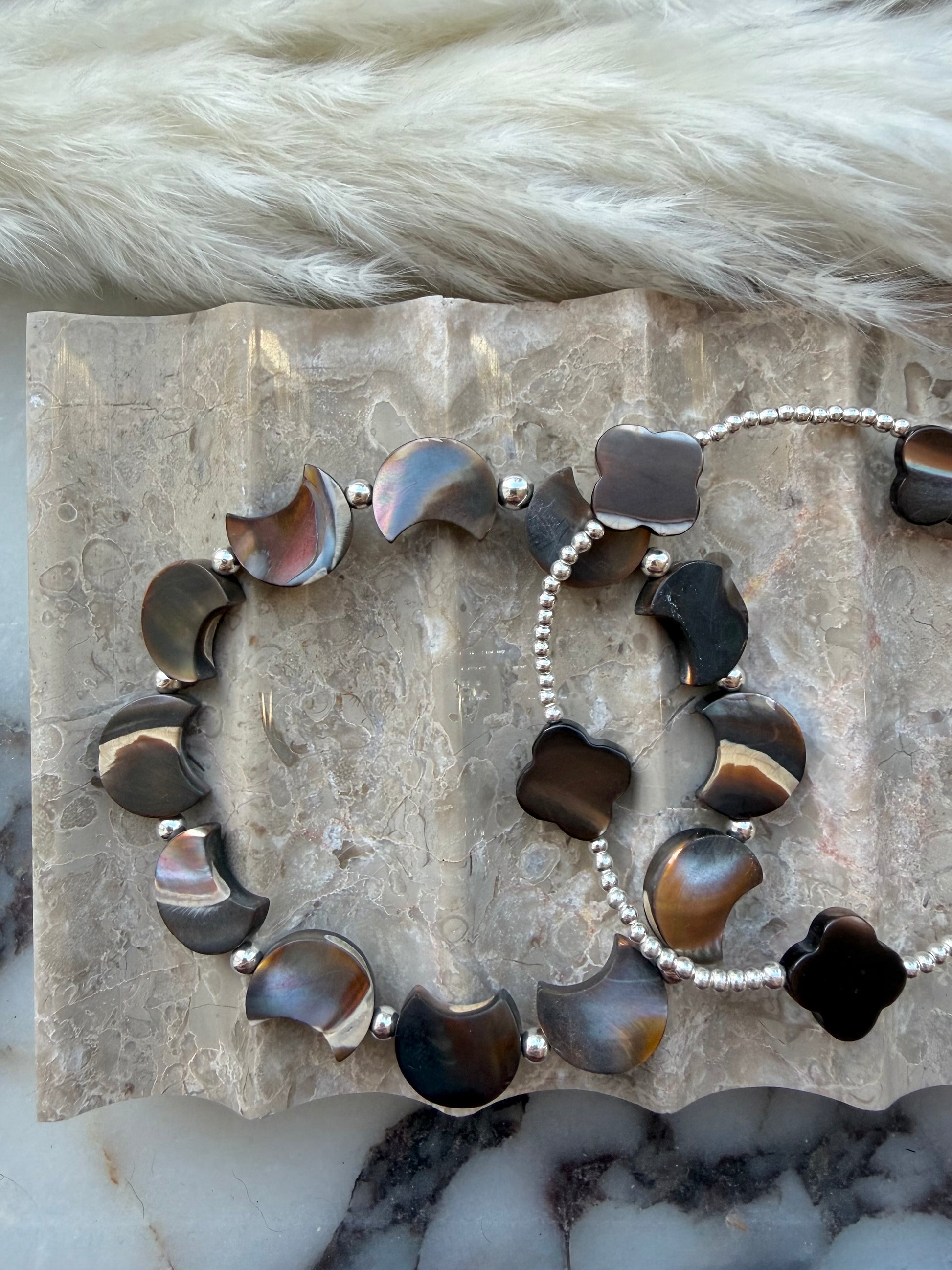 Dreamy coffee mother of pearl crescent moon or clover beads paired with your choice of sterling silver or gold filled accents