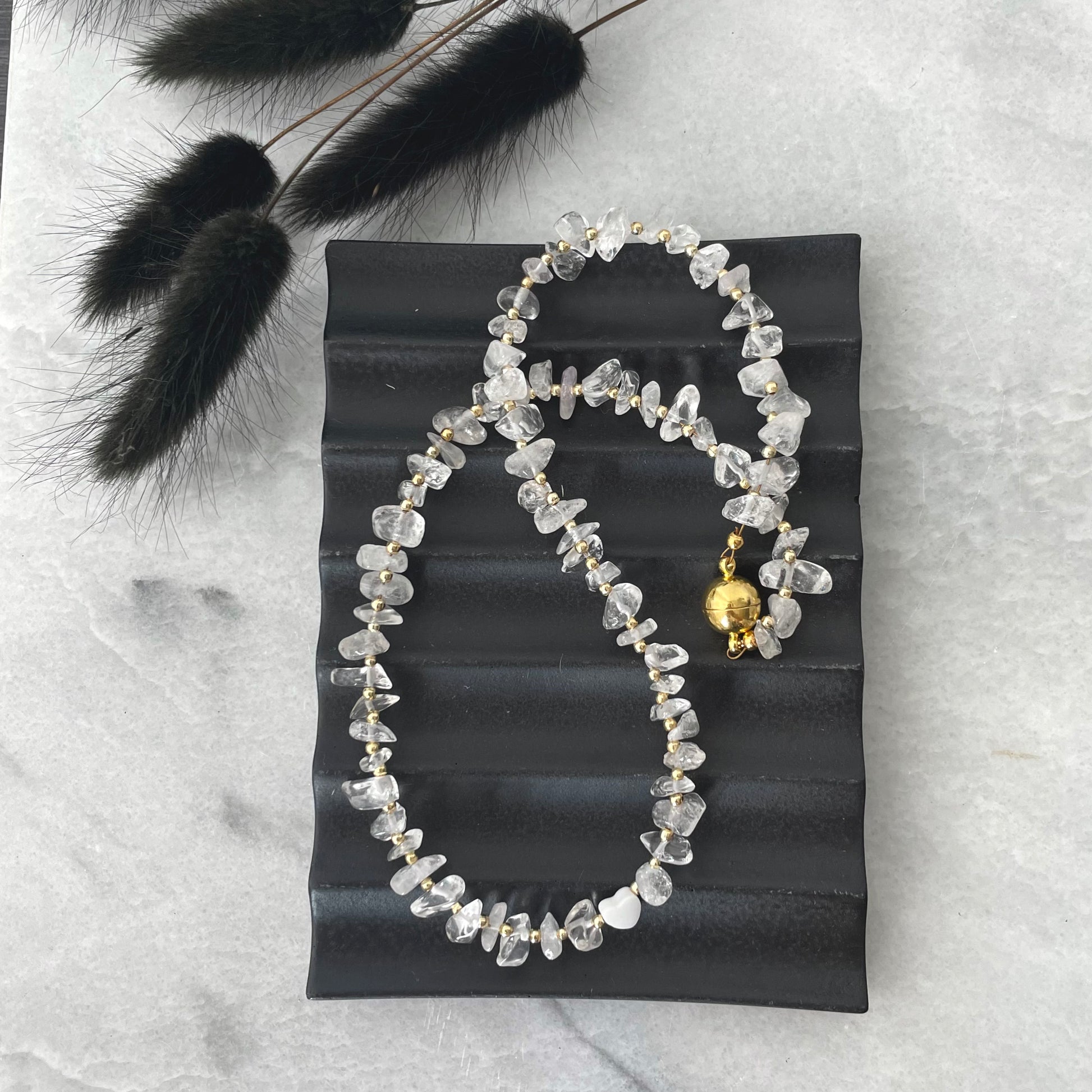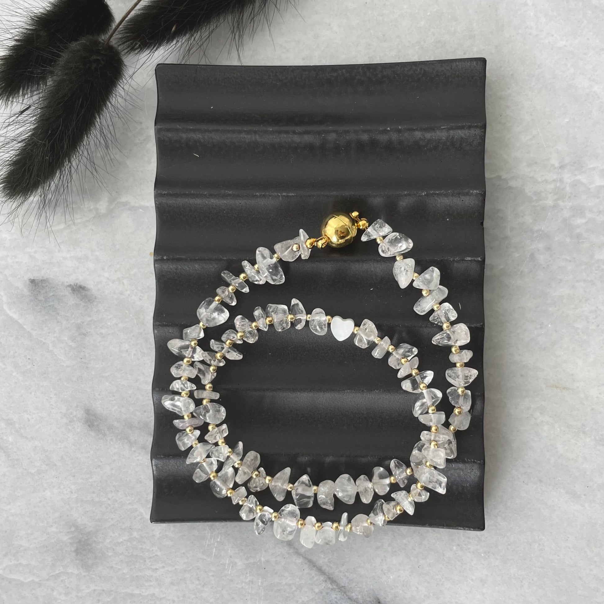 Crystal Quartz & Pearl heart choker with your choice of gold or silver plated accents plus a magnetic clasp fastening…no more fiddling to do your necklaces up!