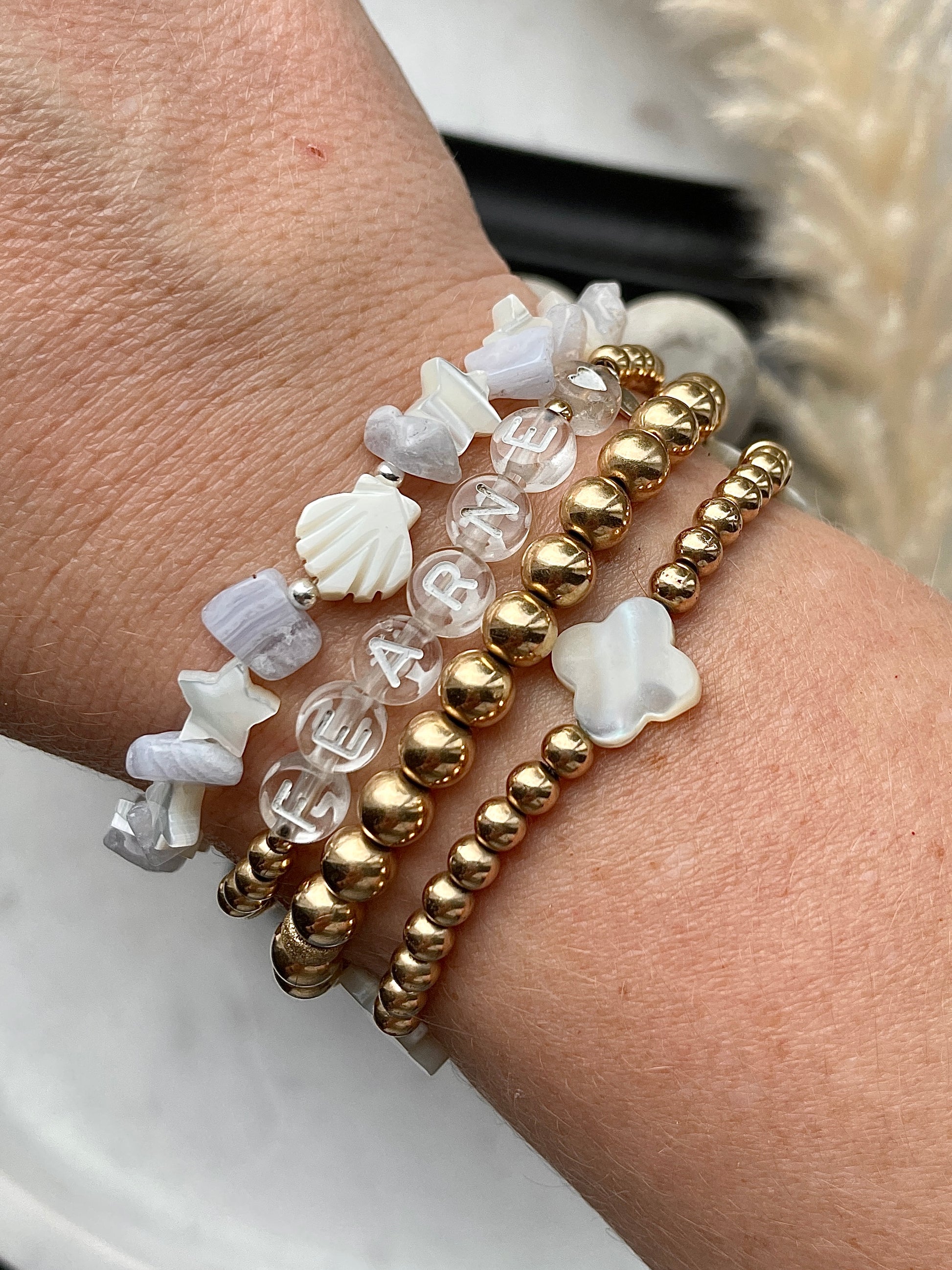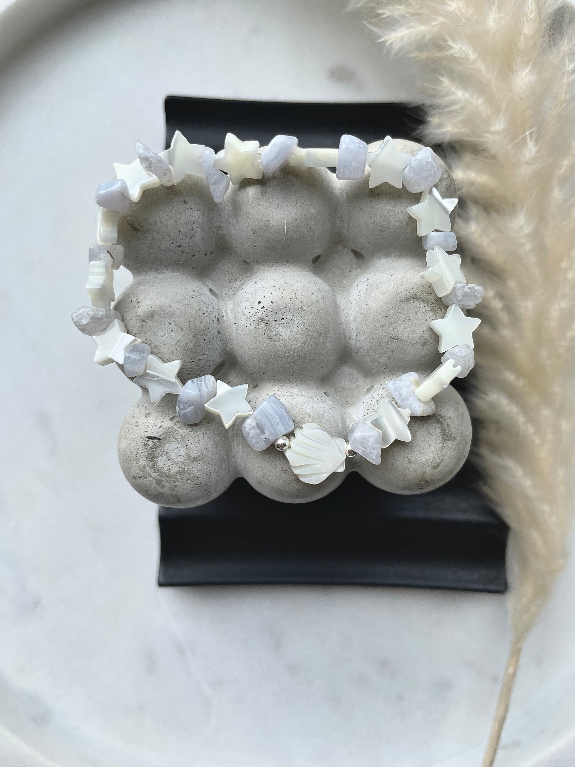 Blue lace agate paired with mother of pearl stars & shell with sterling silver or gold filled accents.