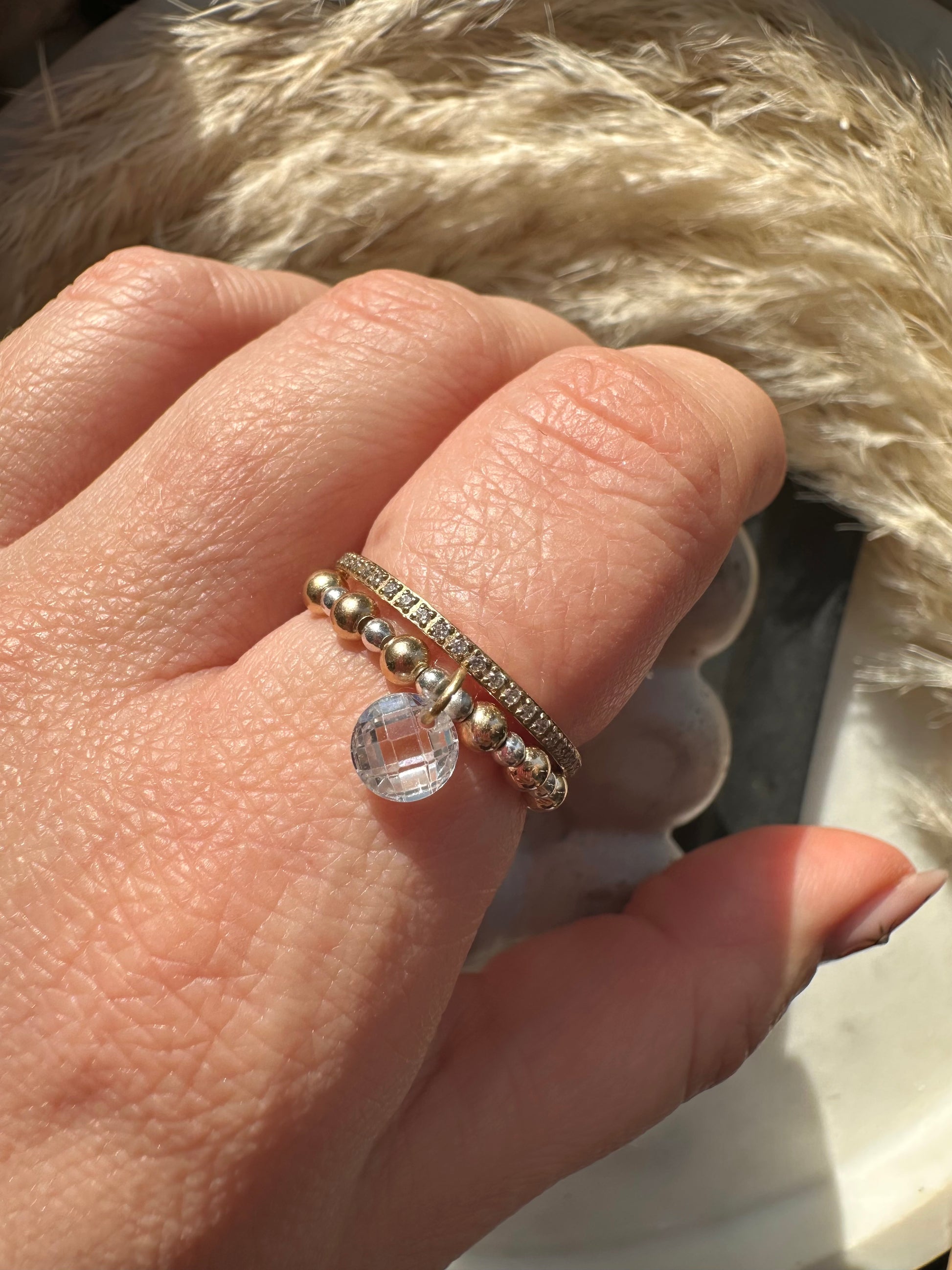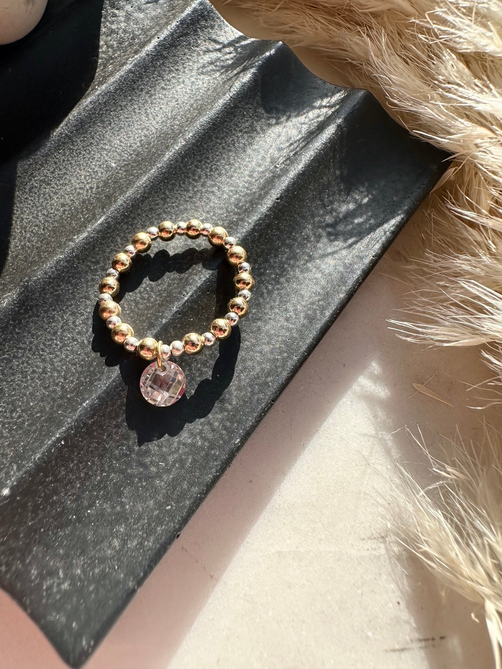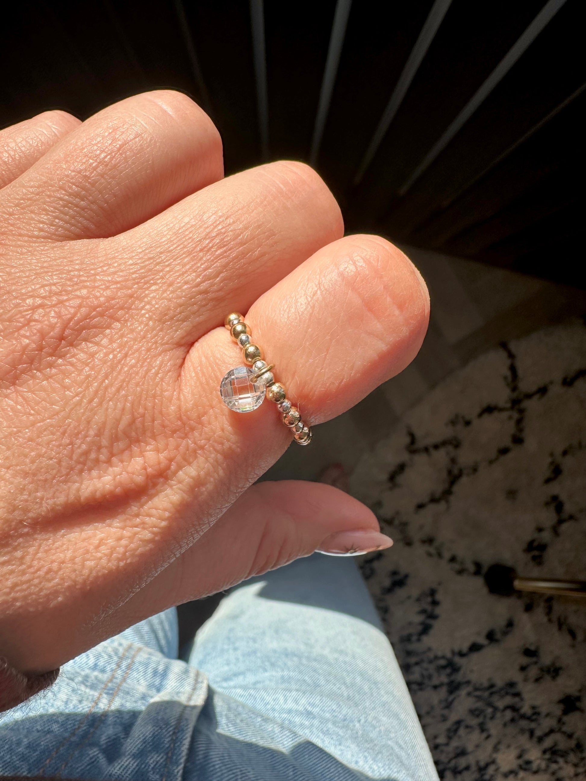 3mm & 2mm mixed sized gold filled & sterling silver beads strung with this cubic zirconia charm to make the cutest ring. Perfect for wearing along or stacking with others.