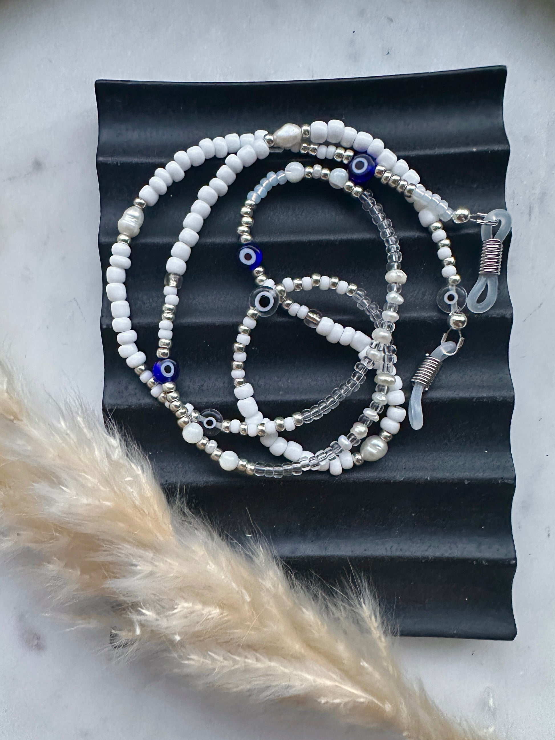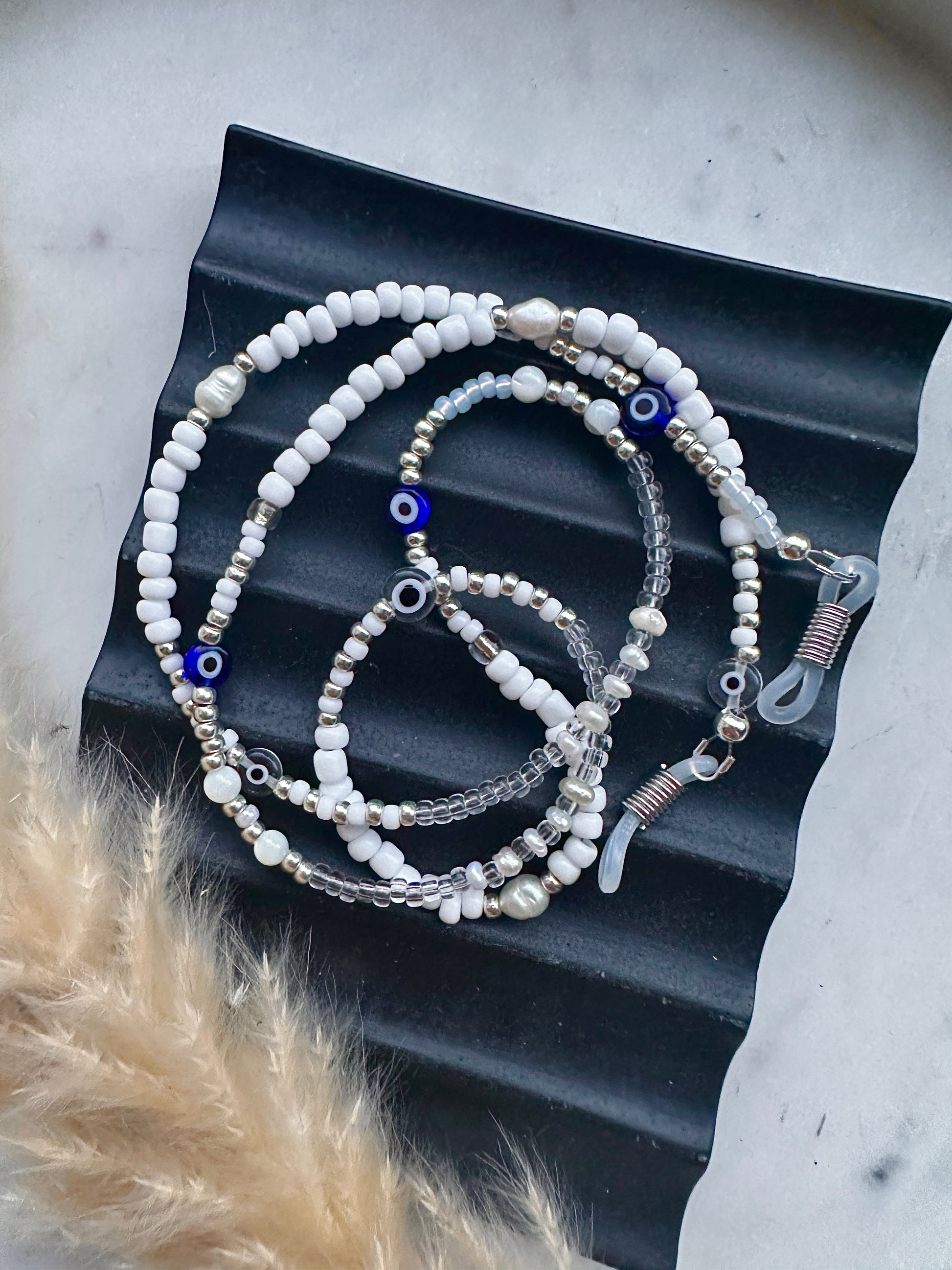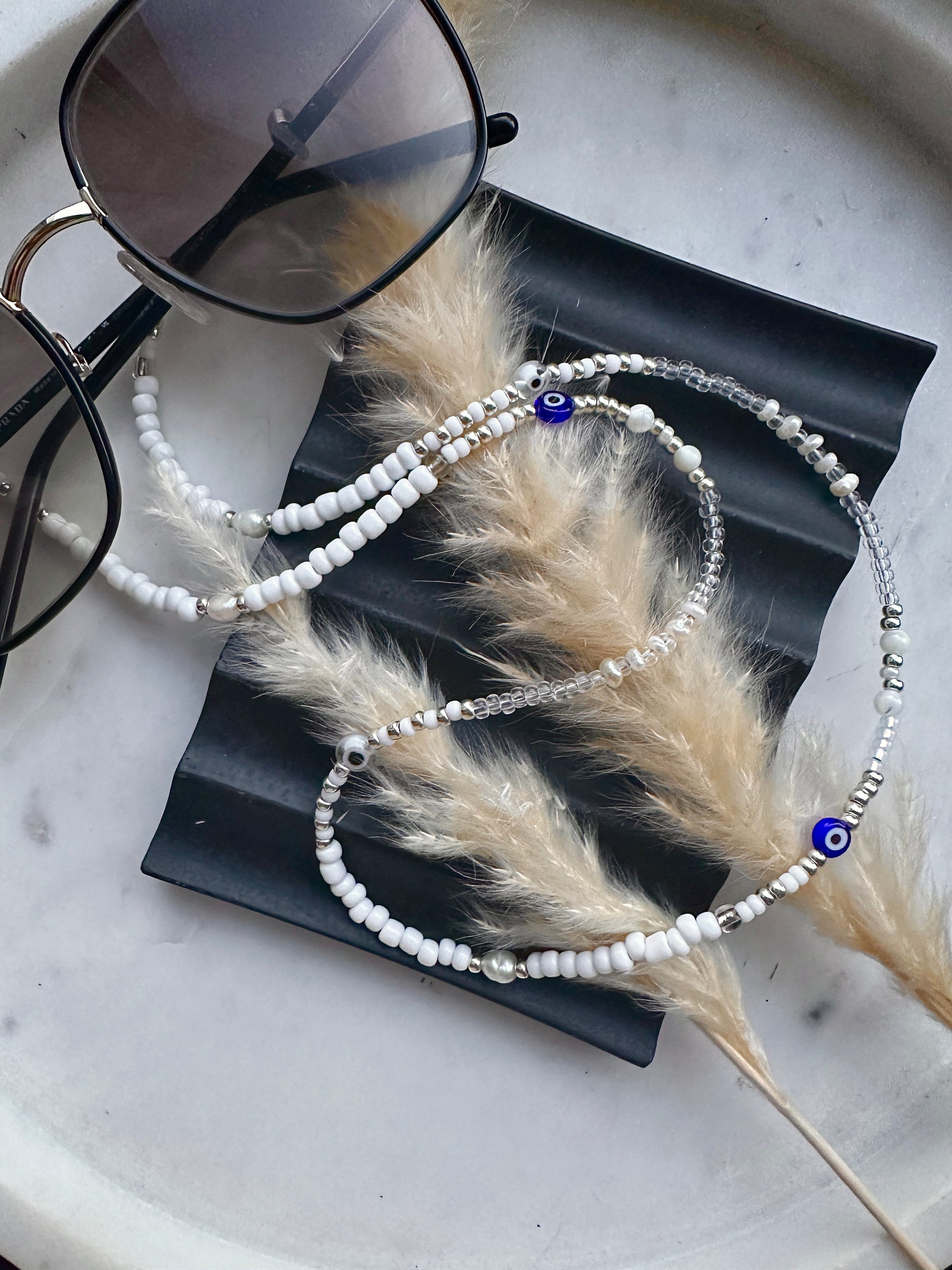 A stunning mix of evil eyes, glass seed beads and pearls with your choice of gold or silver accents, all strung together on this gorgeous sunglasses chain.
