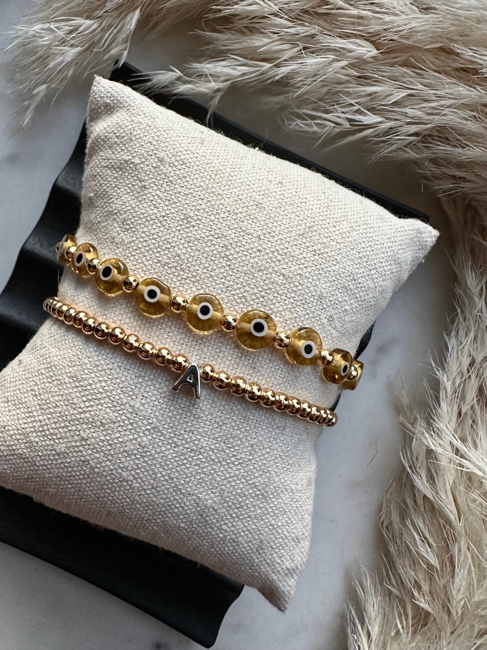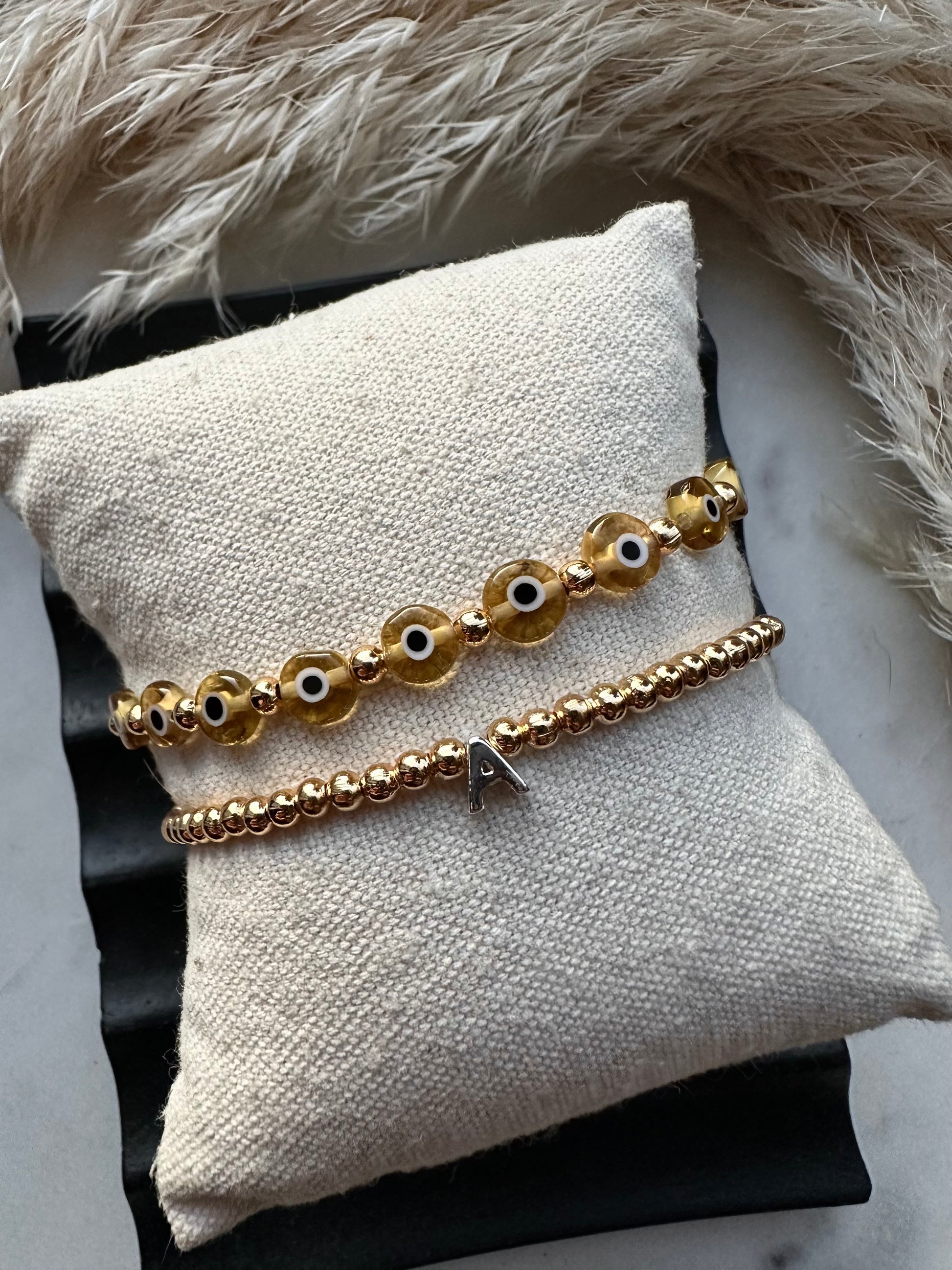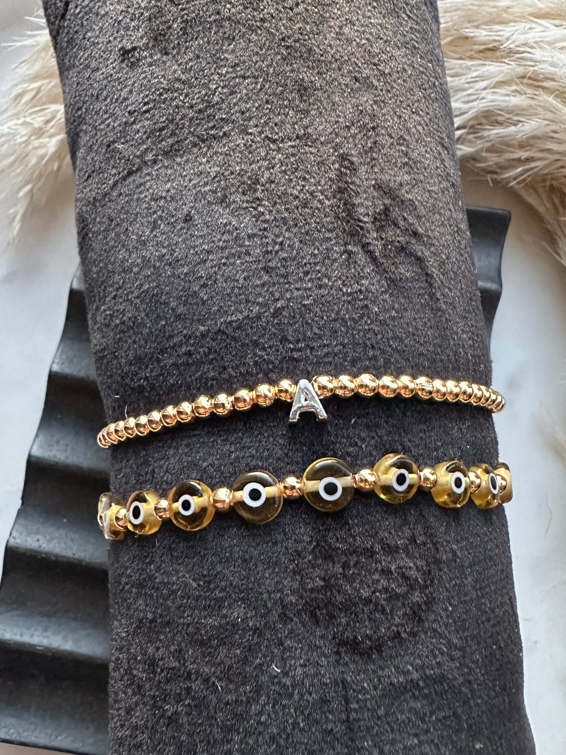 6mm glass evil eye beads with silver or gold plated accent beads, and this delicate 3mm beaded initial bracelet, again with silver or gold plated beads and a sterling silver initial of your choice.