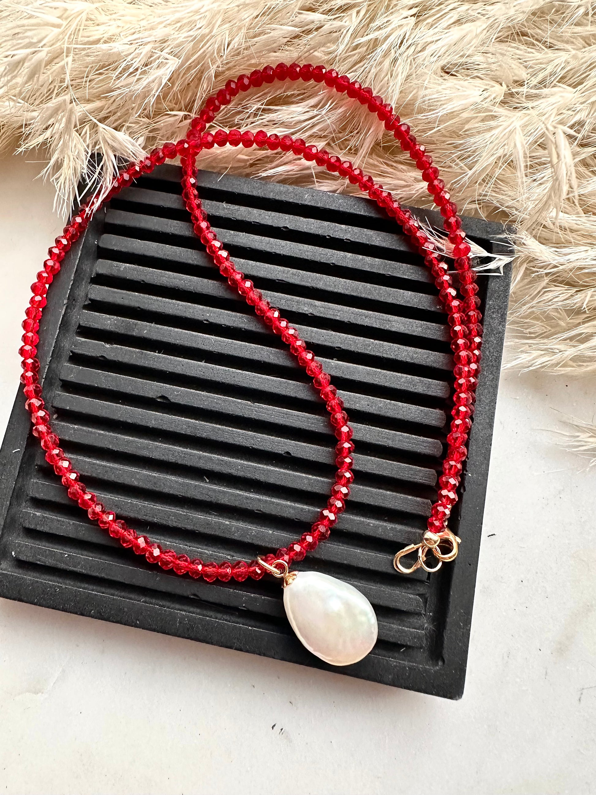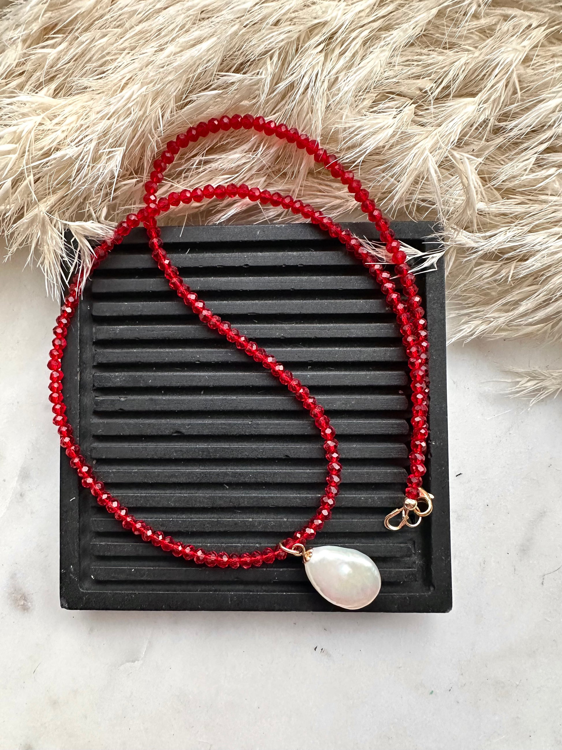 A freshwater drop pearl strung on red glass faceted beads…stunning.