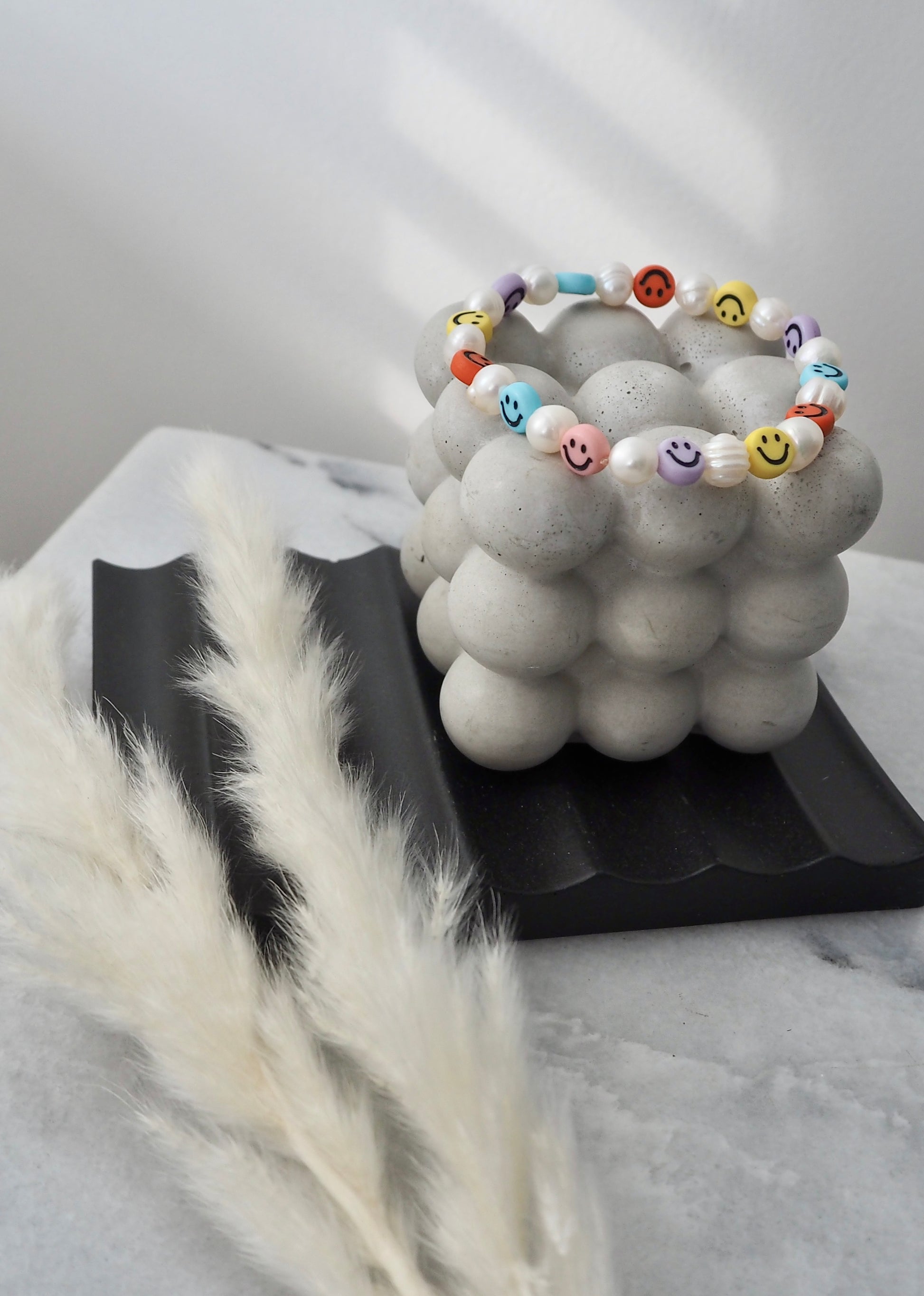 Freshwater pearls mixed with multicoloured plastic smiley beads - you can’t not smile at this one!