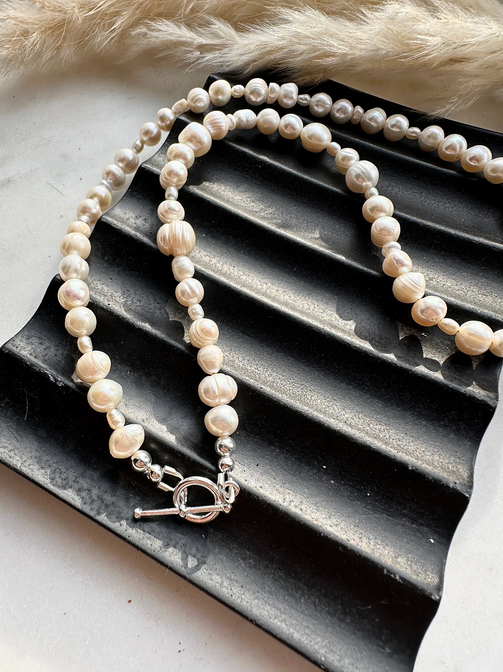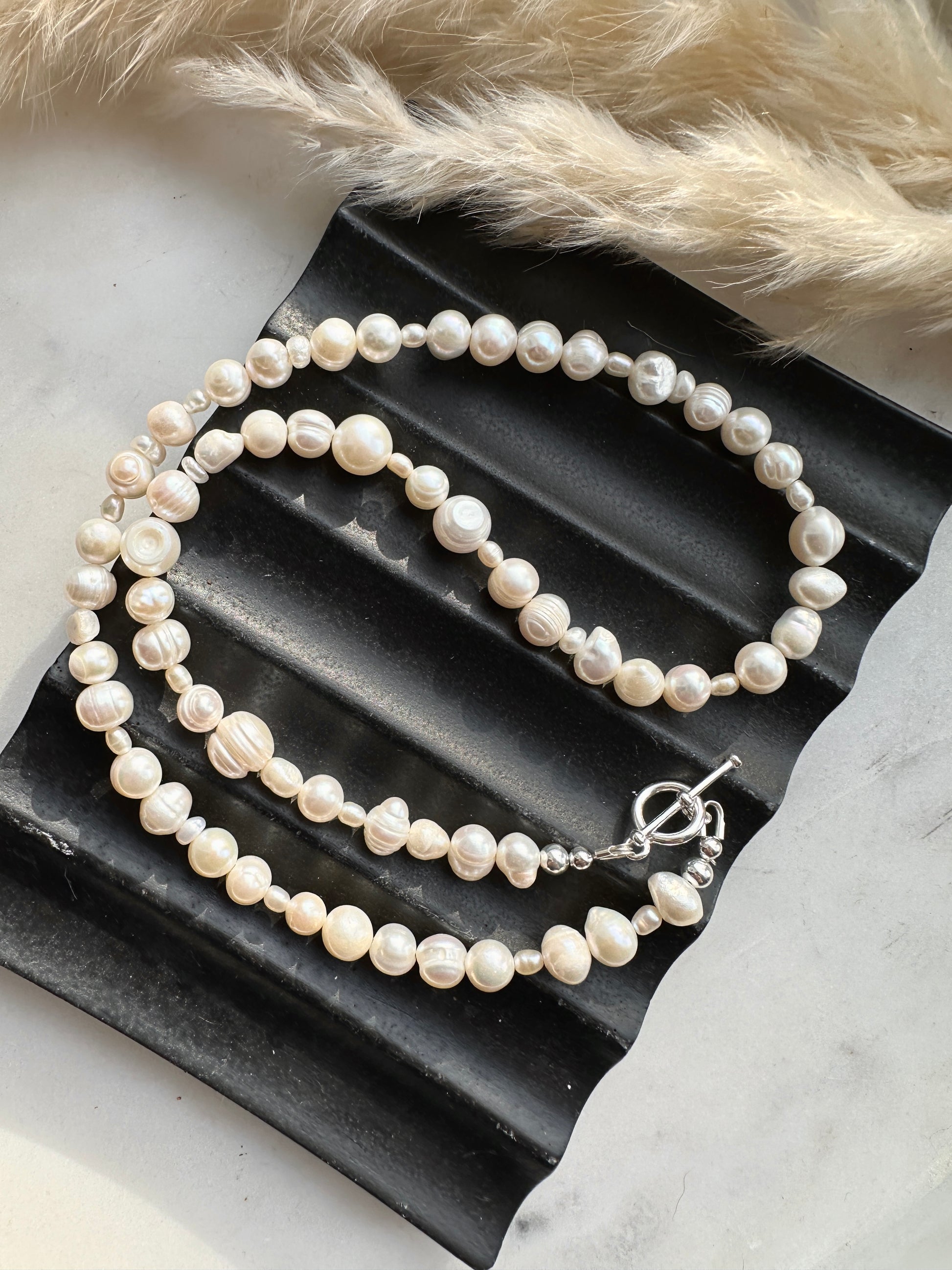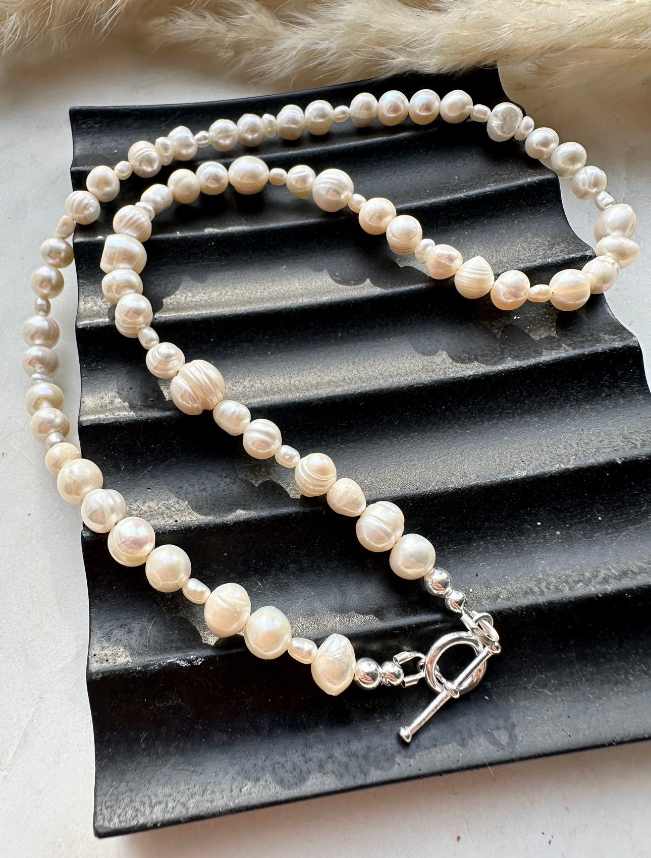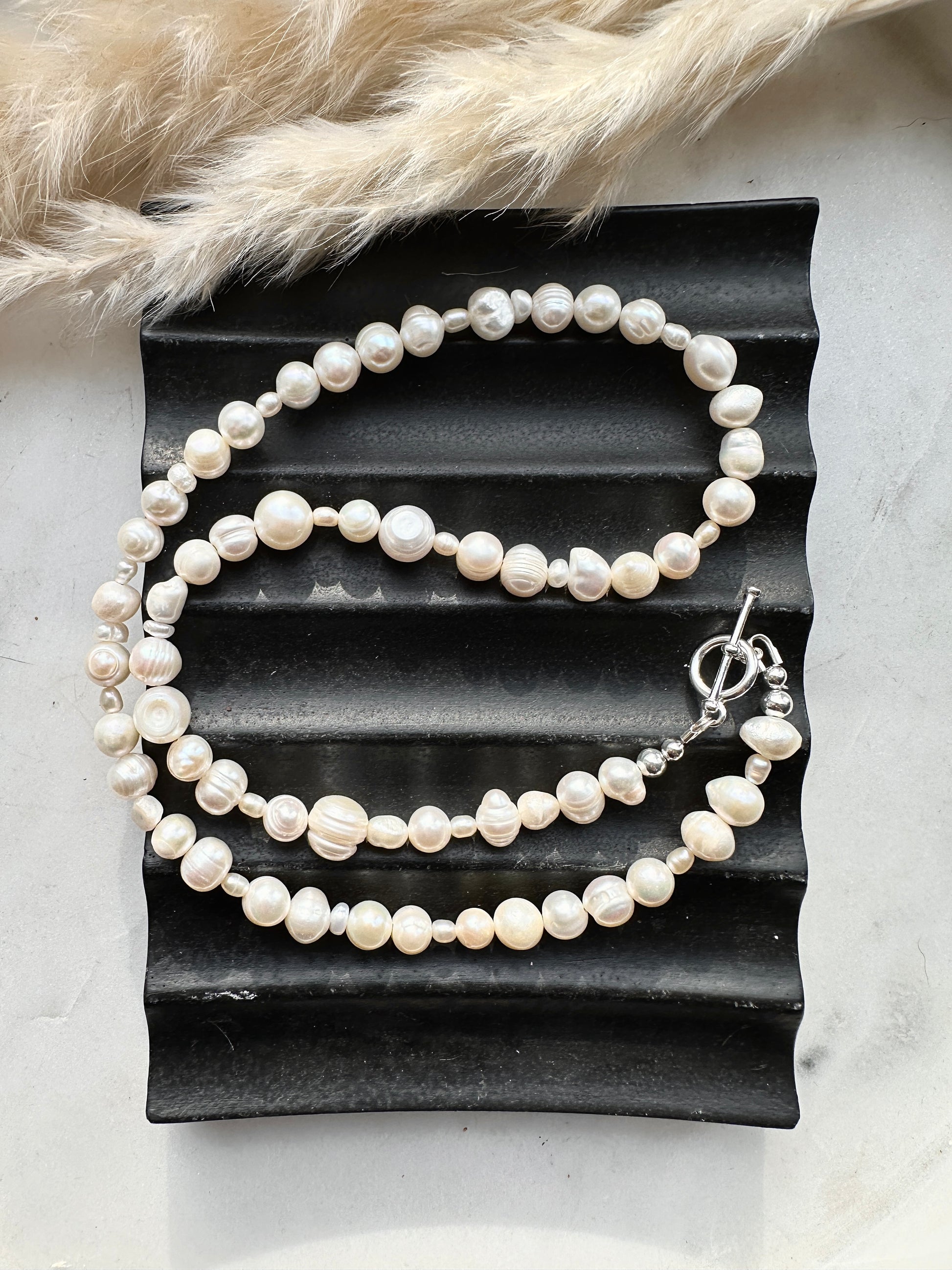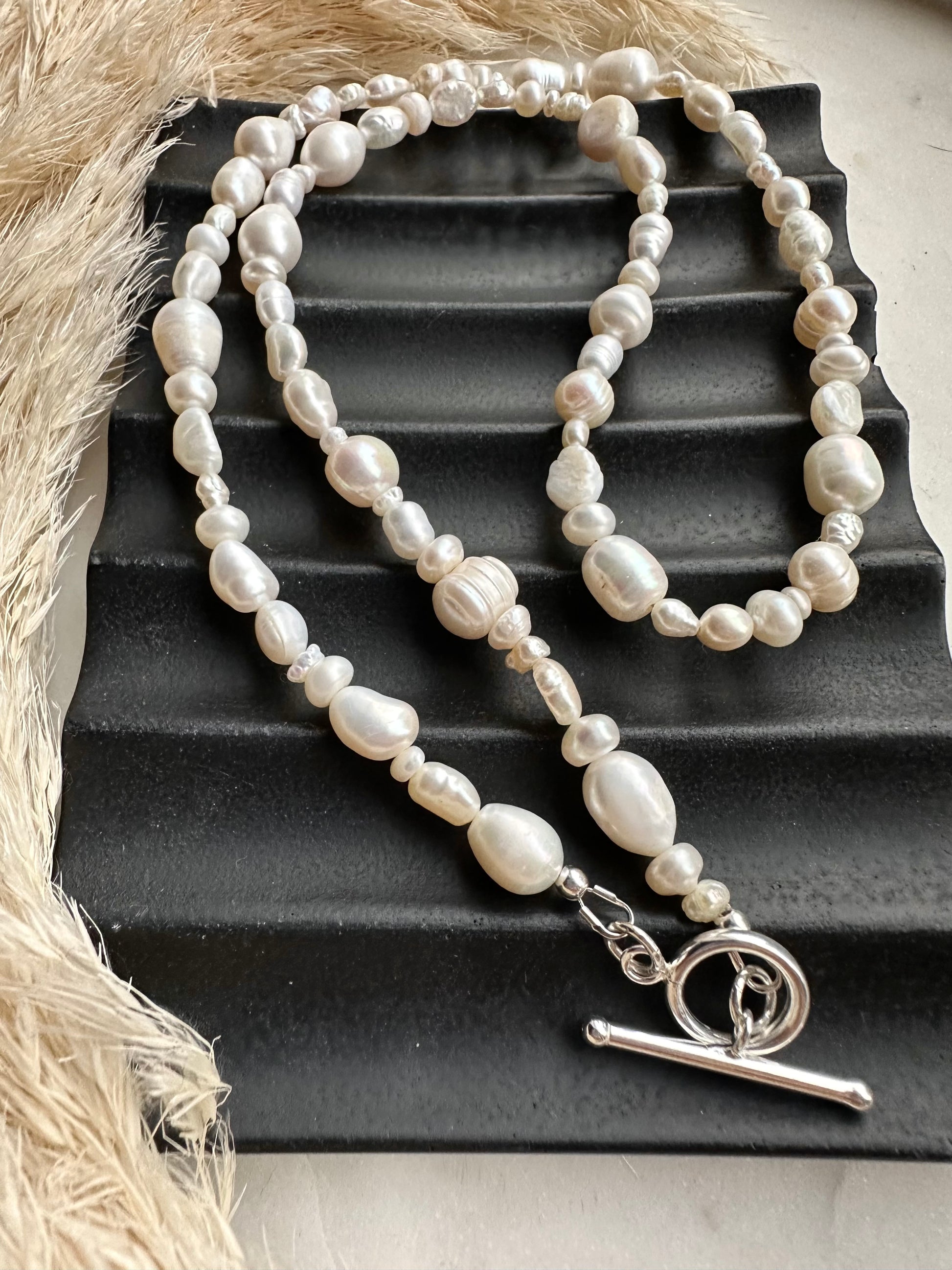 Freshwater pearl mix with a sterling silver toggle clasp. Every piece varies in design due to the nature of the freshwater pearls used but each as gorgeous as each other!