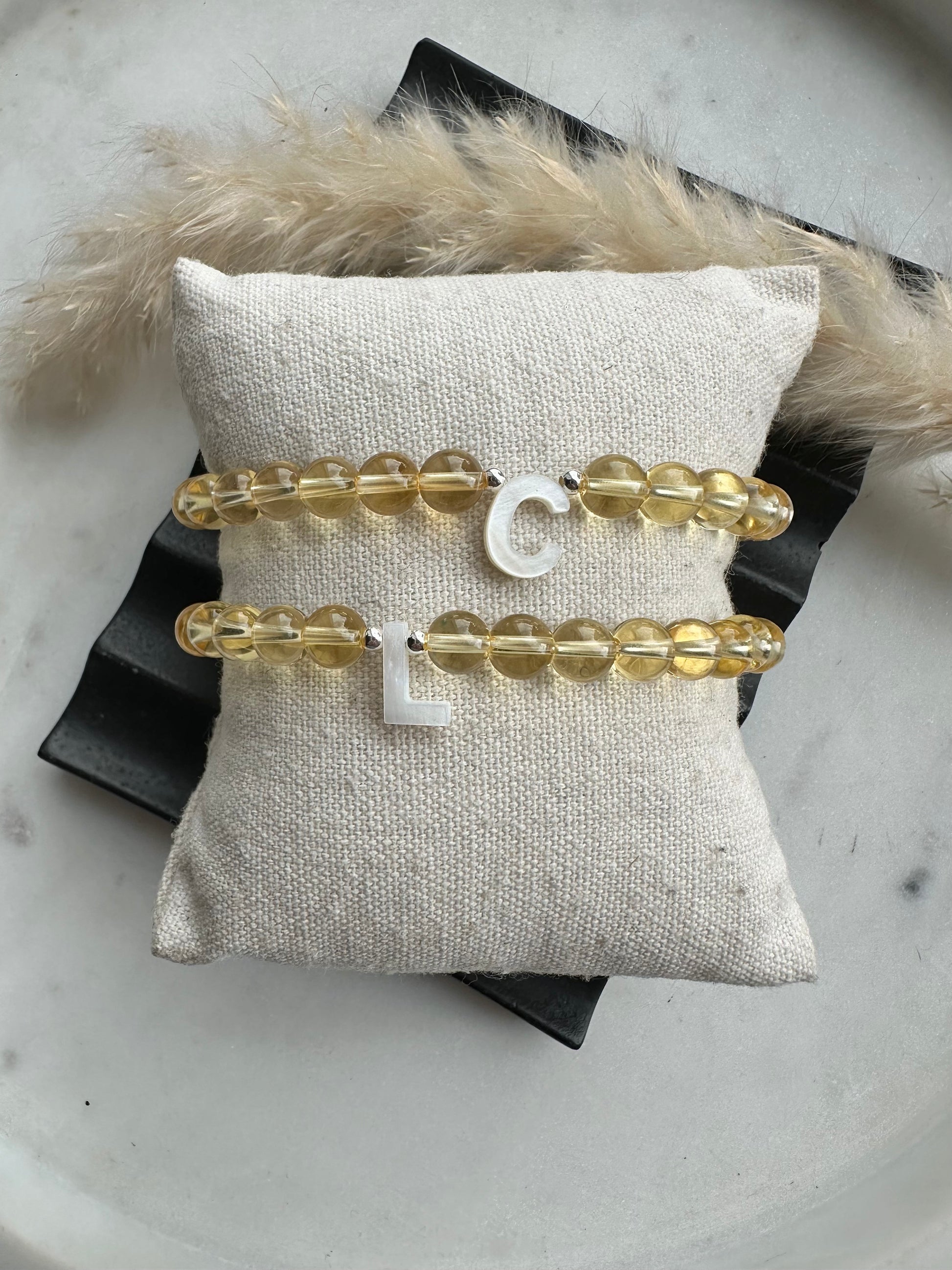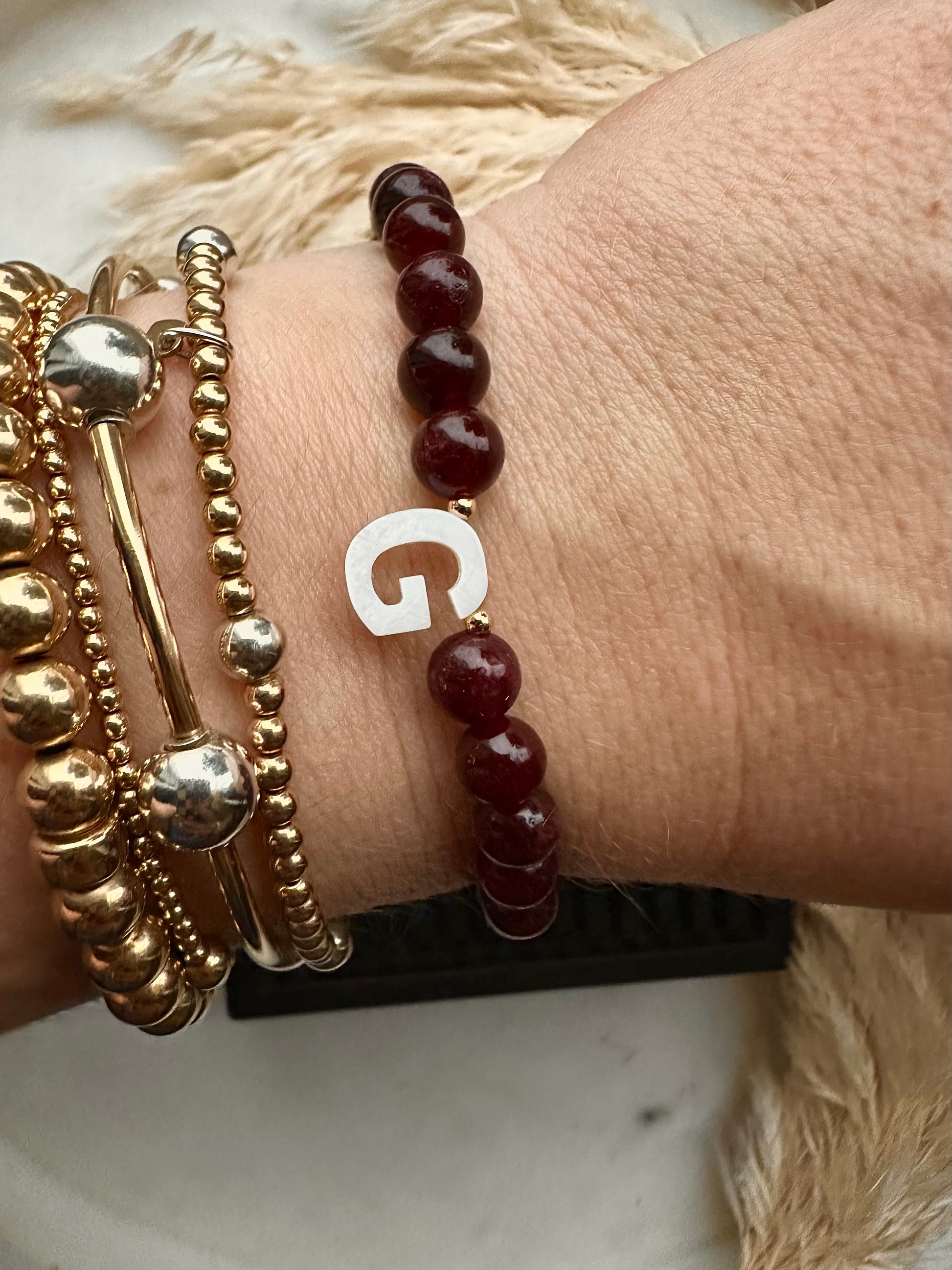 6mm beaded gemstone bracelets with gold filled or sterling silver accents and your choice of mother of pearl initial.