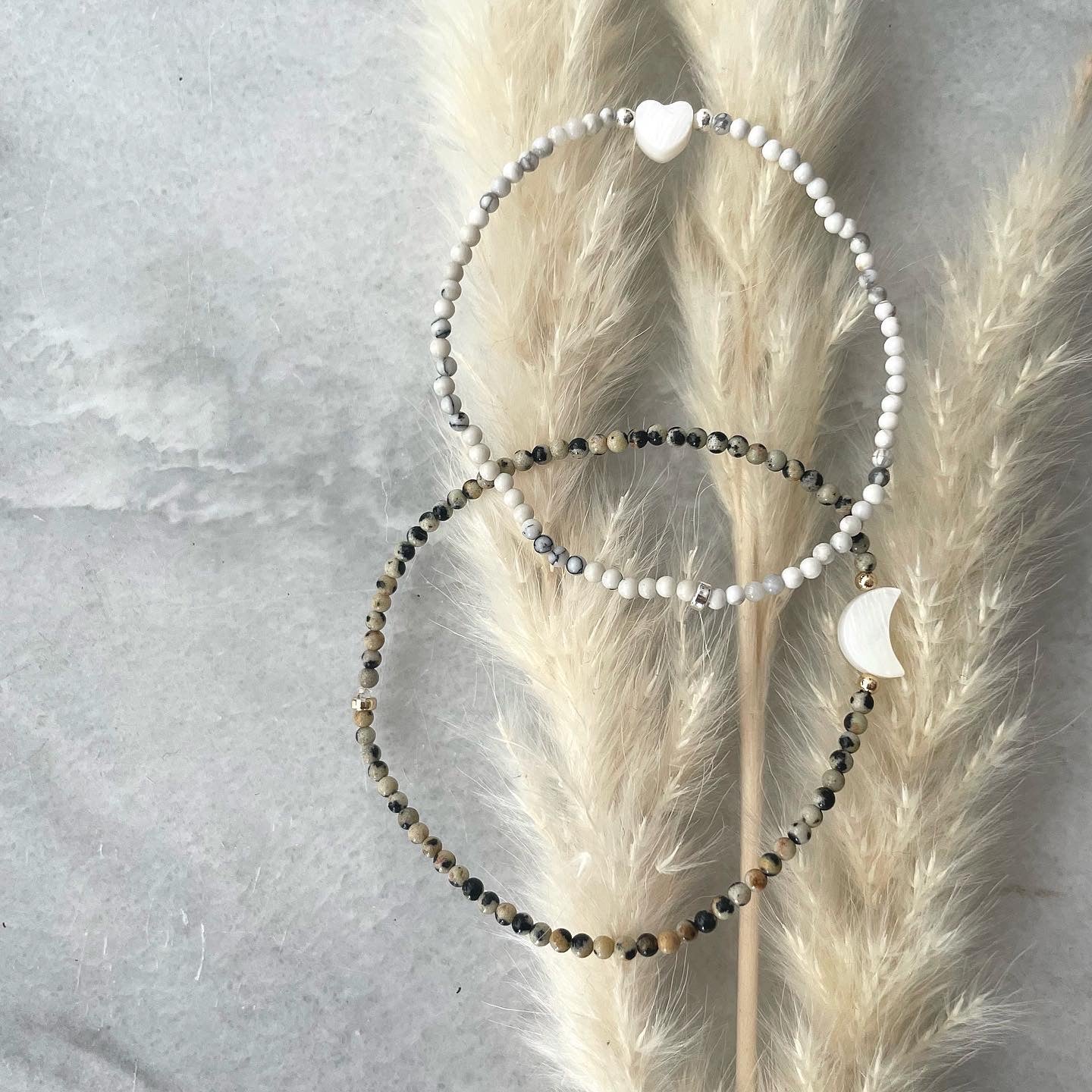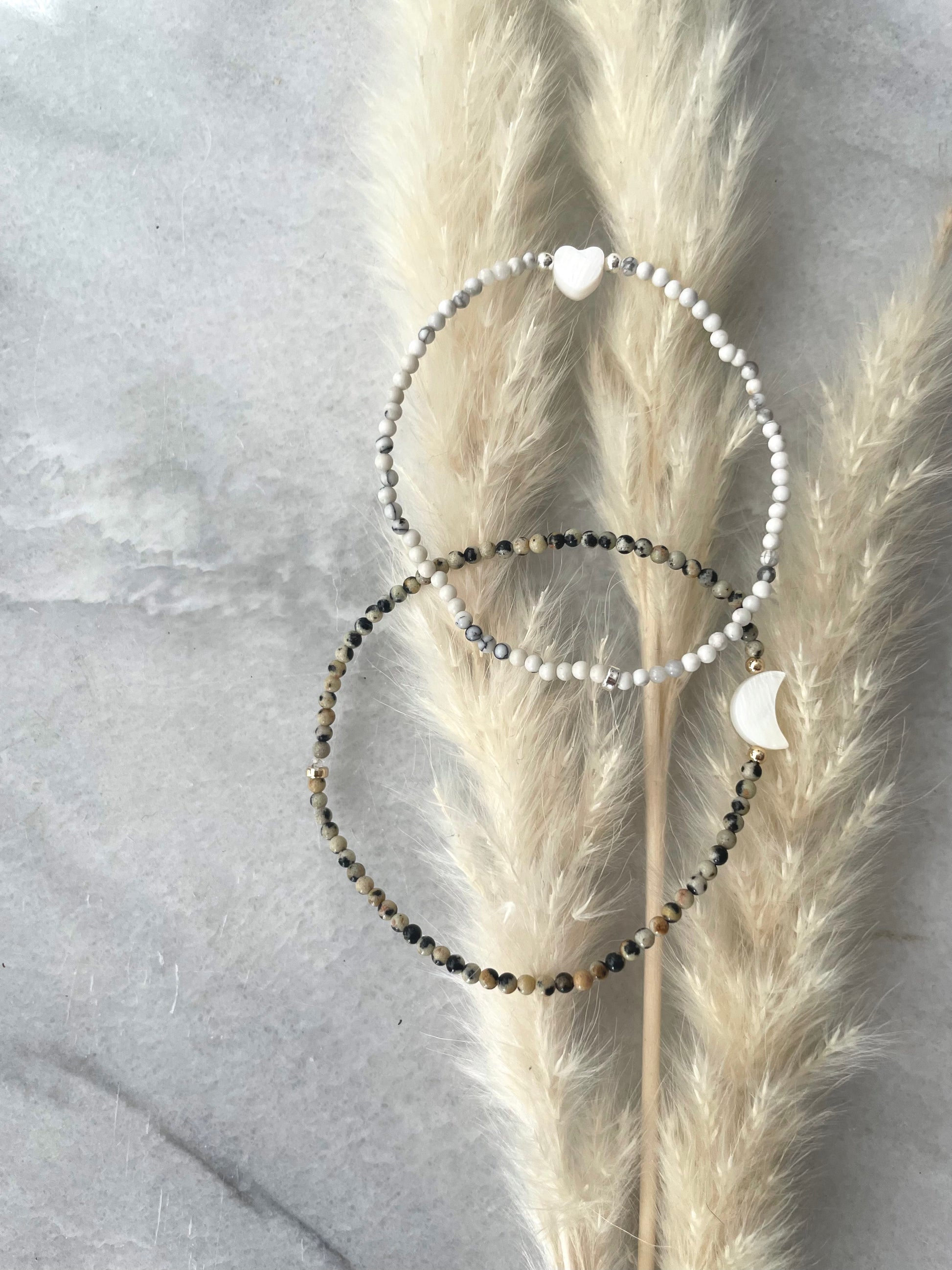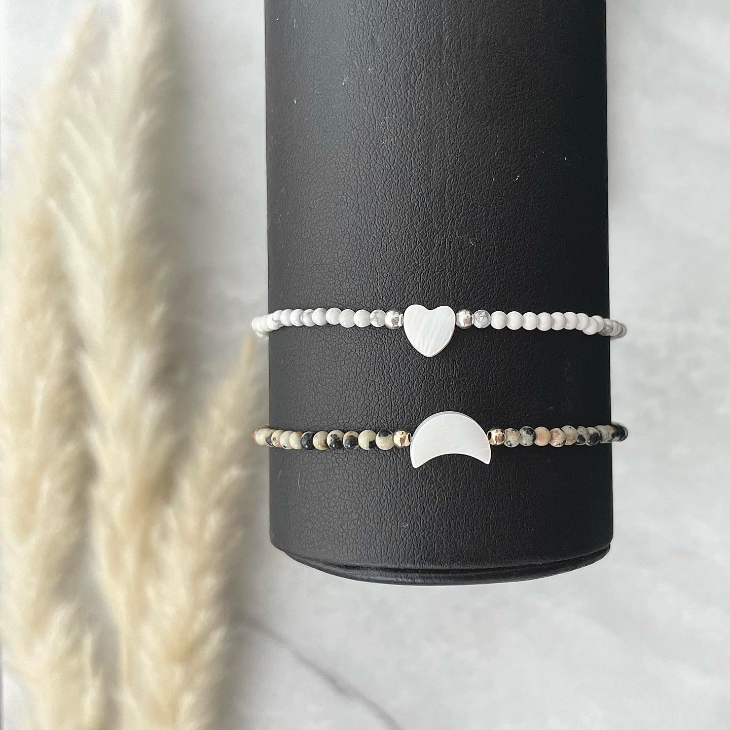 Choose from 2mm Howlite (grey) or Dalmatian Jasper beads with sterling silver or gold filled accent beads and Mother of Pearl heart or moon beads.