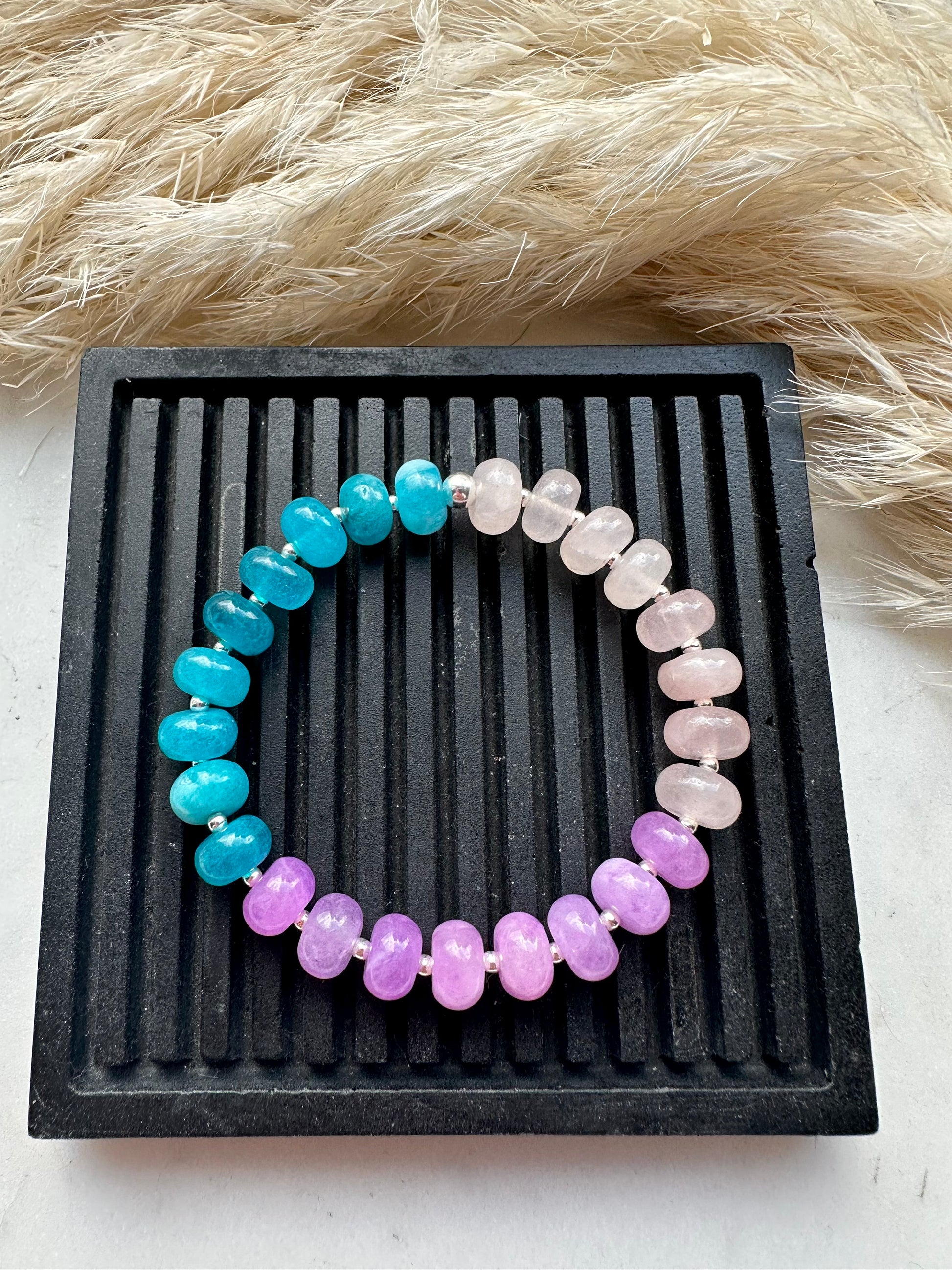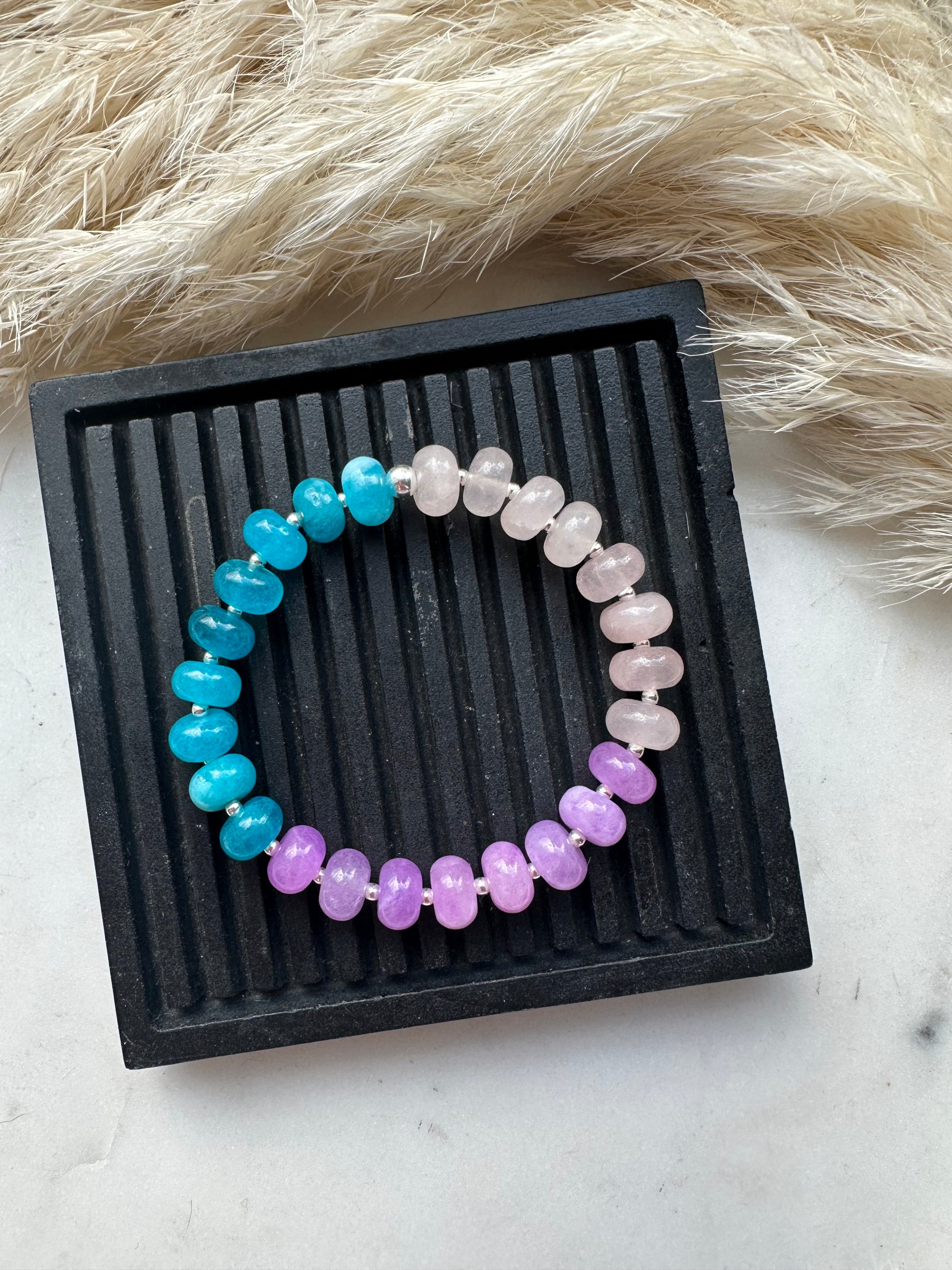 rose quartz, aquamarine & purple tourmaline strung with sterling silver spacers & toggle clasp