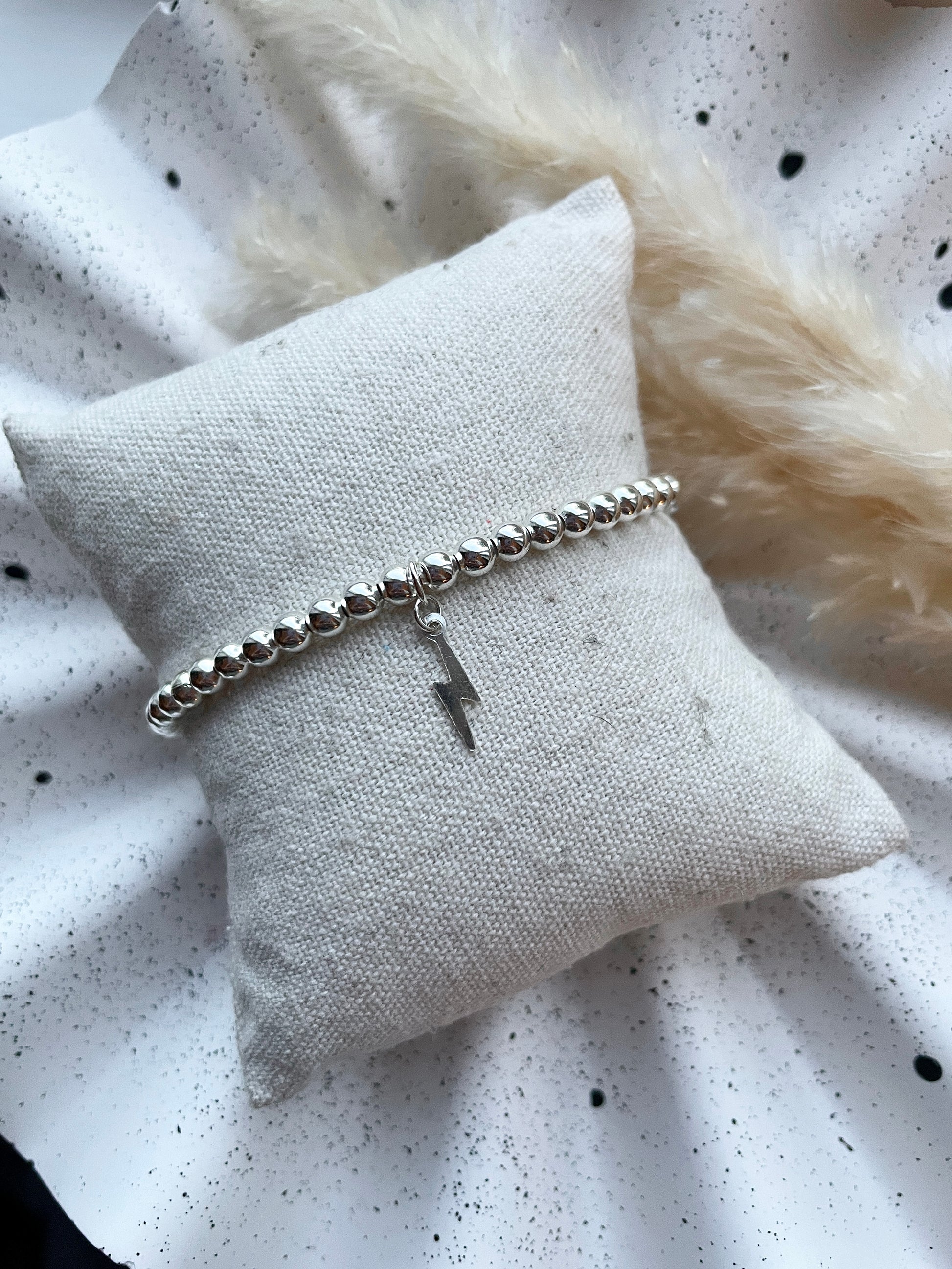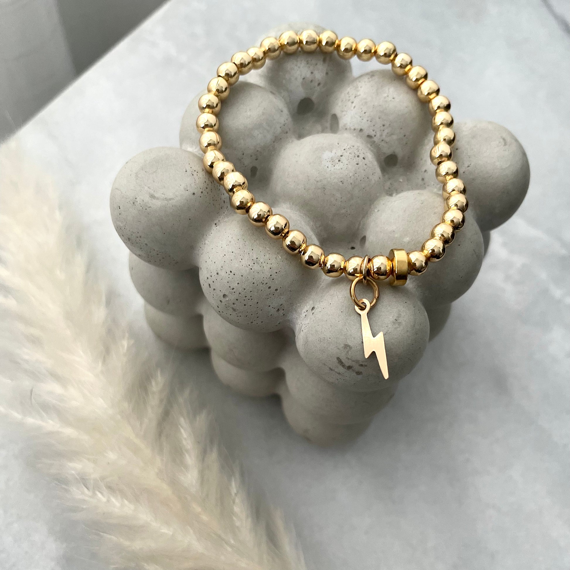 4mm gold or silver plated beaded bracelet with a gold filled or sterling silver lightning charm