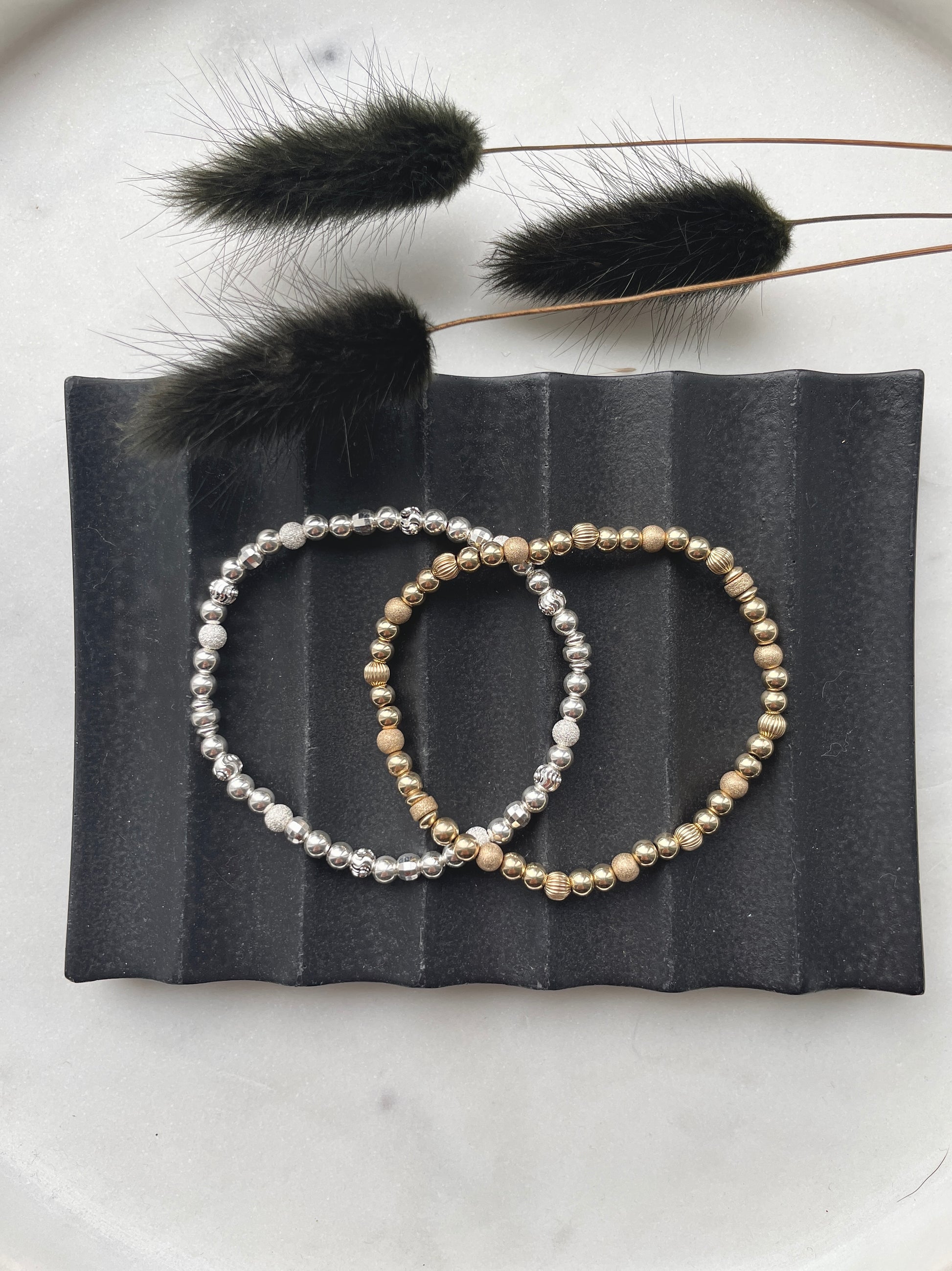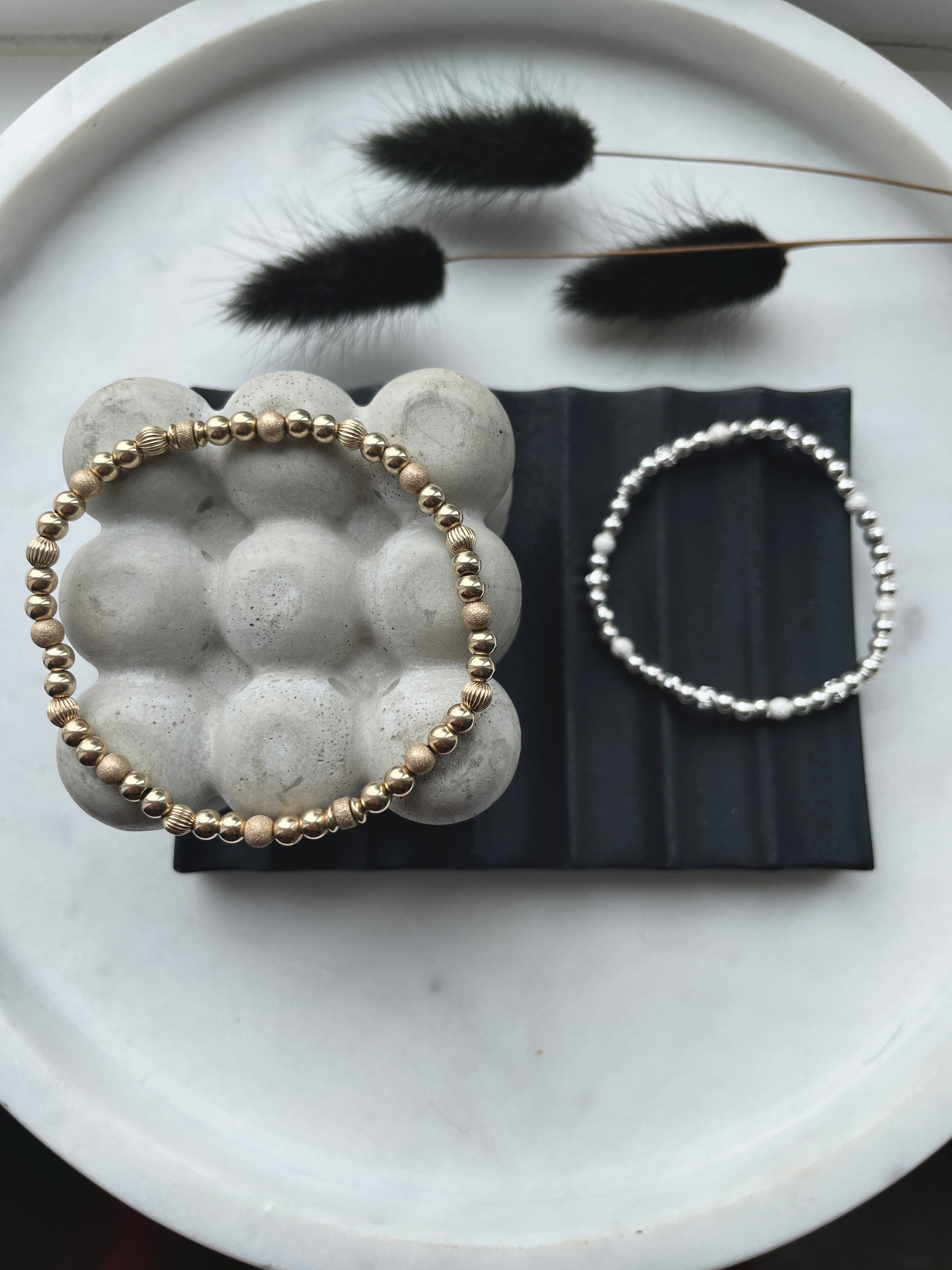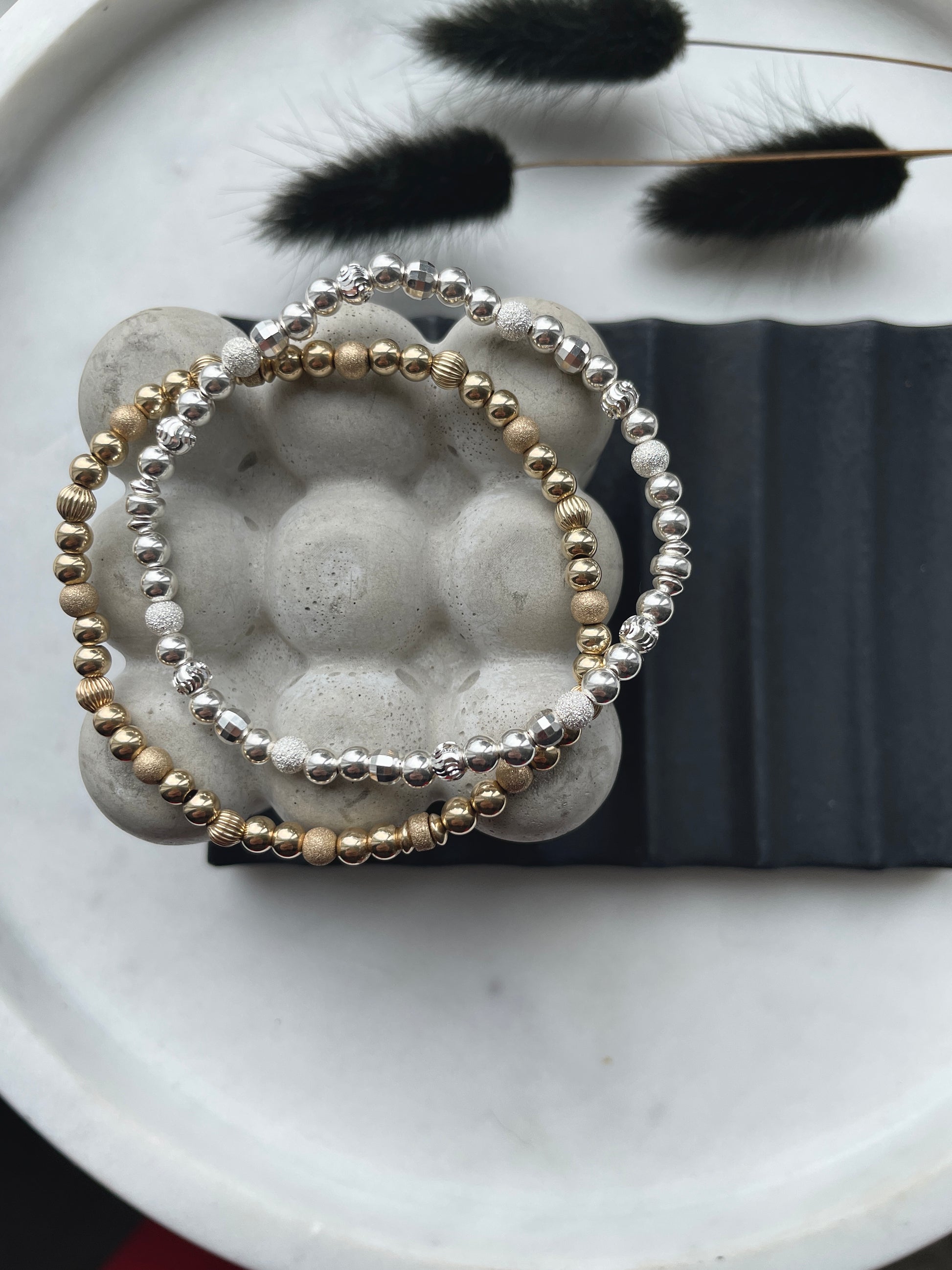 A mixture of plain, sparkle, ridge or disco ball 🪩 beads in solid gold filled or sterling silver.