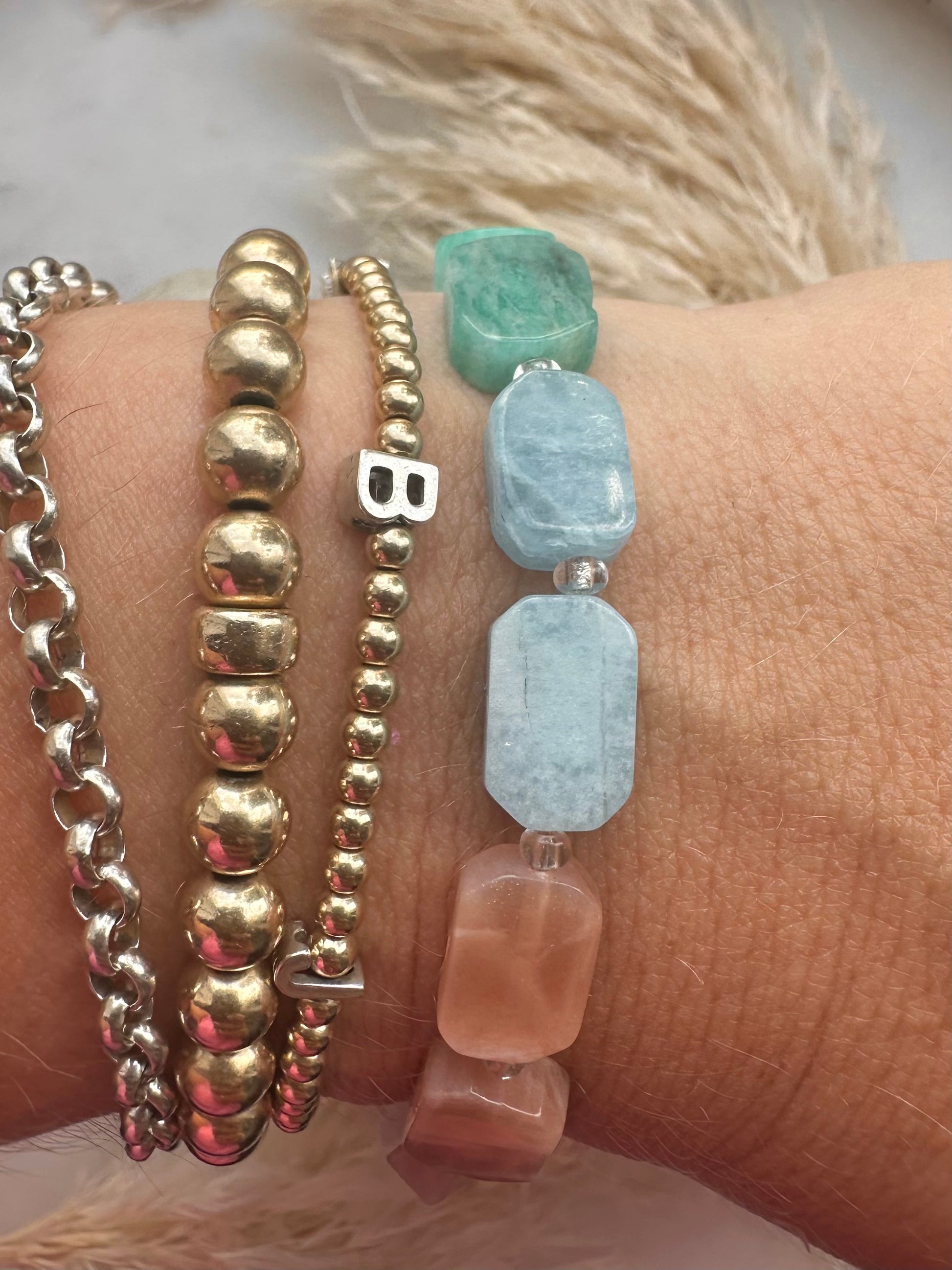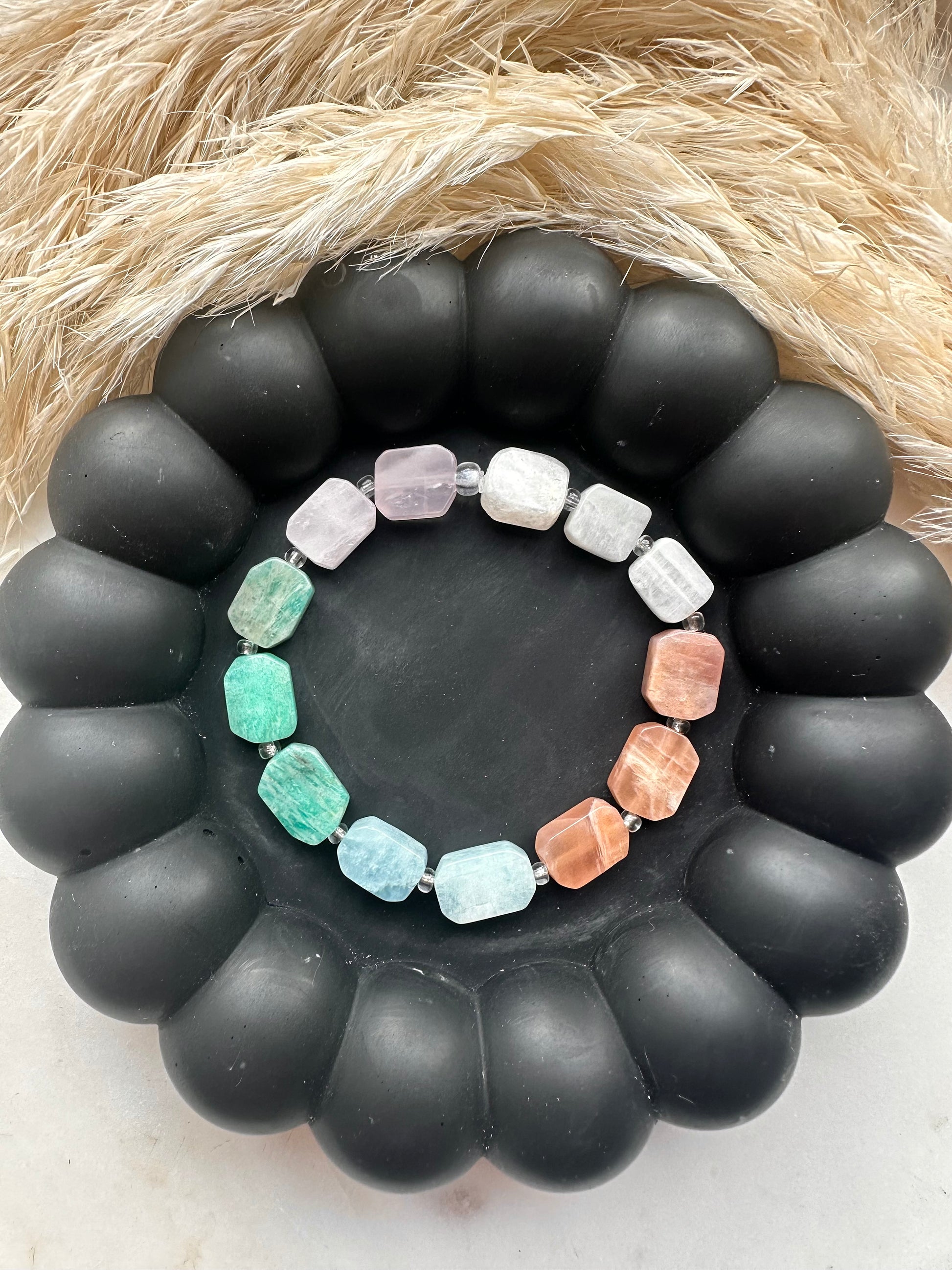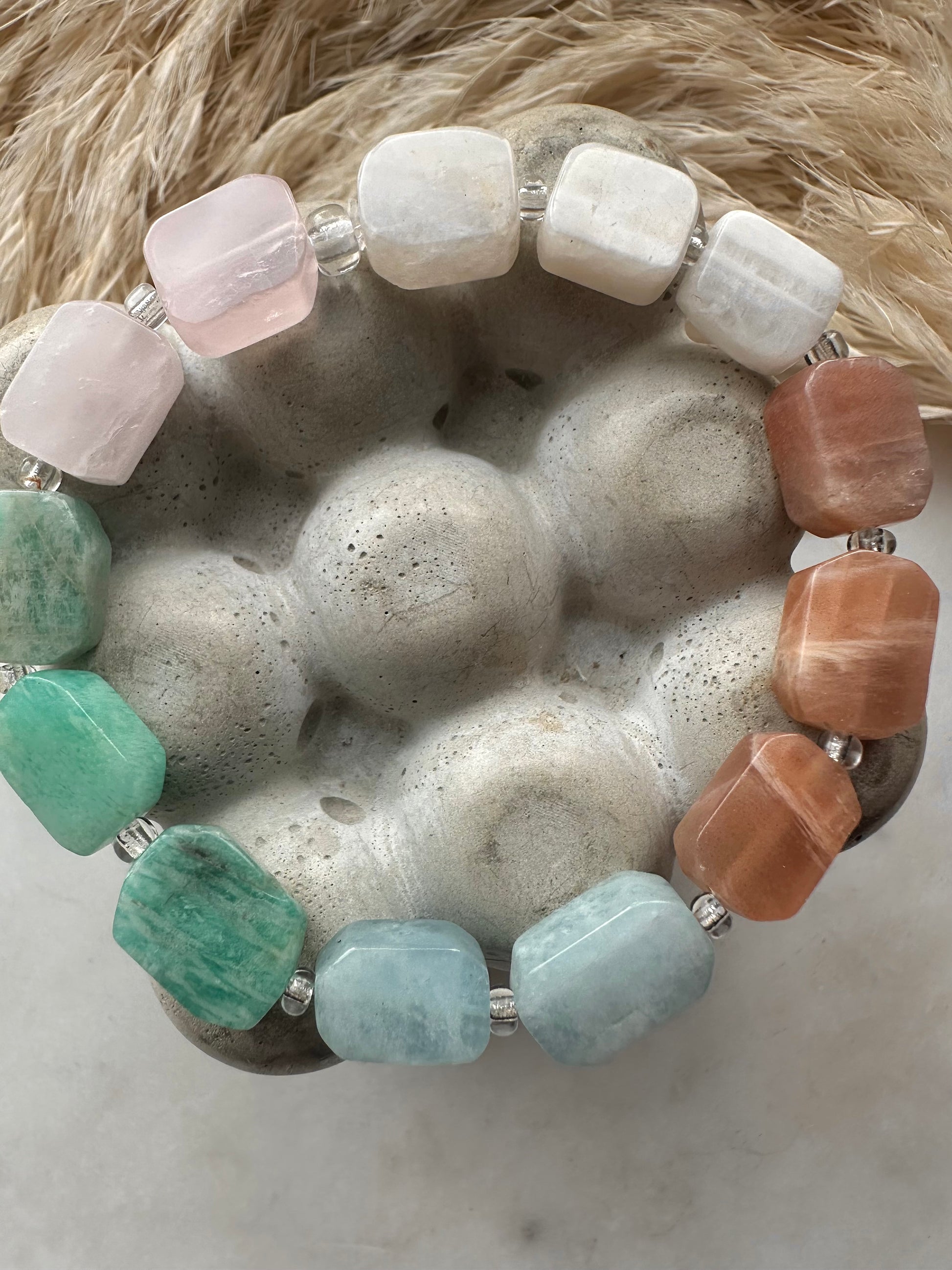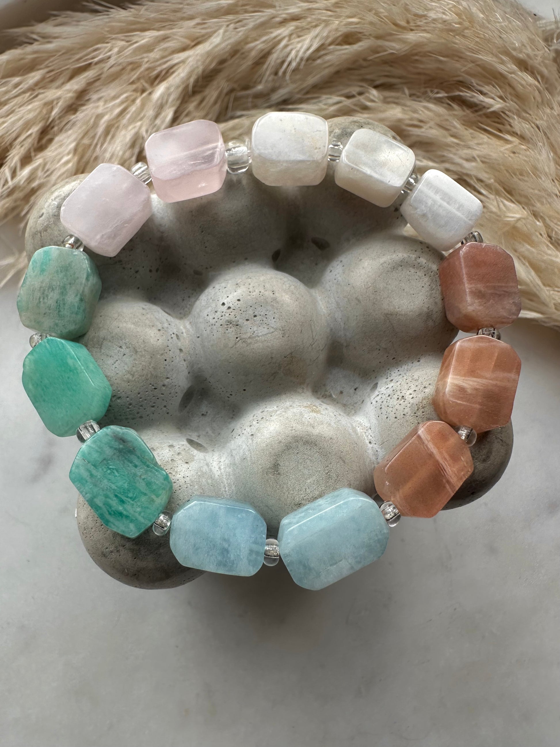love (rose quartz), calm (amazonite), intuition (moonstone), clarity (aquamarine) and joy (sunstone)…all wrapped around your wrist