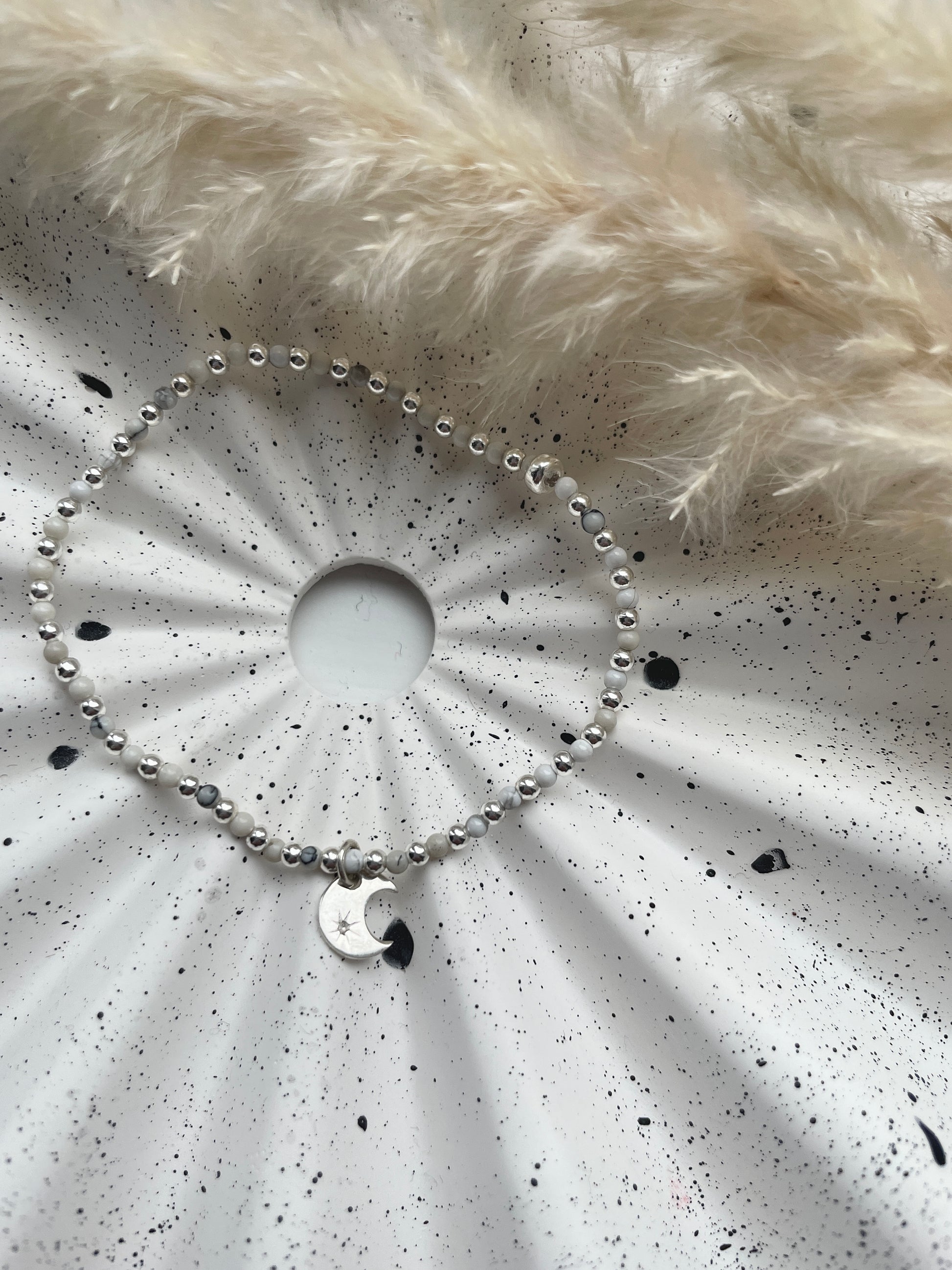 2.5mm sterling silver & white howlite beads with a sterling silver moon charm…stunning.