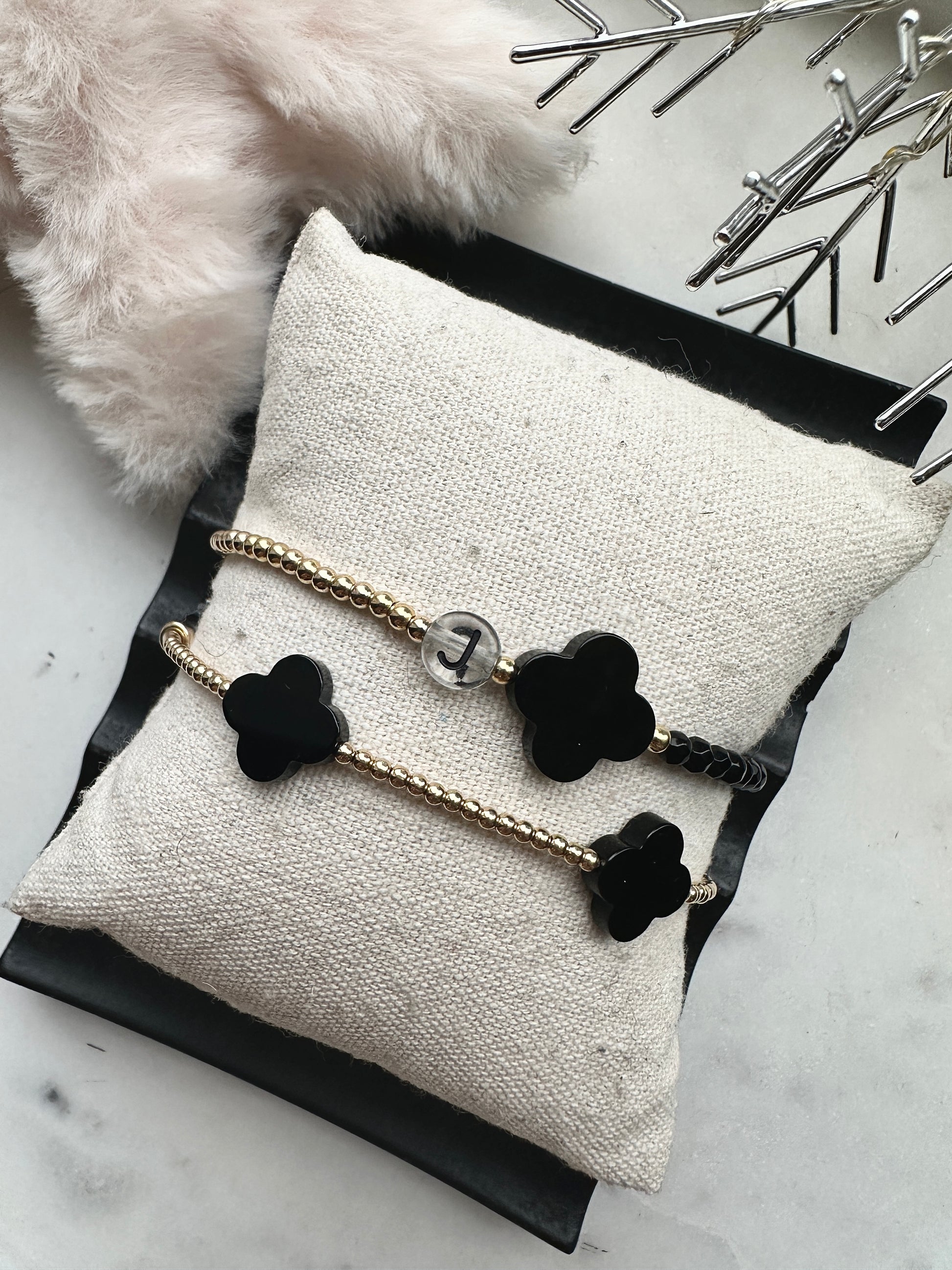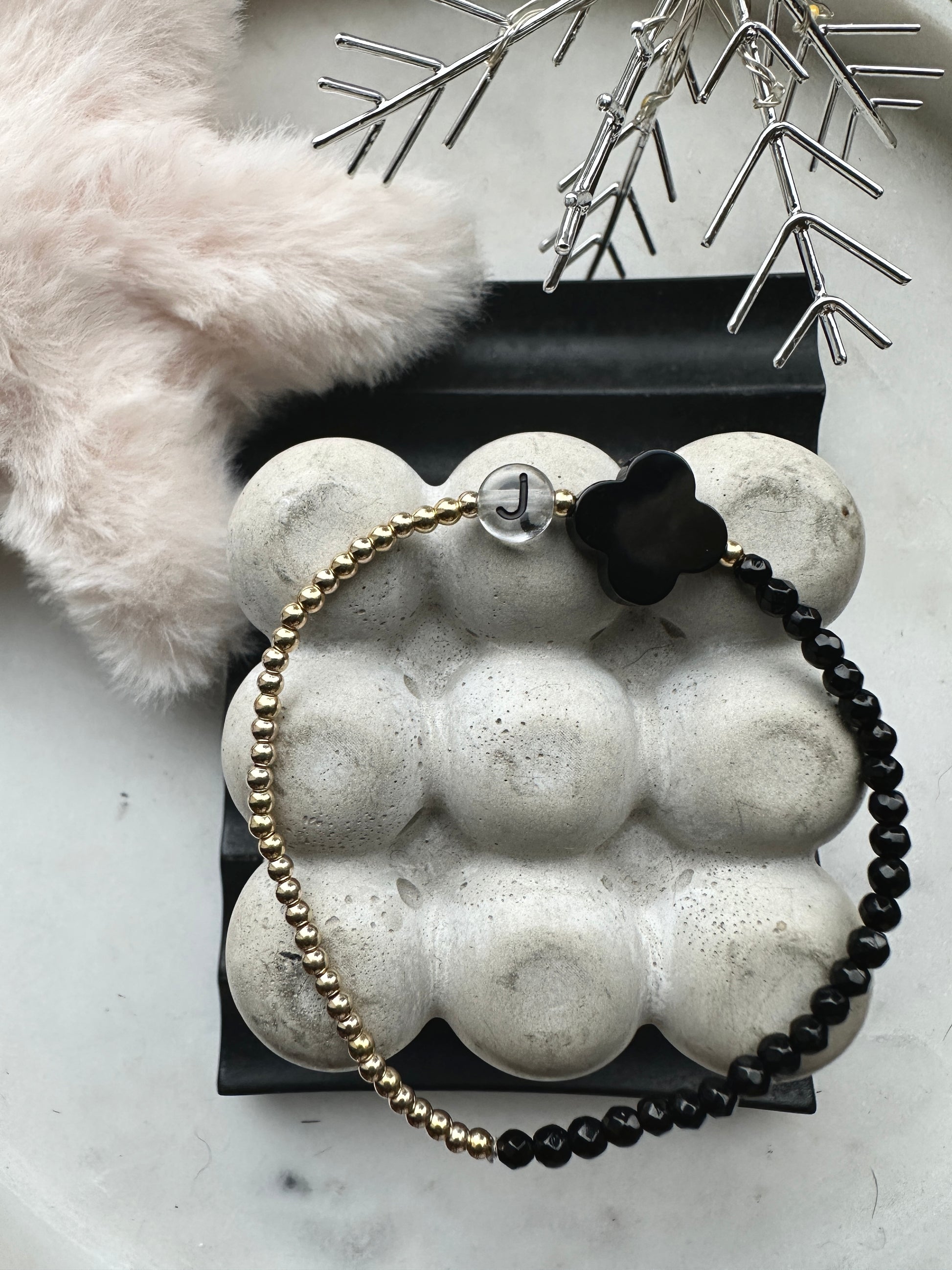 14mm black onyx clover with 3mm faceted black onyx beads. 2.5mm gold filled beads and the initial of your choice.
