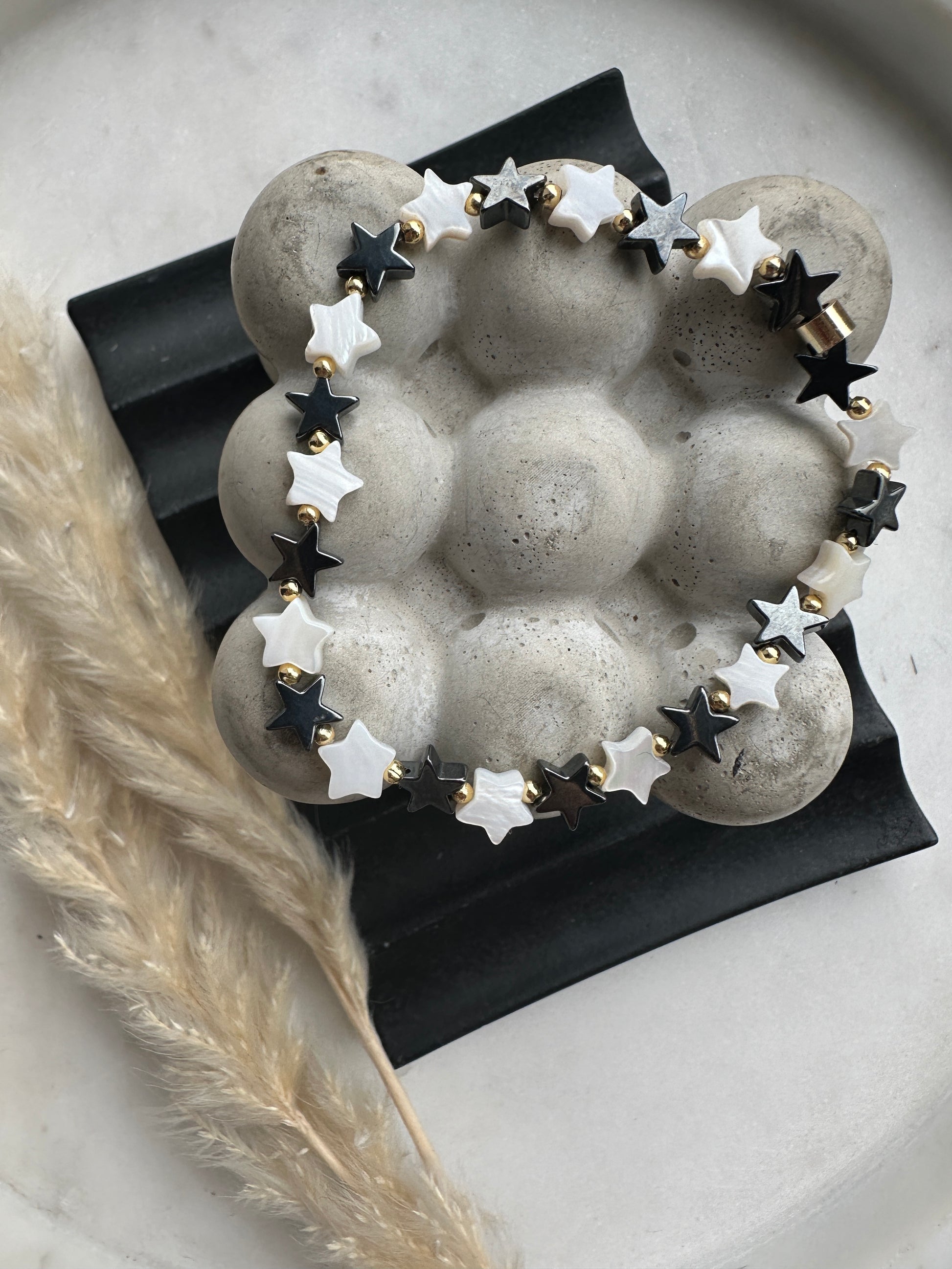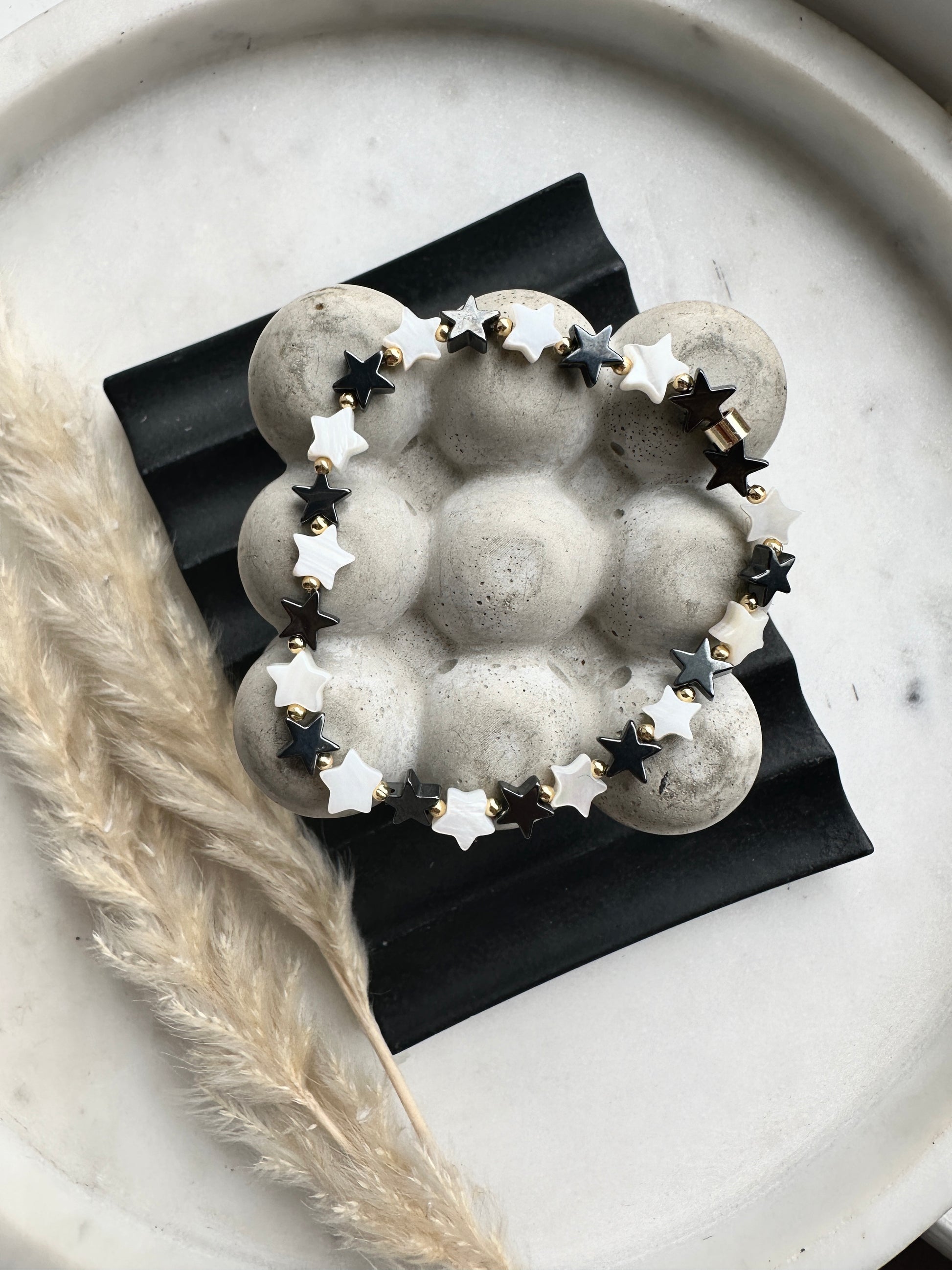Hematite & Mother of Pearl stars with a luxe edge of sterling silver or gold filled accent beads