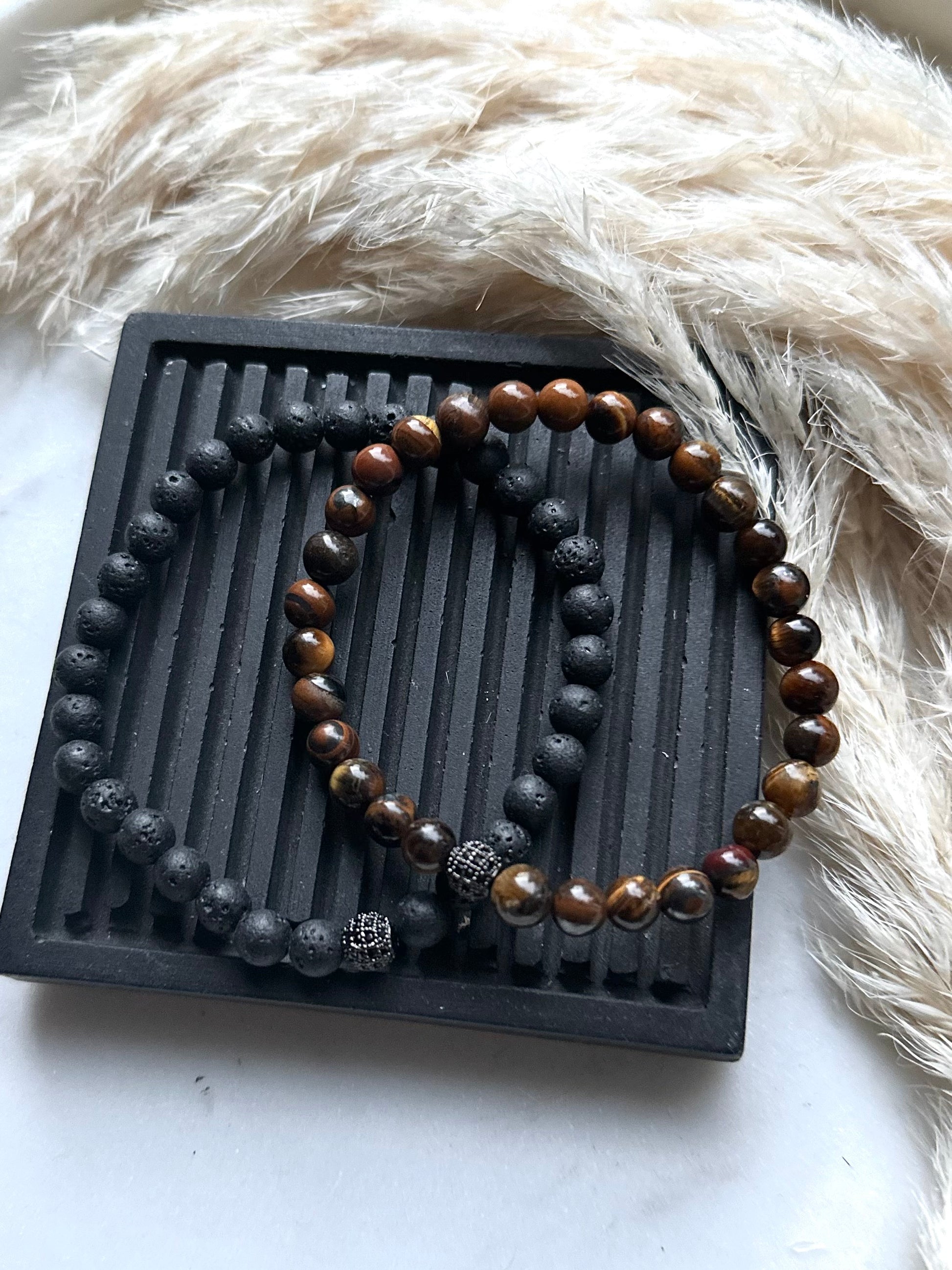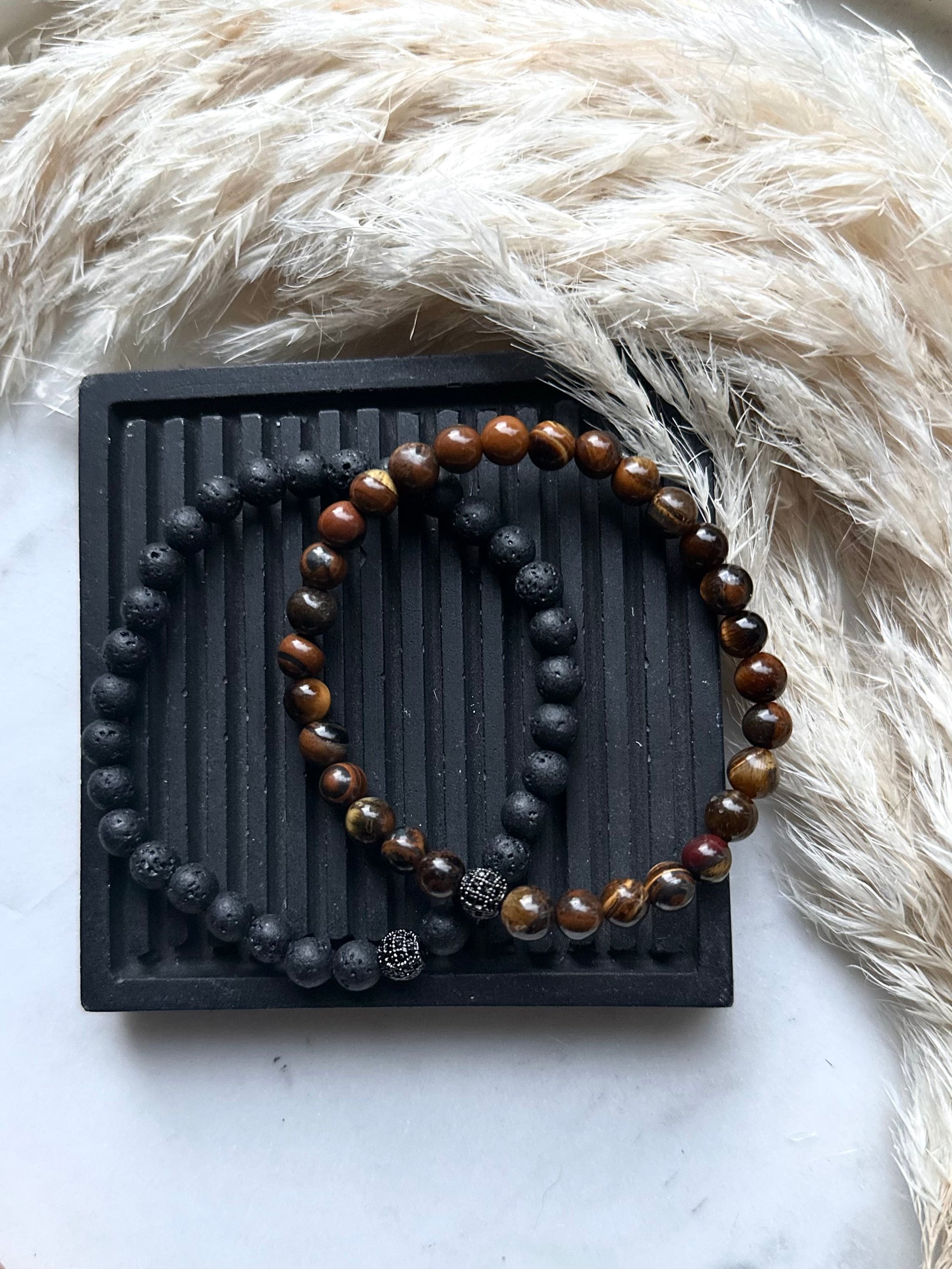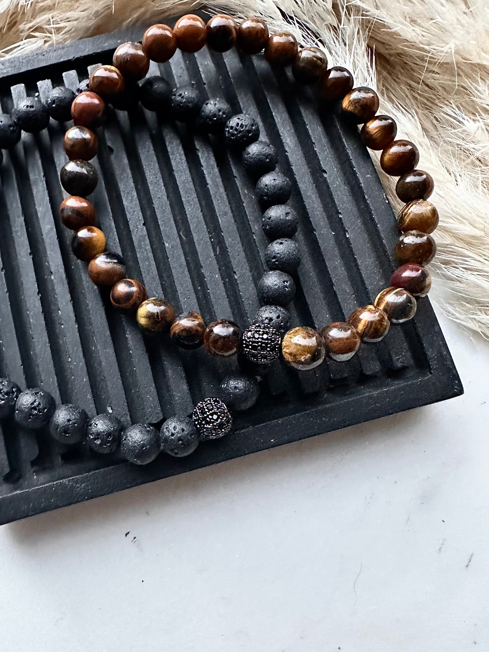 Choose from black lava beads or tigers eye with this striking centre bead.