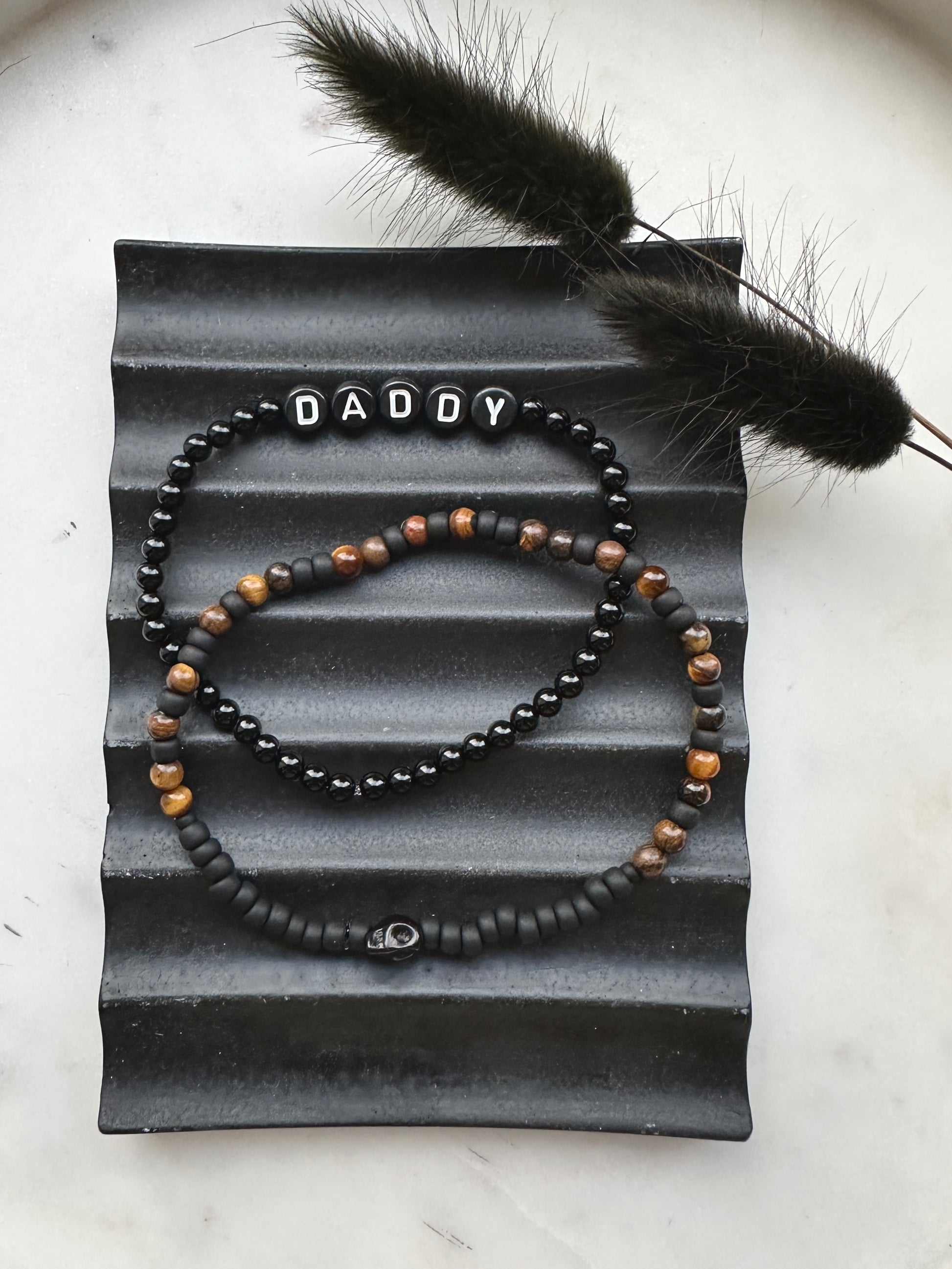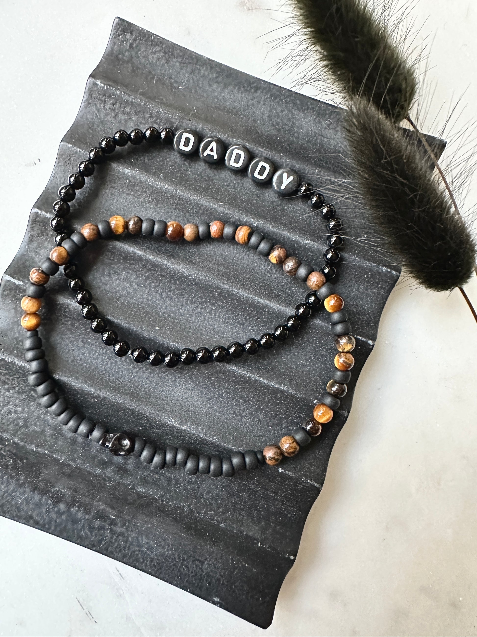 These are 4mm black onyx personalised bracelets. Shown as Daddy but can be personalised with any word of your choice.