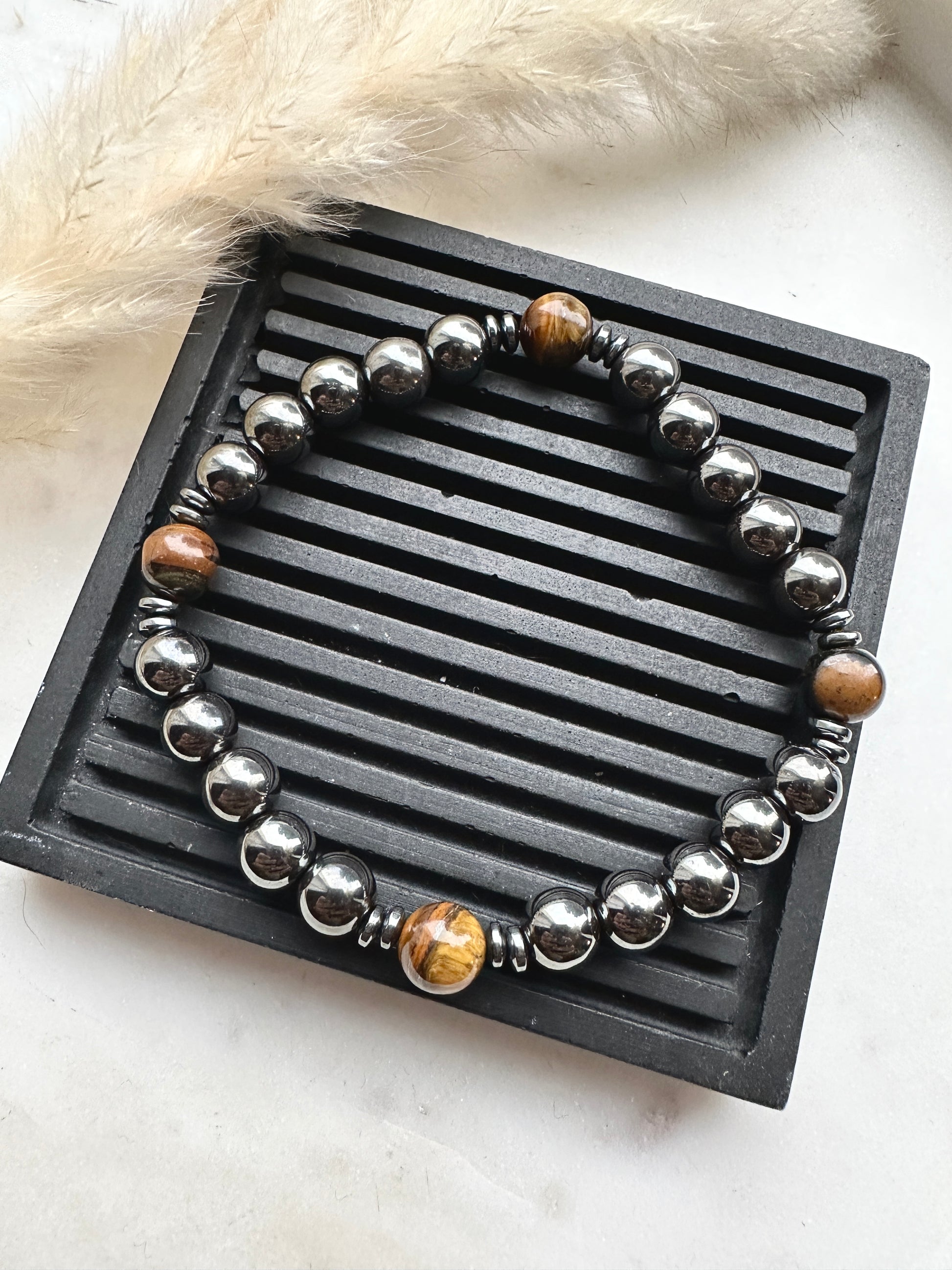 These are 8mm hematite & tigers eye beads - hematite provides a shield for the wearers against negative energy, whereas tigers eye provides confidence and courage.