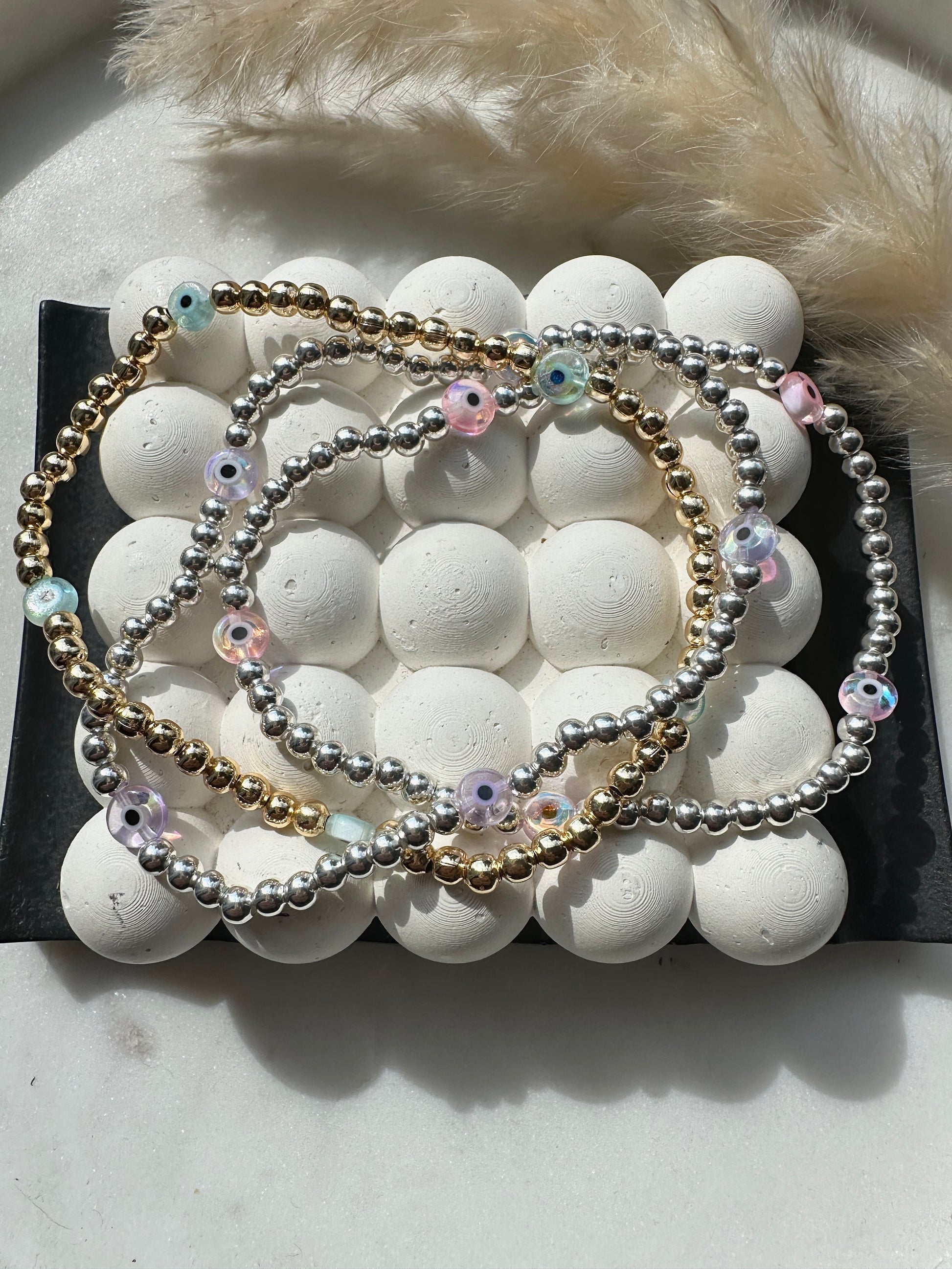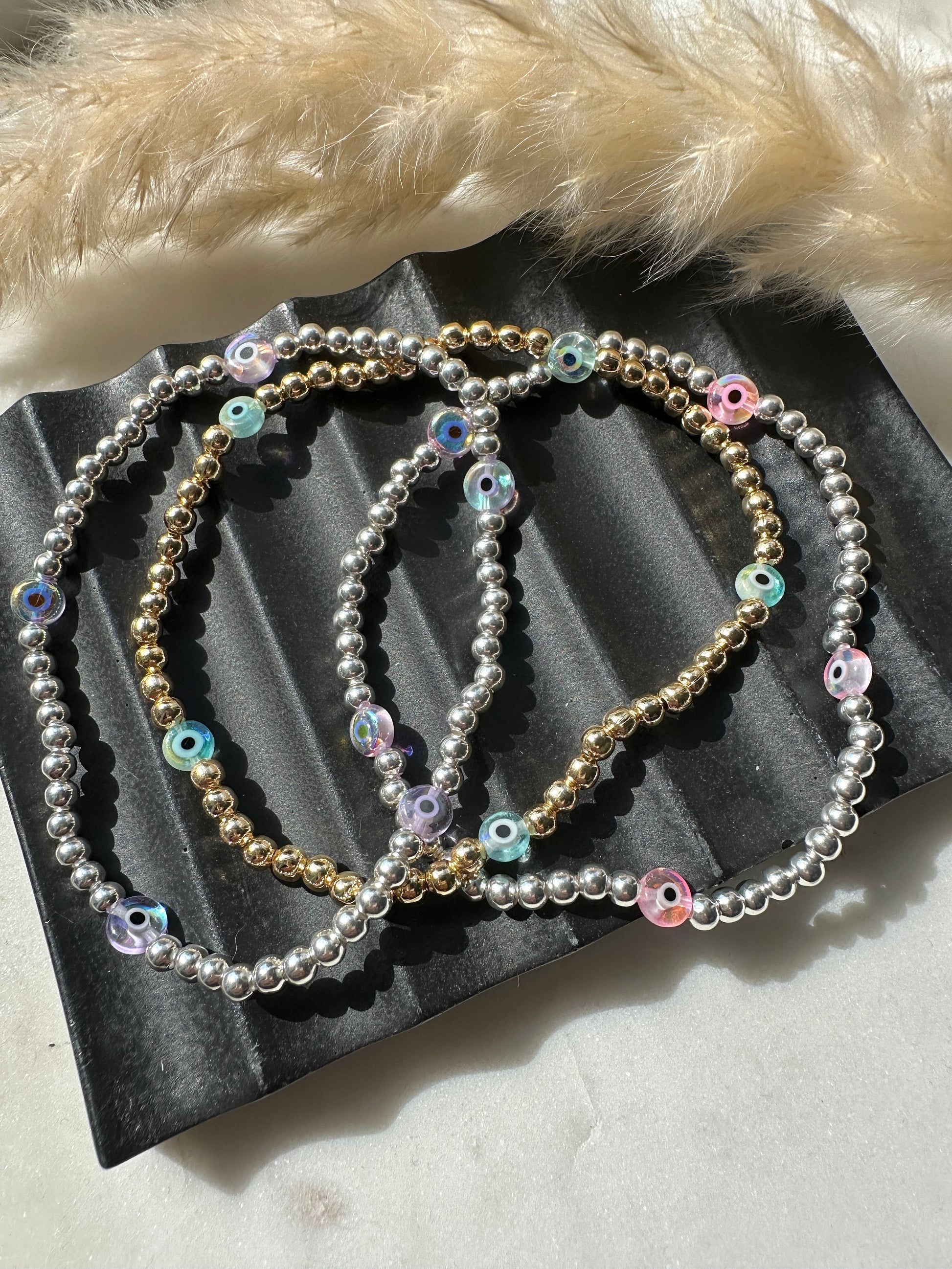 Choose from gold or silver plated 4mm beads in a variety of gorgeous iridescent mermaid style evil eye beads. Or if you can’t decide on your favourite, mix them all!
