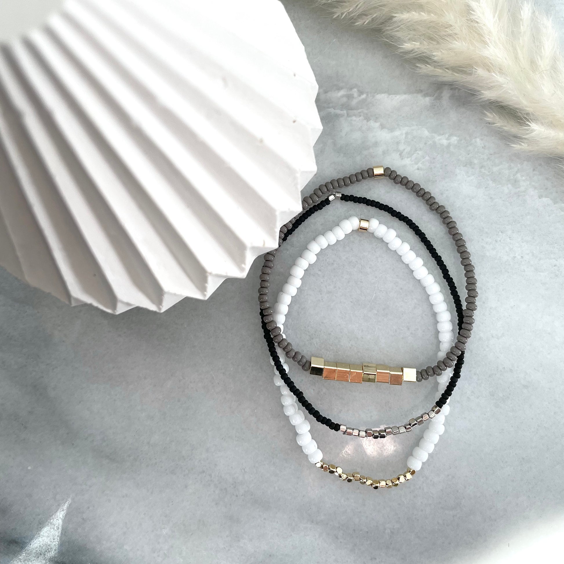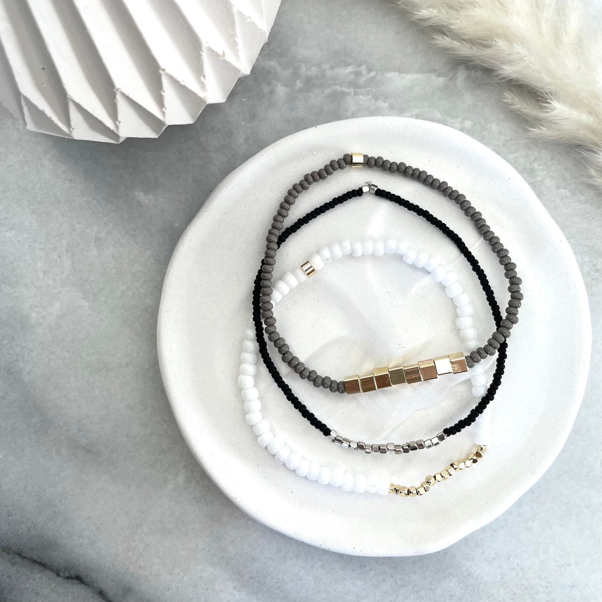These monochrome seed bead bracelets are perfect for stacking on your wrist!