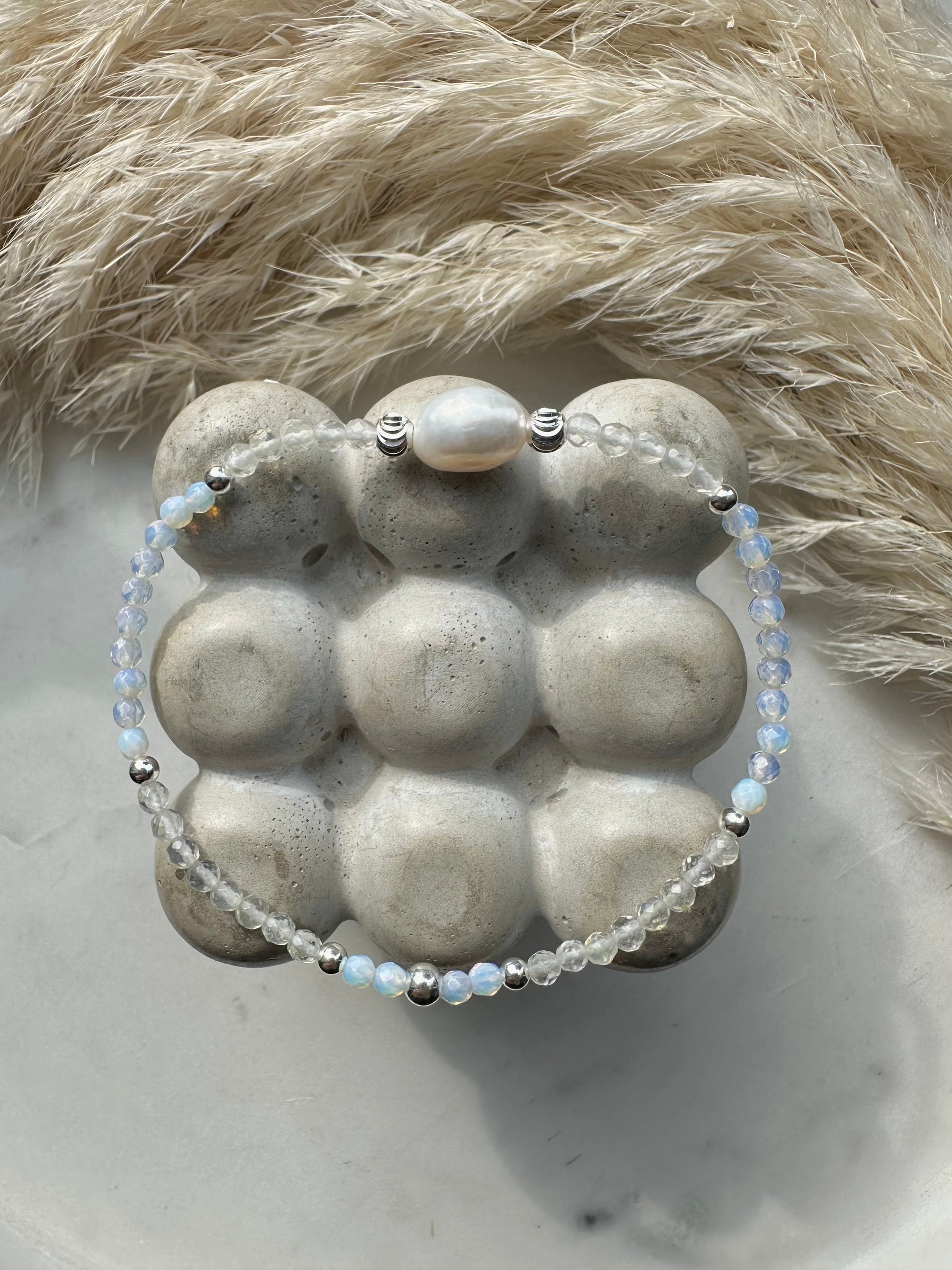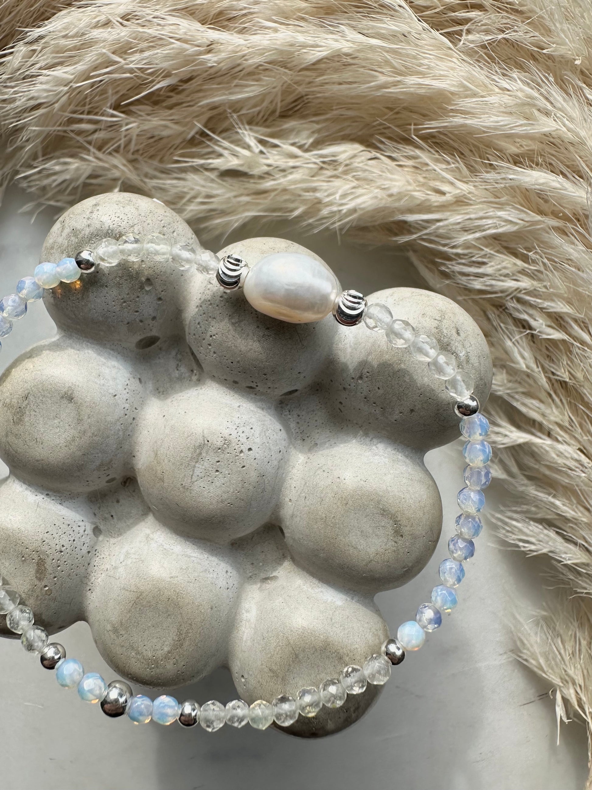 Opalite Moonstone & Crystal Quartz paired with sterling silver and a freshwater pearl.