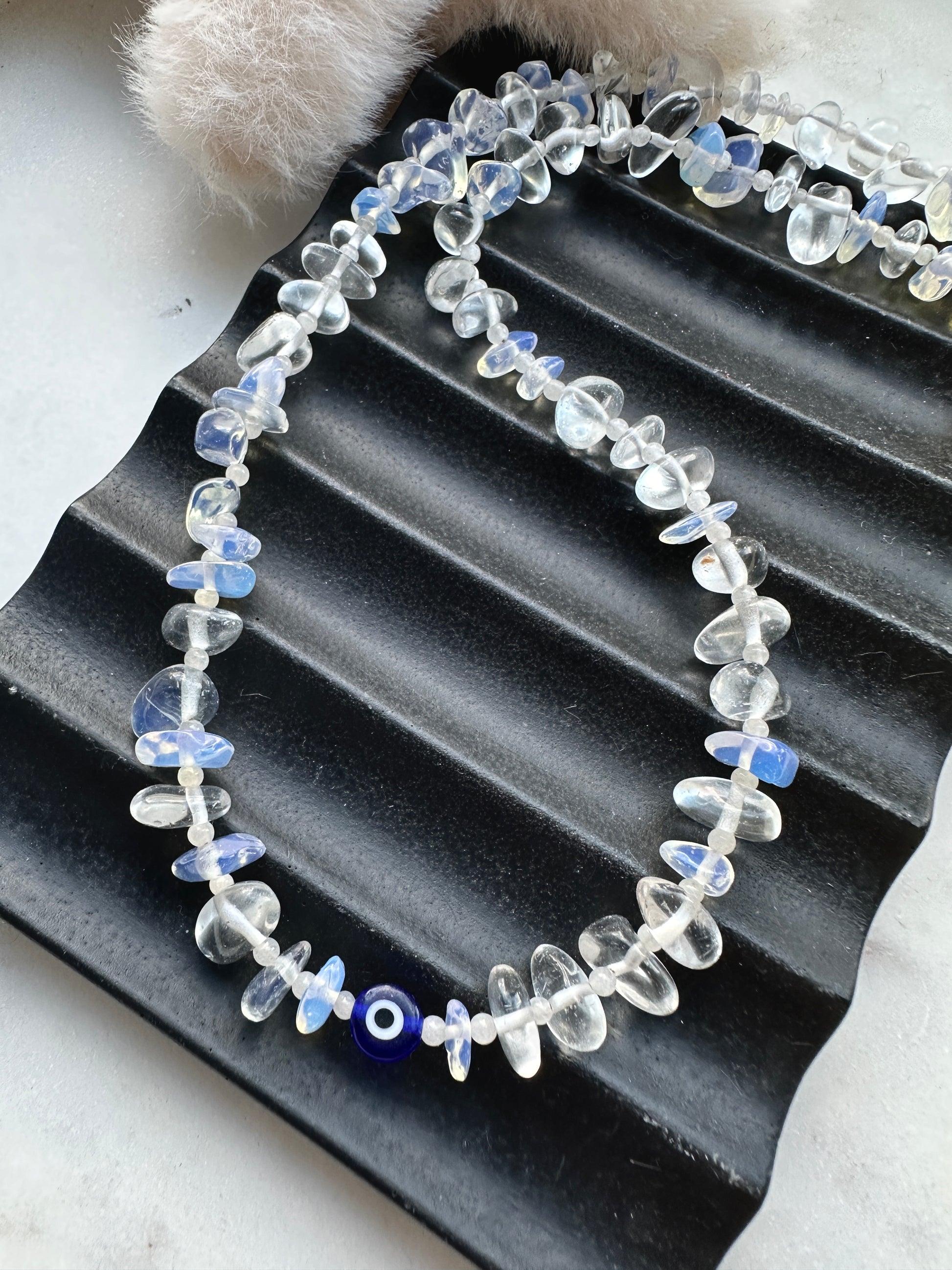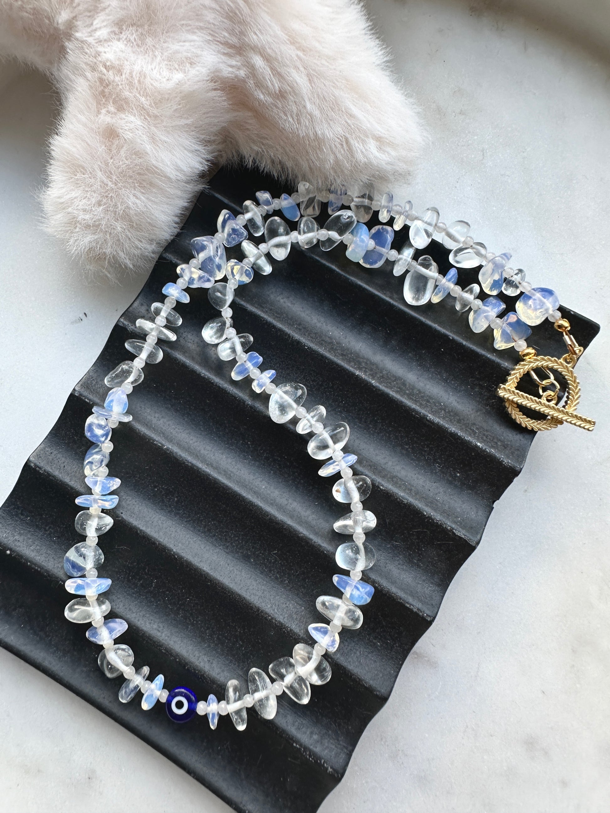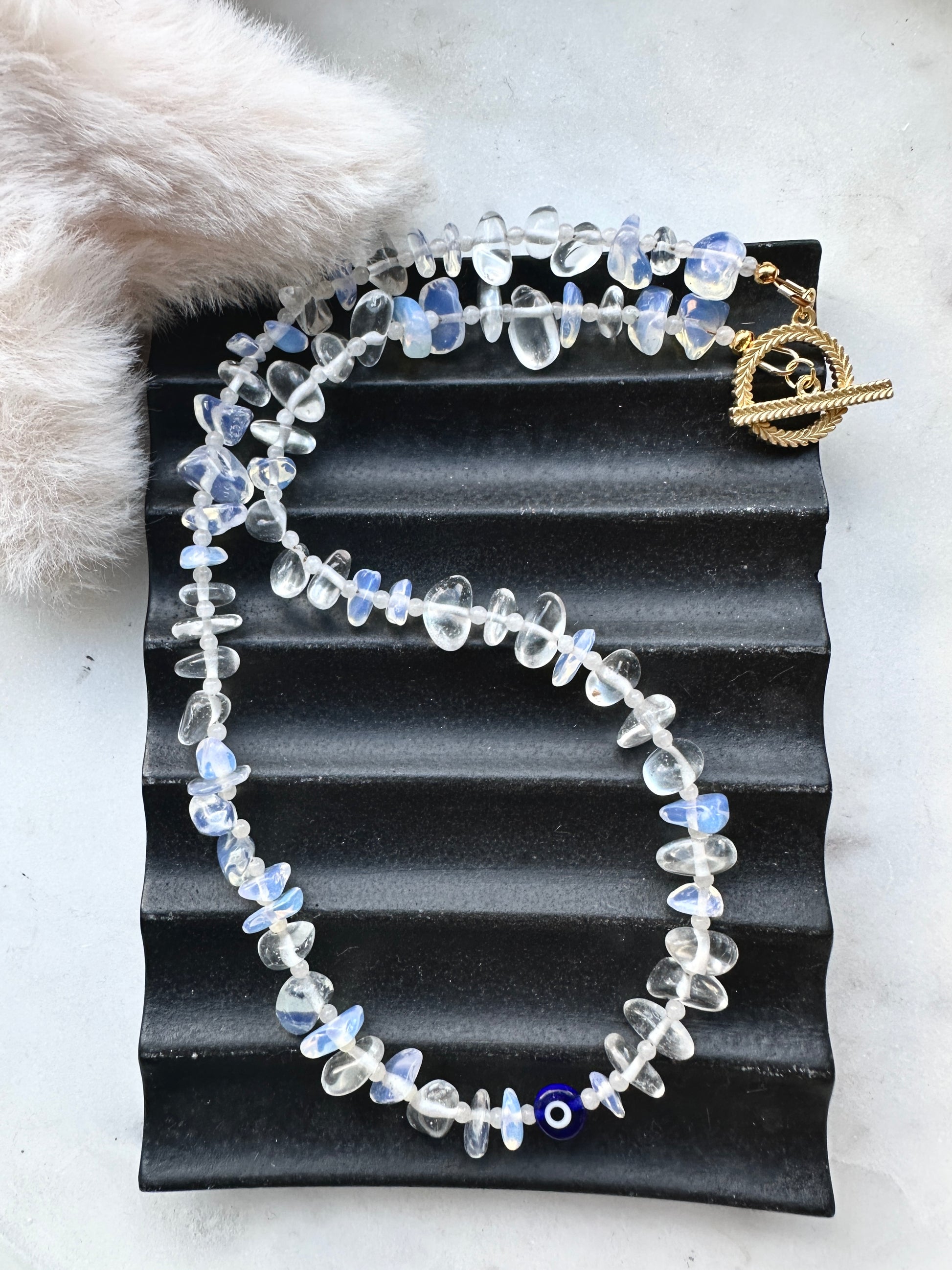 Moonstone crystal chips paired with white jade spacers and a glass evil eye centre, all finished with your choice of a gold or silver plated toggle fastening.