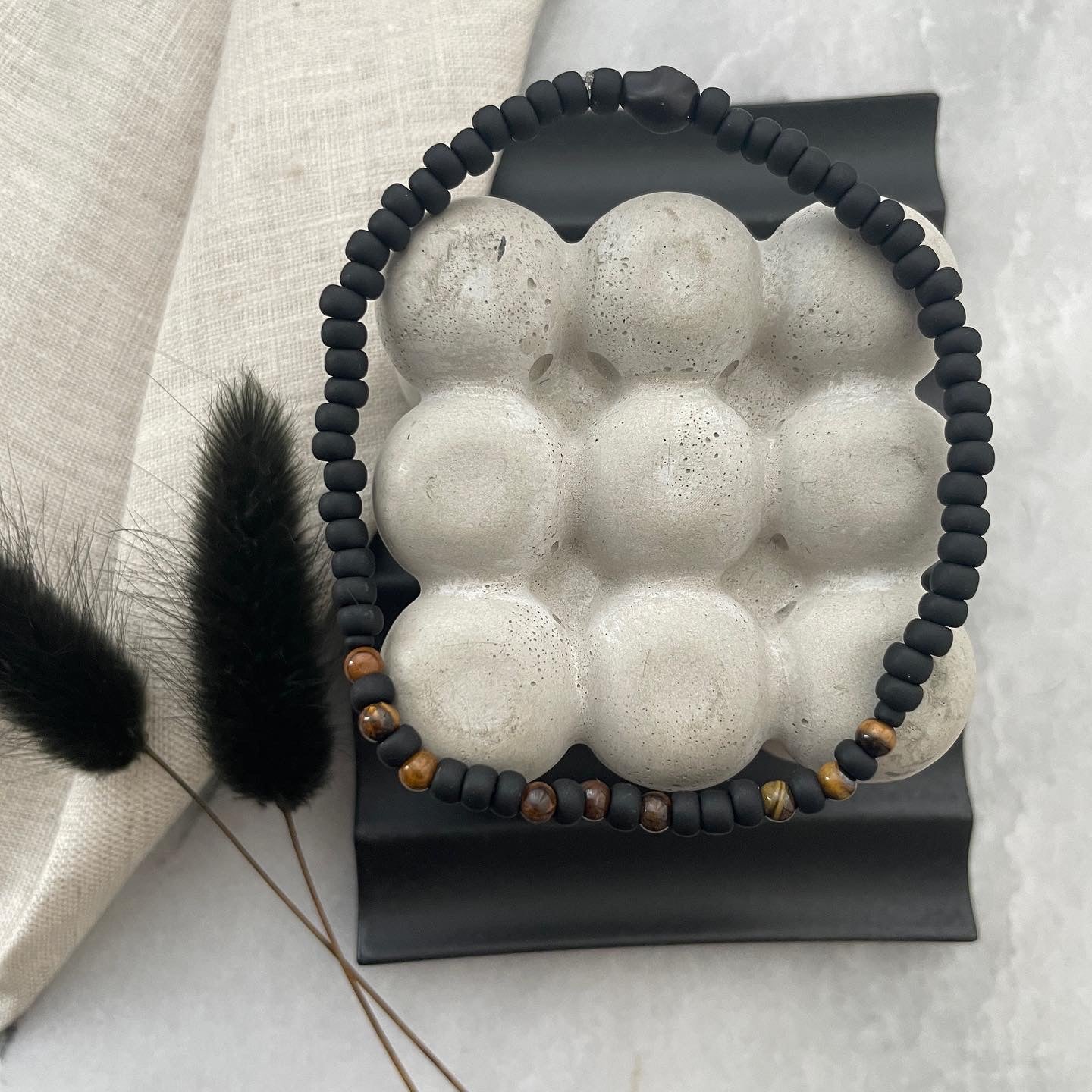 These are glass matte black seed beads with tigers eye, sterling silver or gold filled beads spelling out the letters.