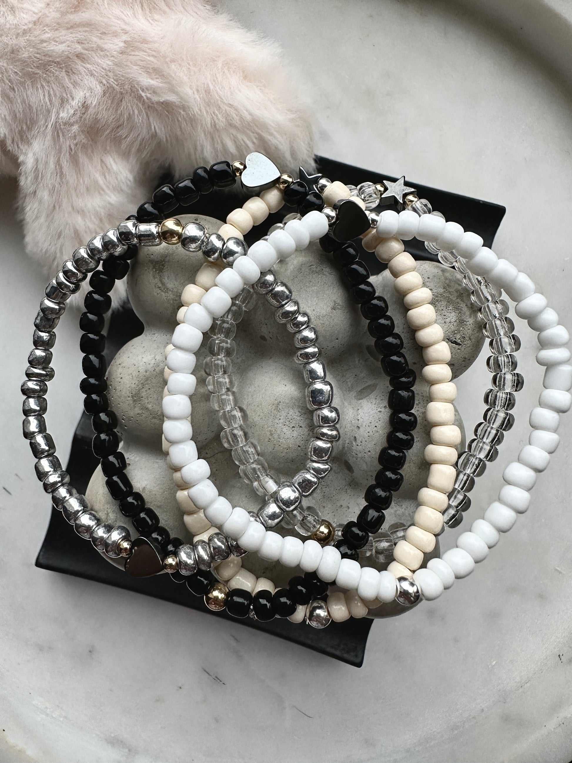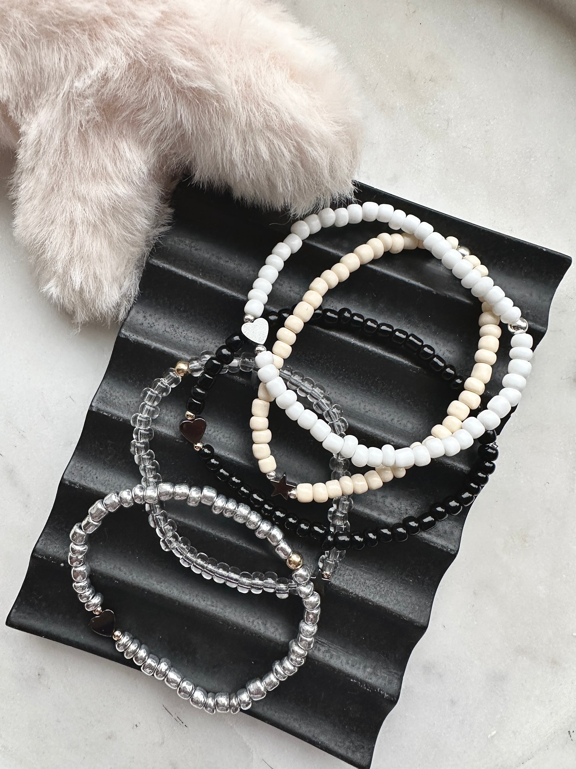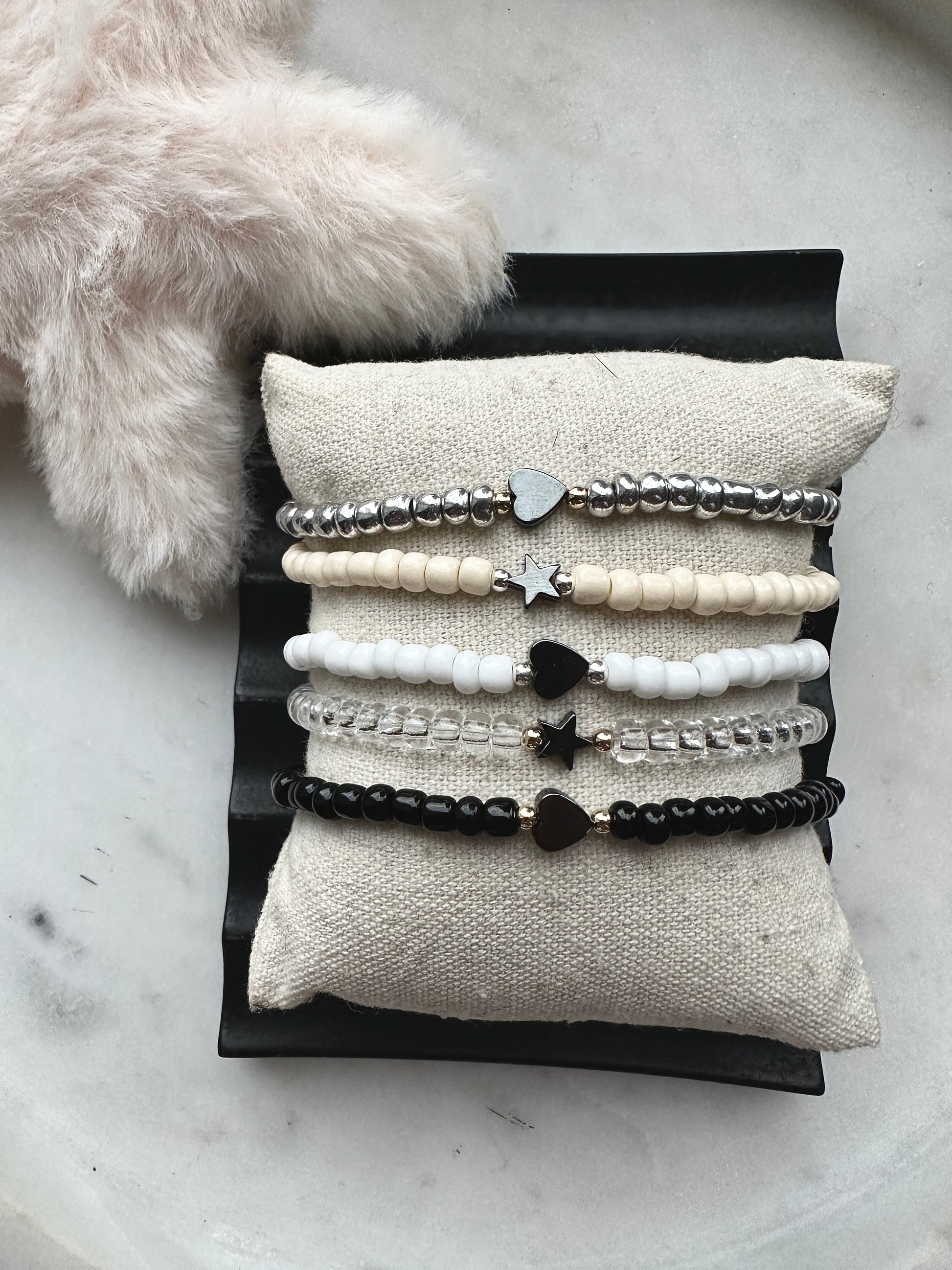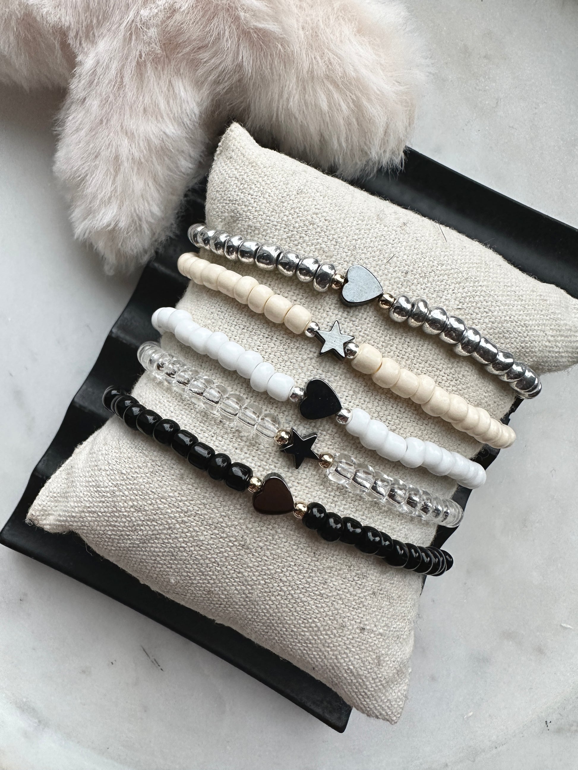 Glass seed bead bracelets paired with your choice of sterling silver or gold filled accent beads and a hematite star or heart.