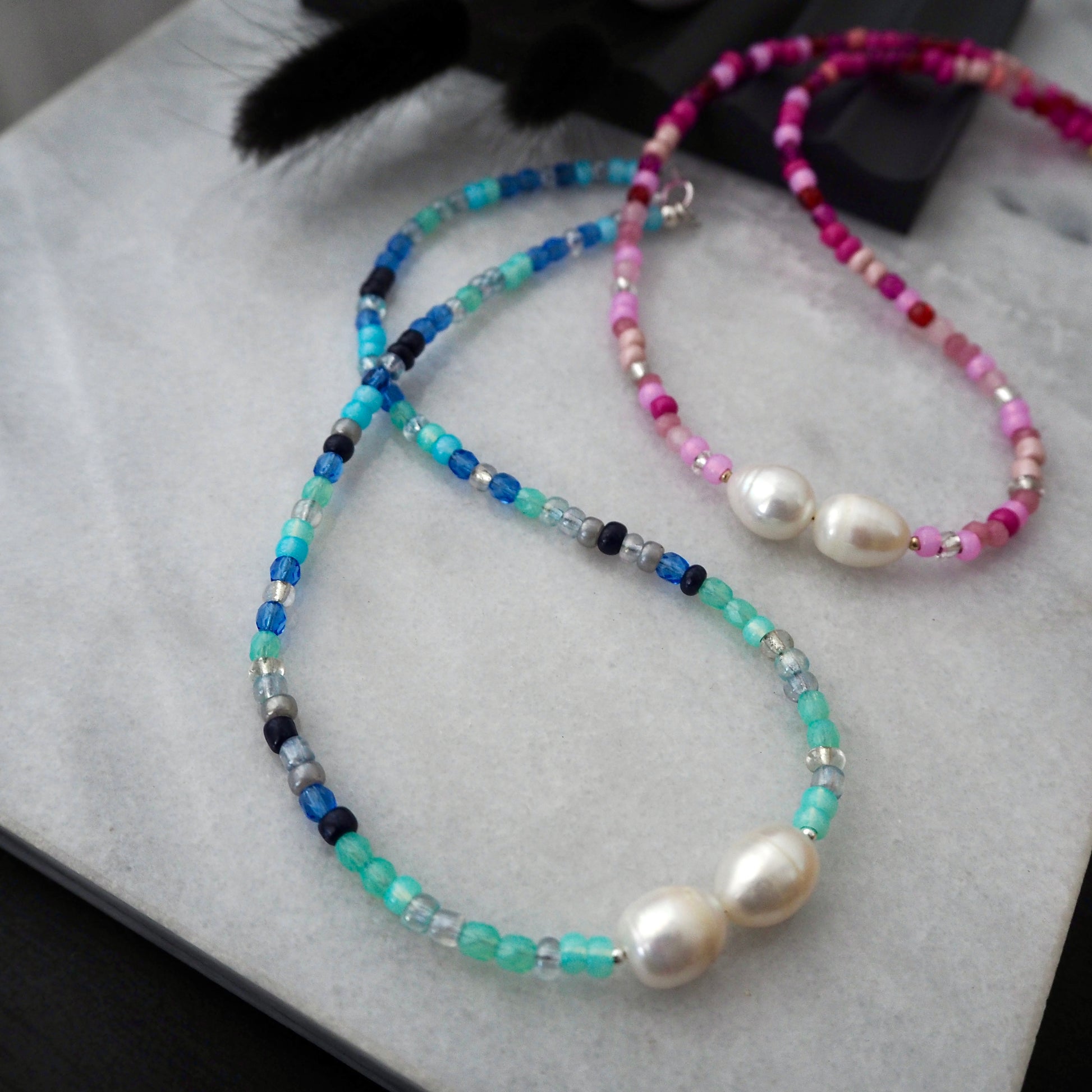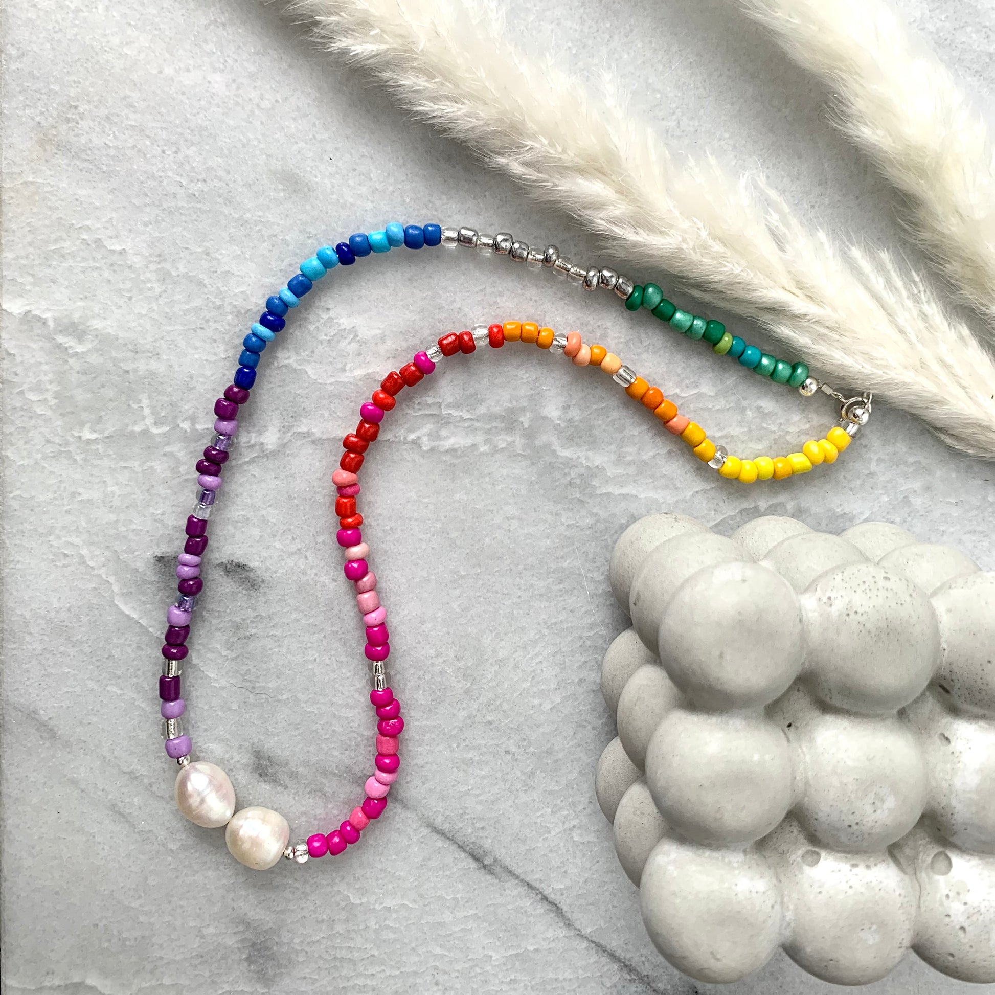 These gorgeous ombré necklaces are a mix of glass seed beads paired with freshwater pearls and your choice of gold or silver plated accents and fastening.