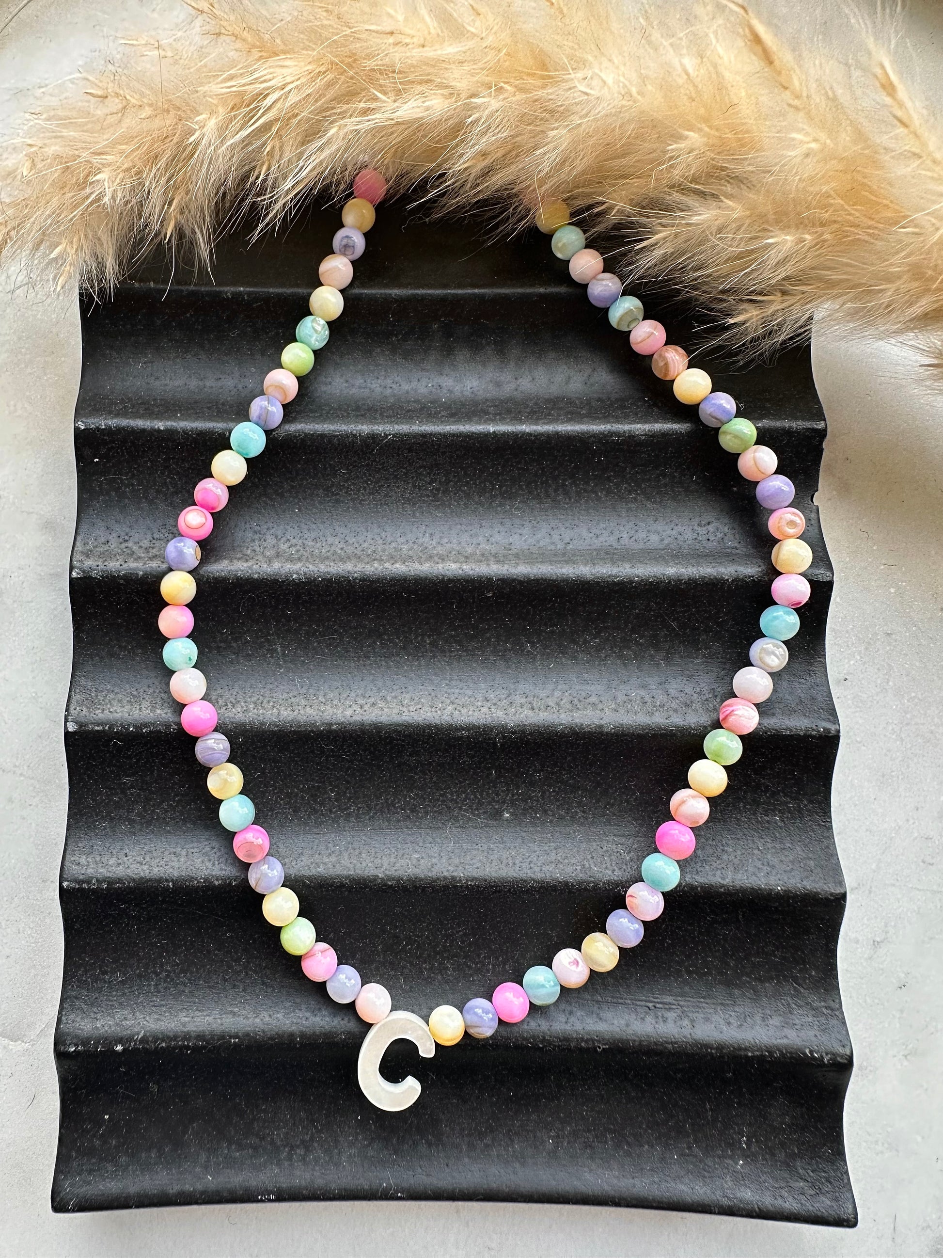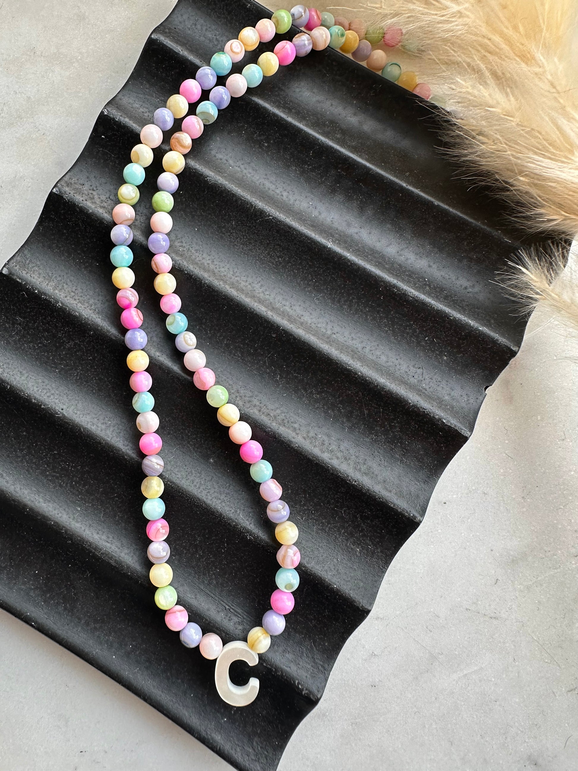 16” or 17” Mother of Pearl pastel coloured necklace with your choice of initial. Available with a gold filled or sterling silver clasp fastening.