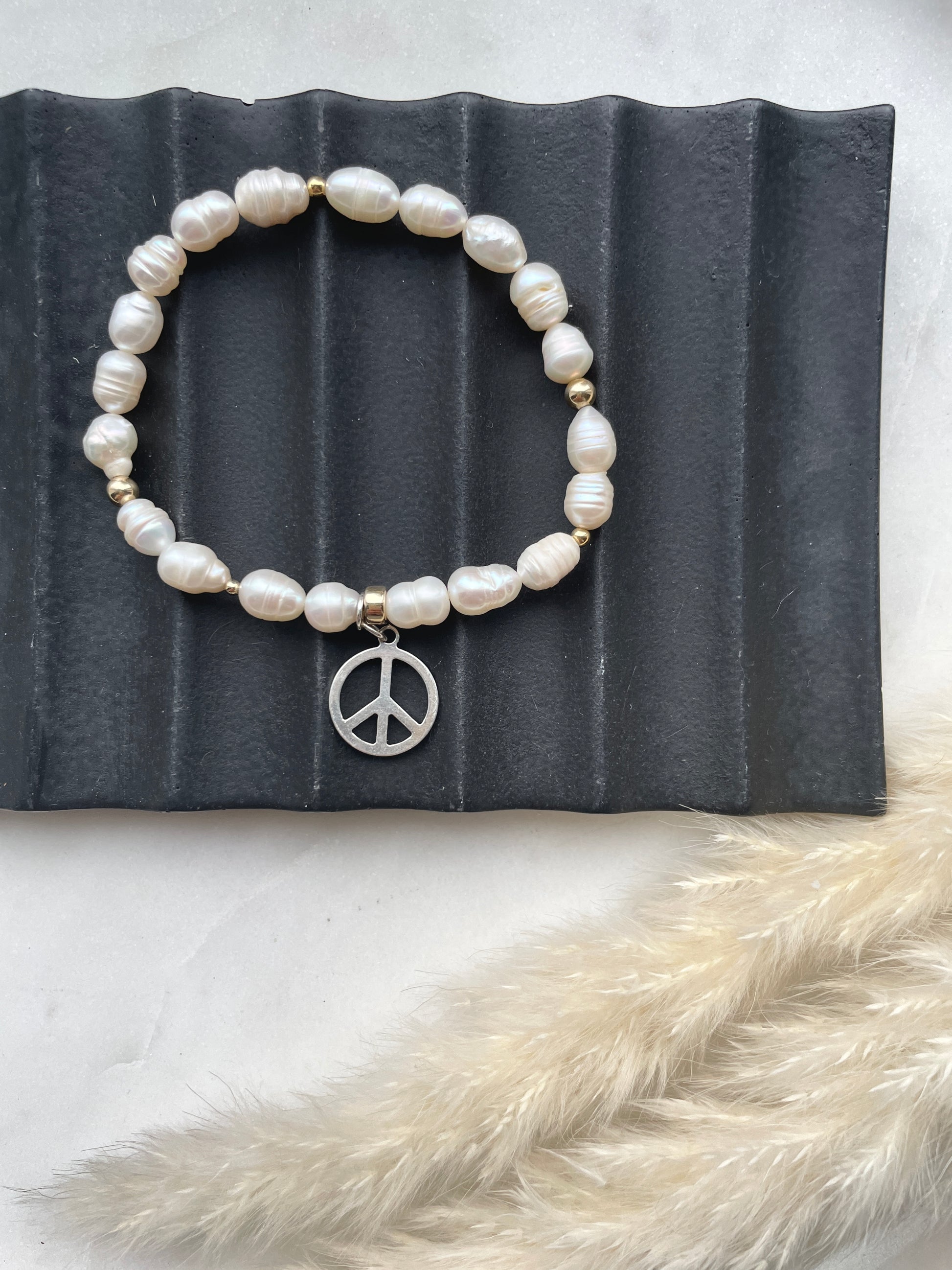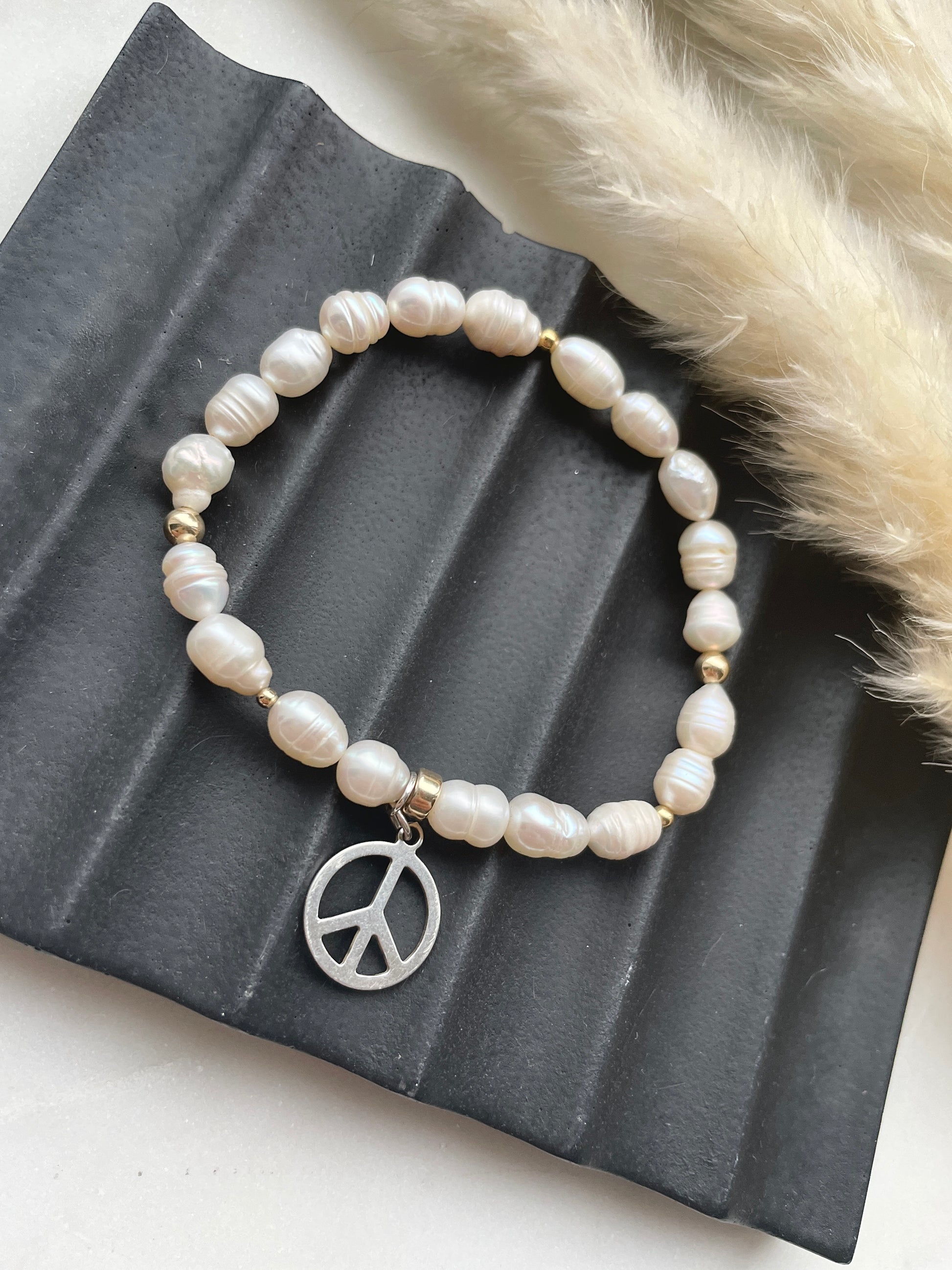 Freshwater pearls with your choice of gold filled or sterling silver spacer beads and a sterling silver peace charm.