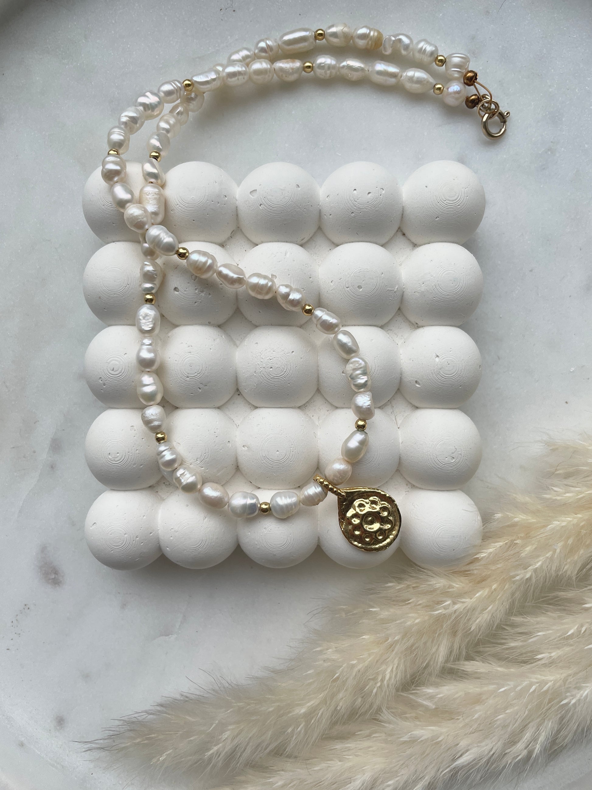 Freshwater pearls with gold spacer beads and a gold coin pendant.