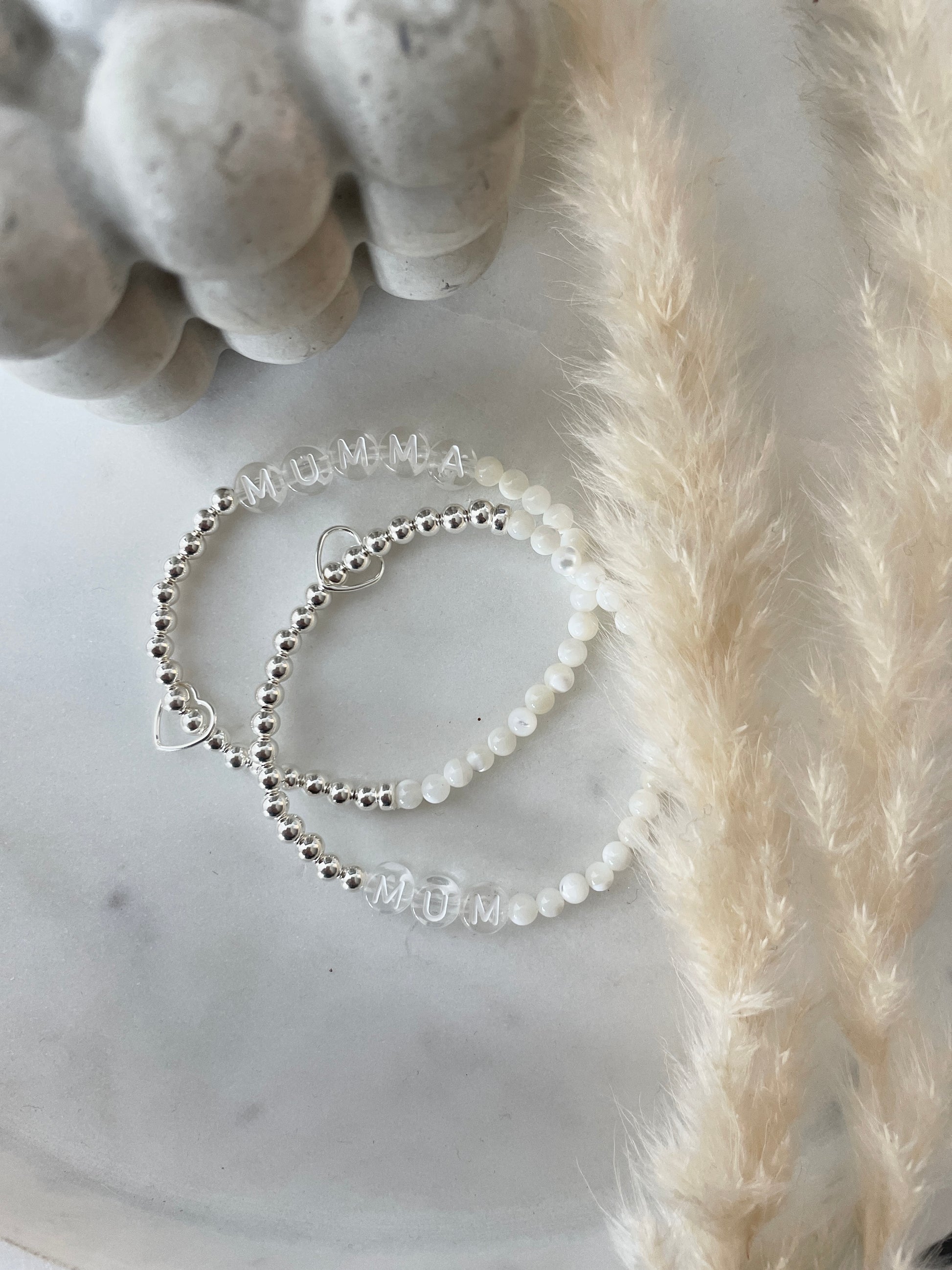 Half 4mm sterling silver and half 4mm mother of pearl with a sterling silver heart connector.