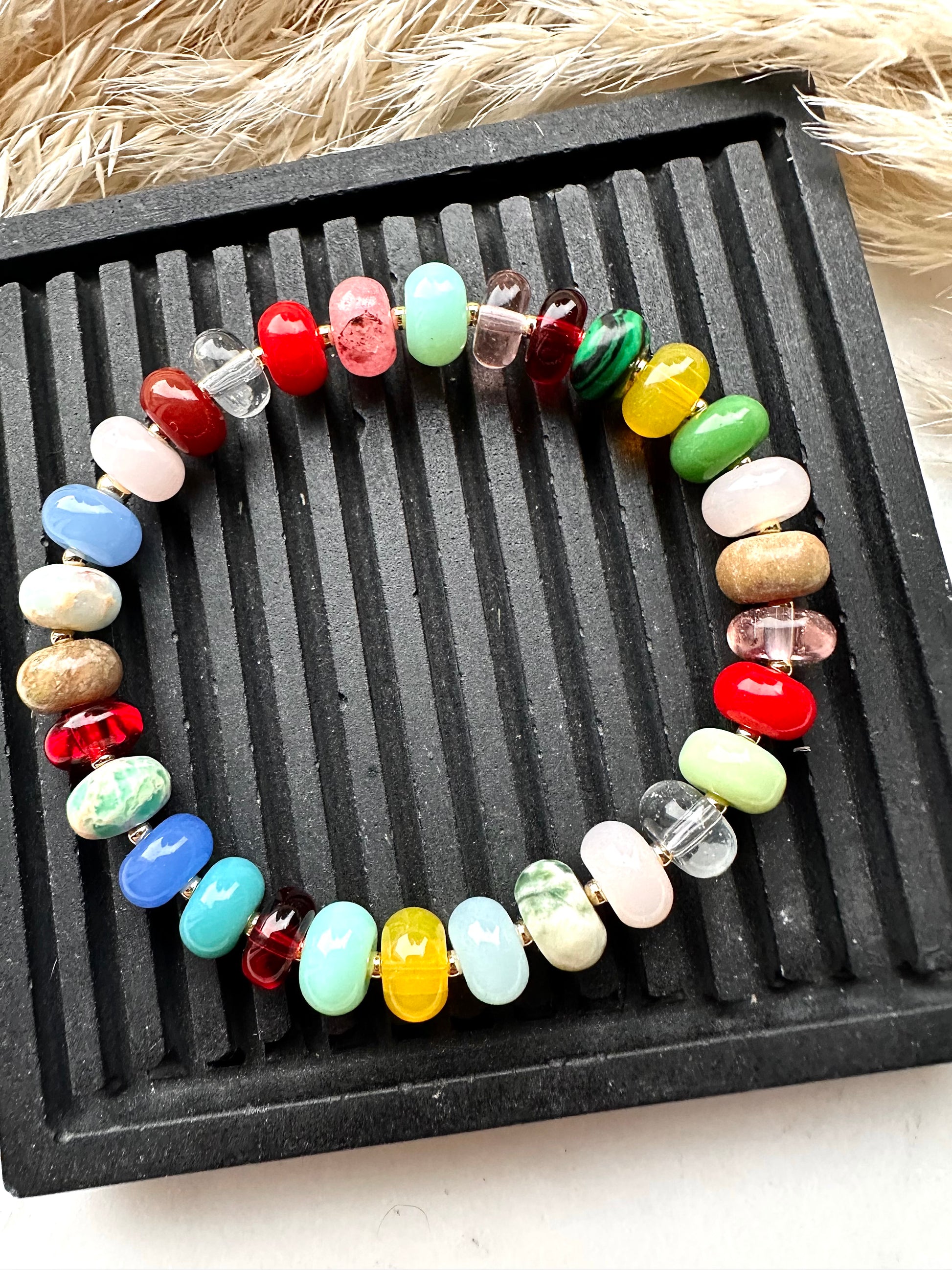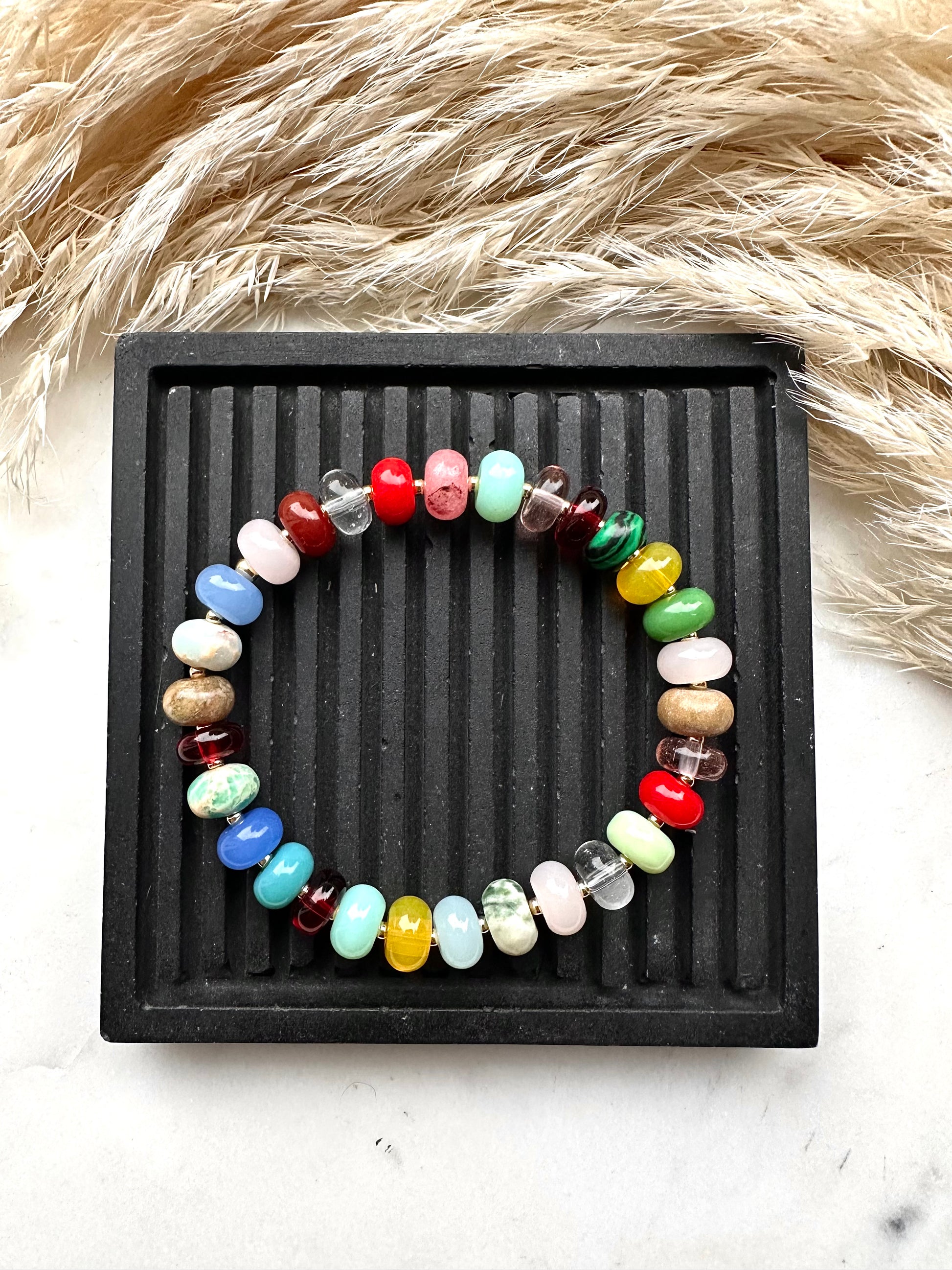 calling all gemstone loves, this one is for you! abacus disc mixed gemstones including rose quartz, red coral, sodalite, clear quartz, malachite & more…strung with your choice of sterling silver or gold filled accent beads