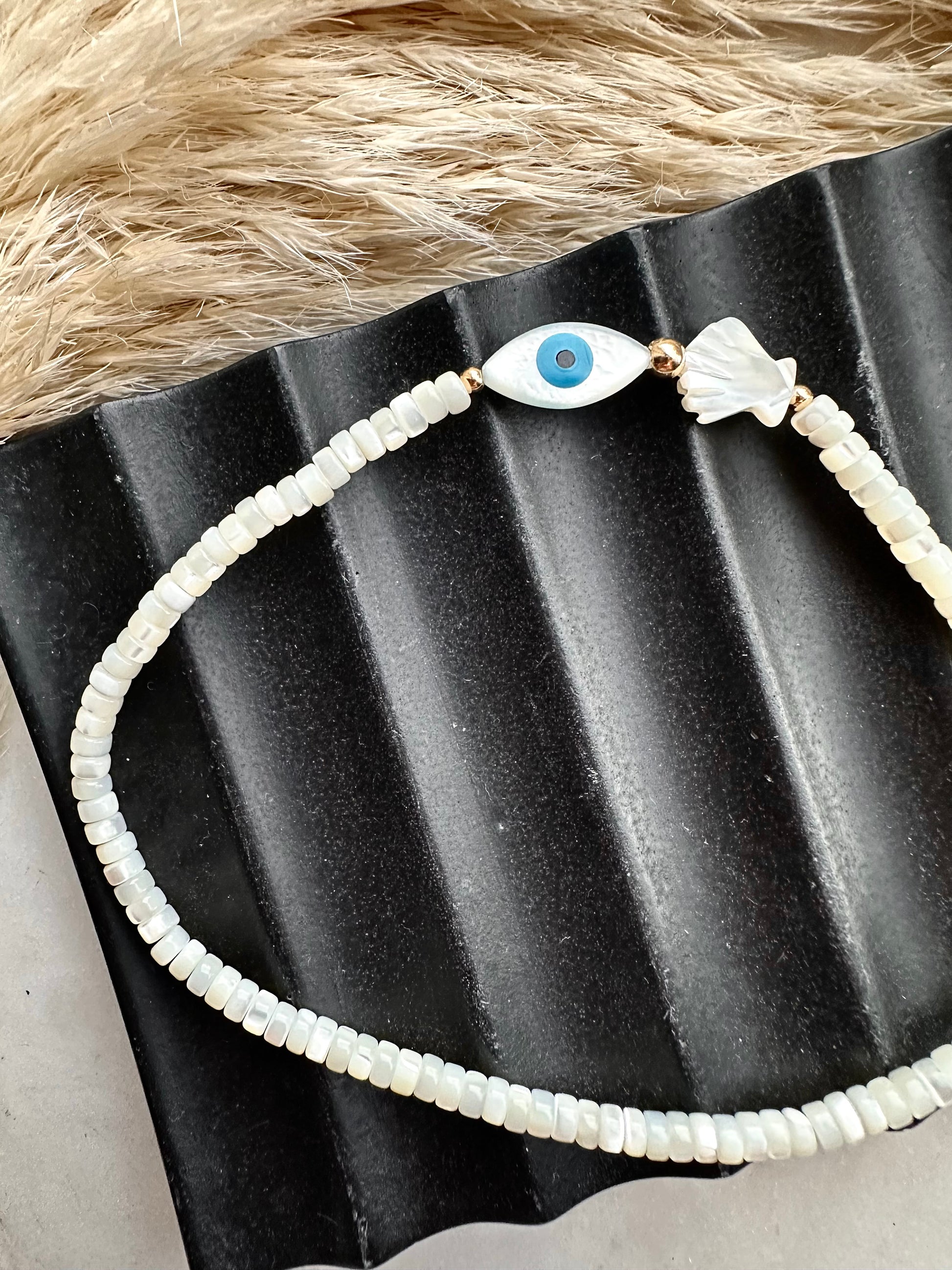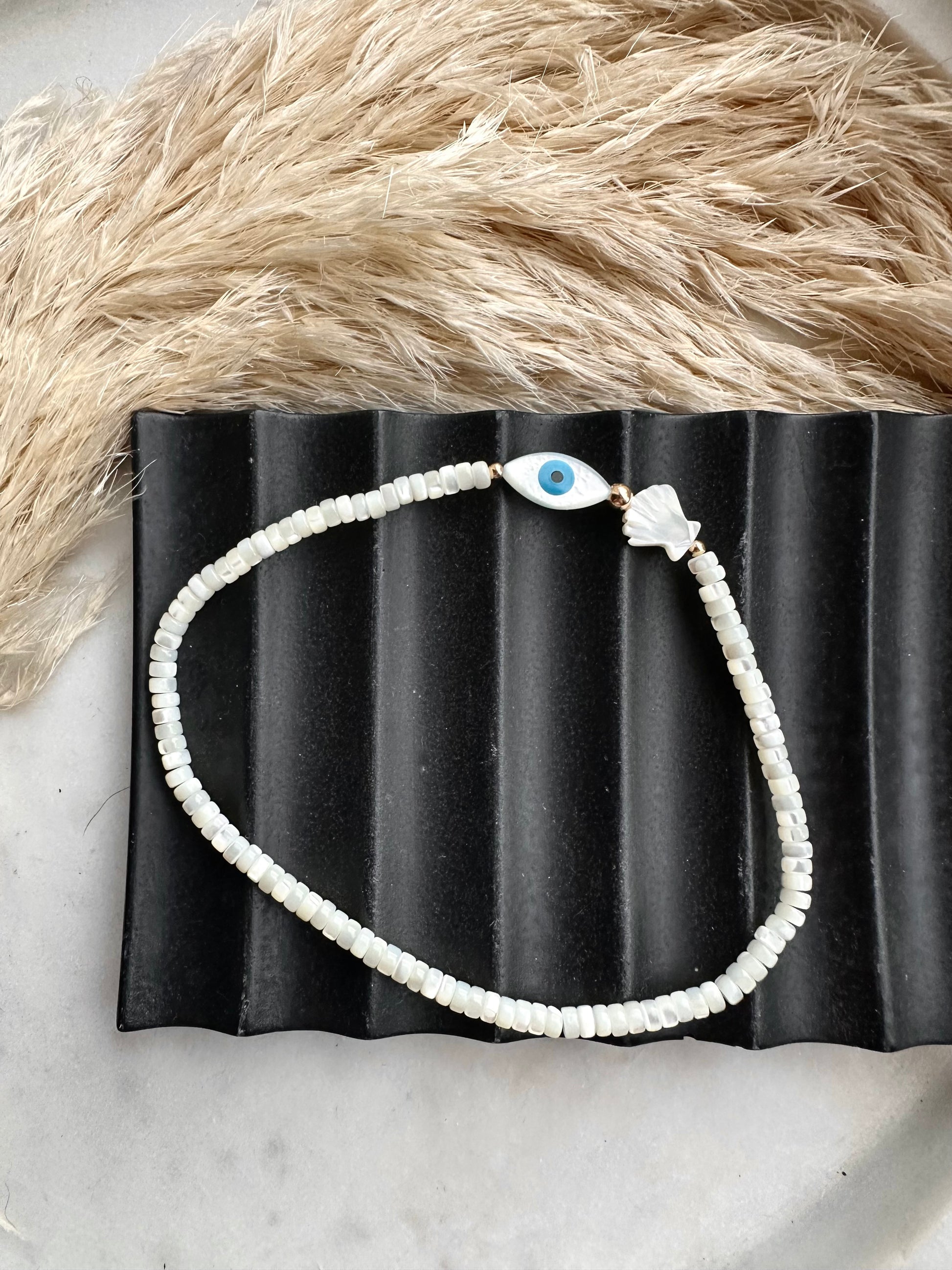 Mother of Pearl anklet paired with a sea shell and evil eye, plus your choice of sterling silver or gold filled accents.