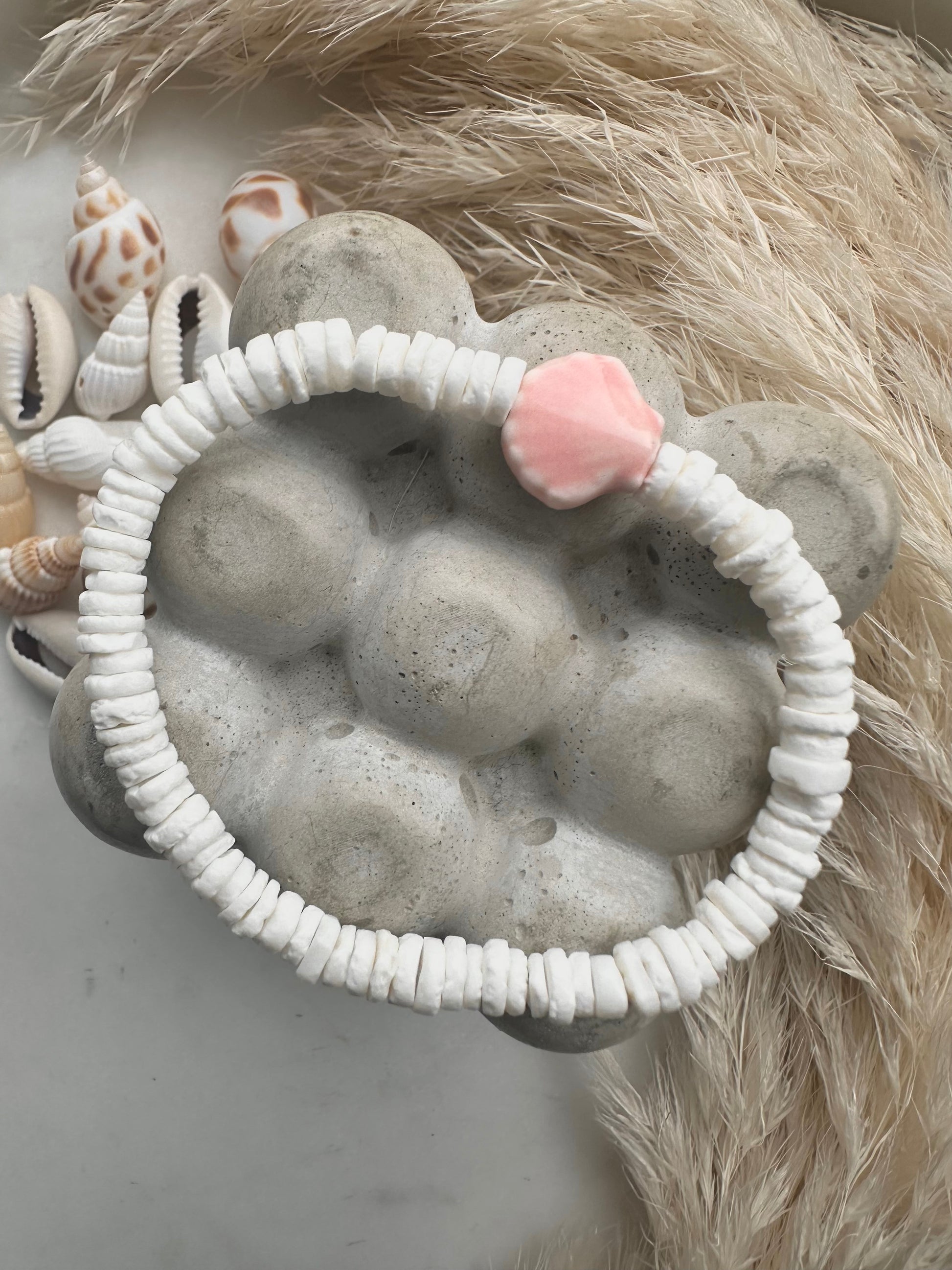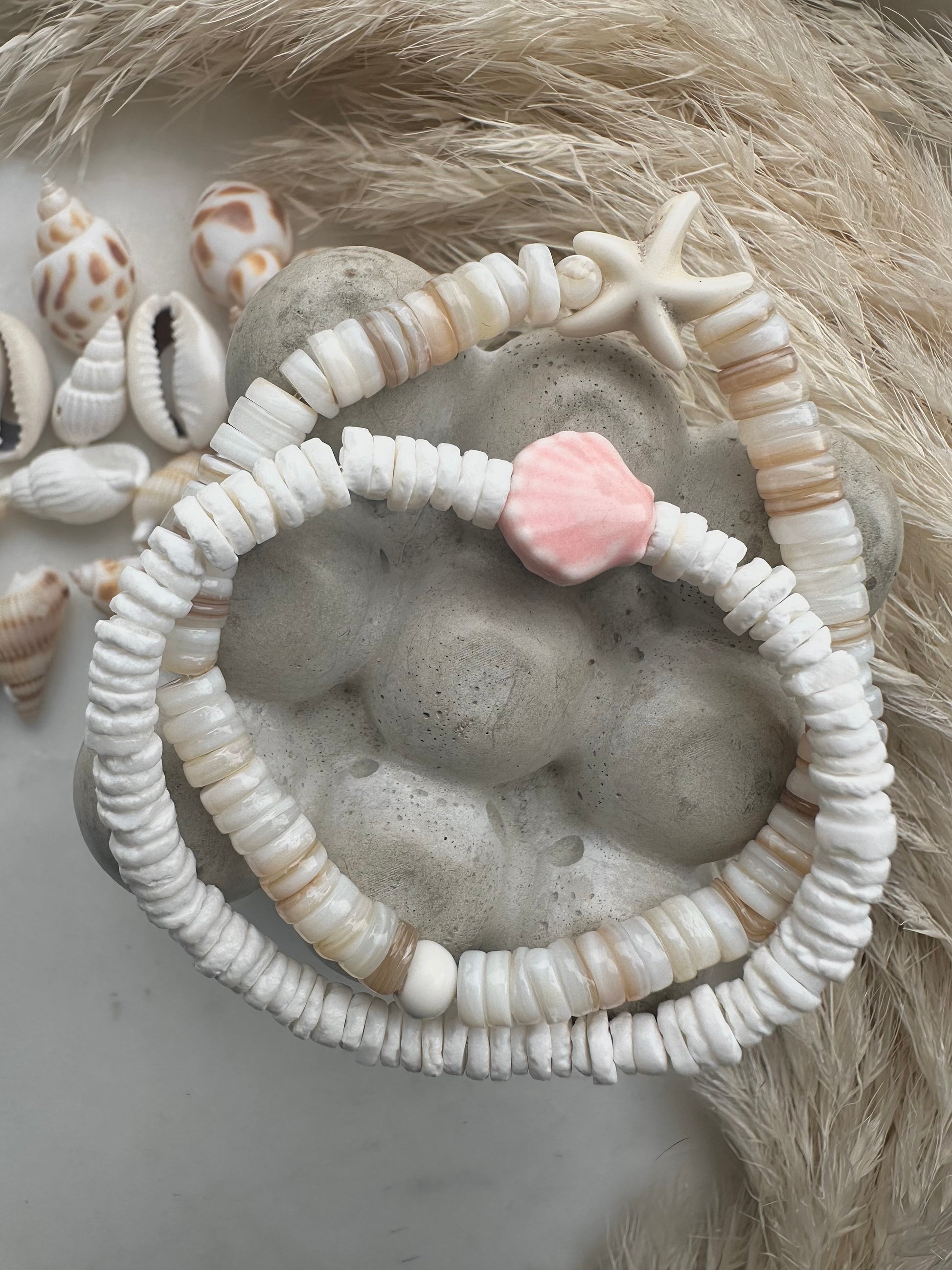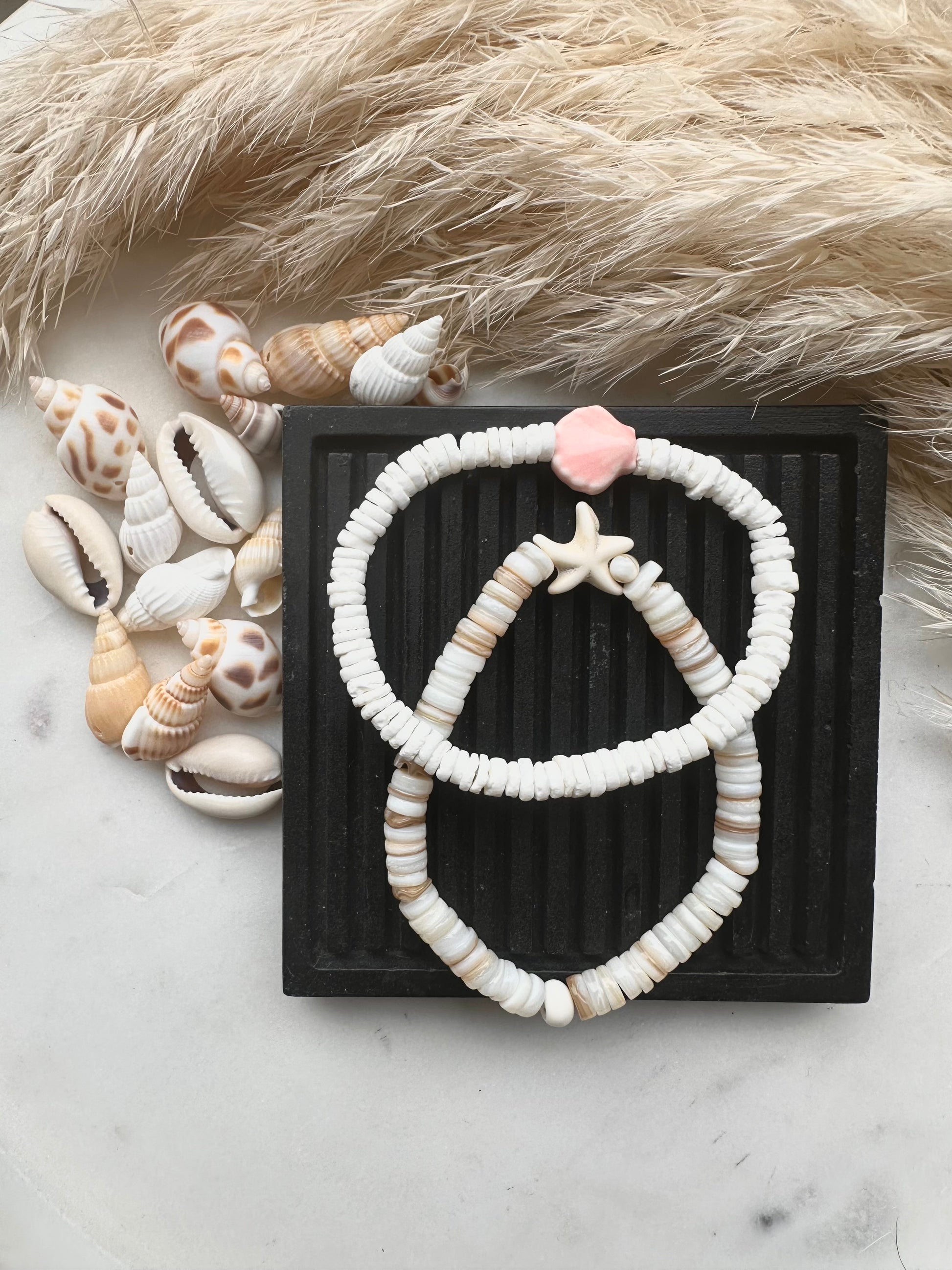 choose from white shell beads with a pale pink ceramic shell centre or freshwater shell beads with a natural hematite starfish…or choose both!
