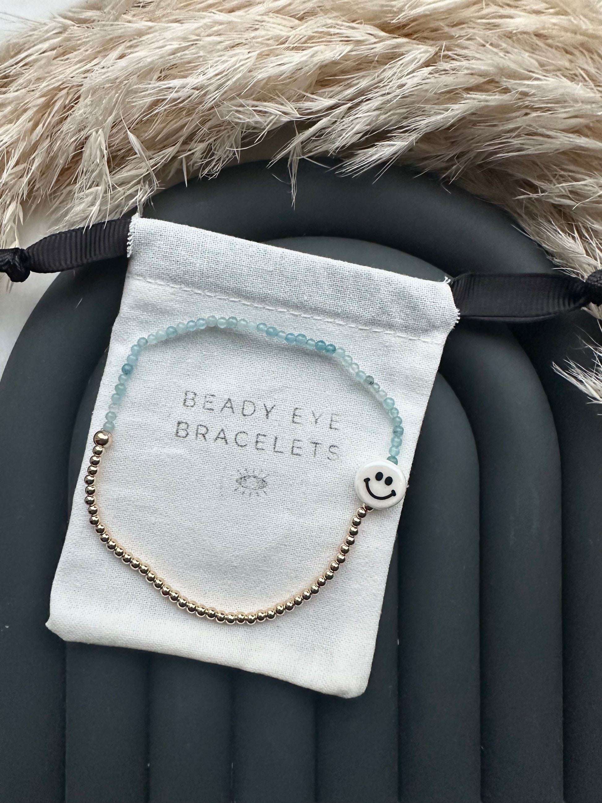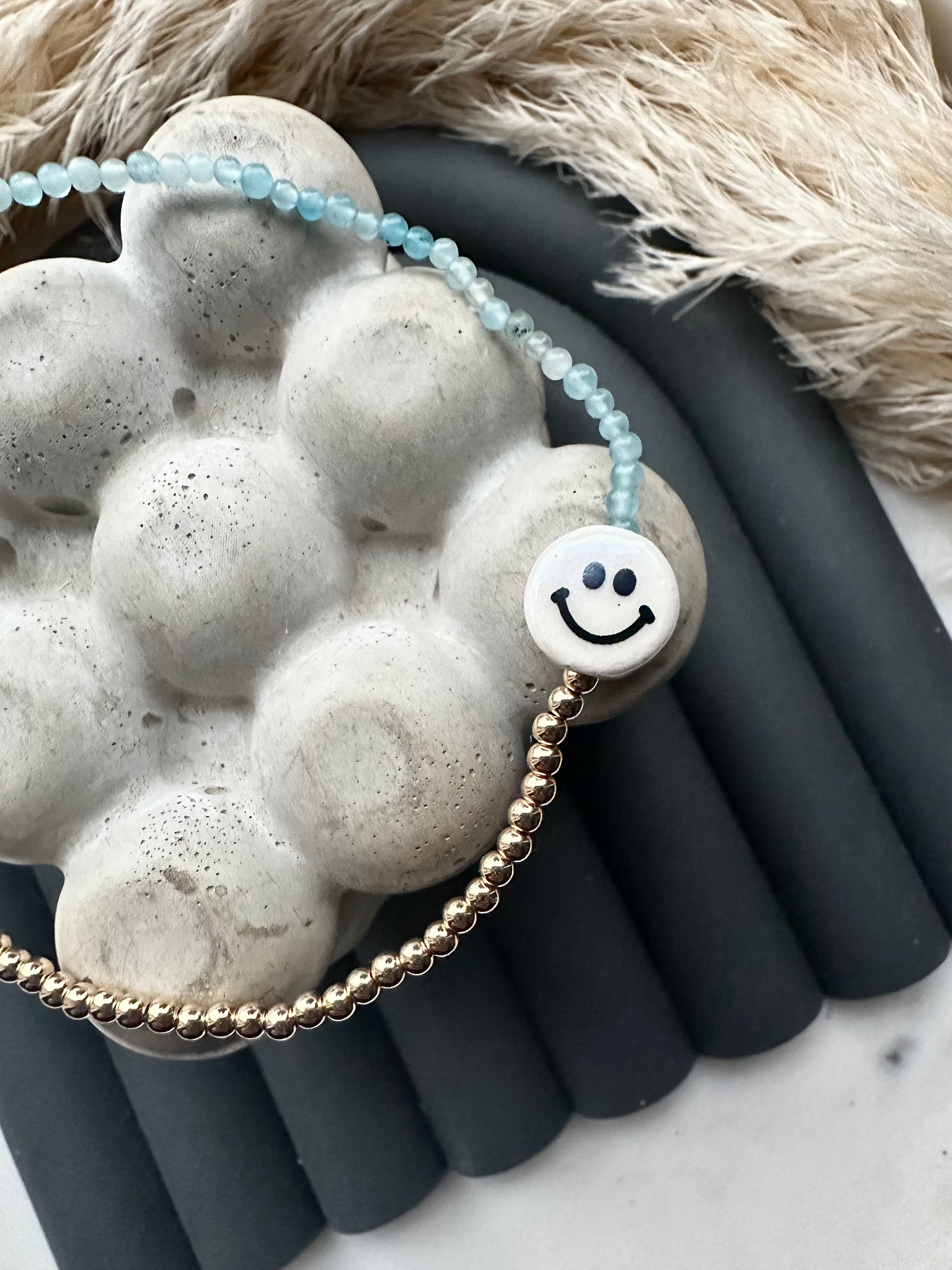 Skinny aquamarine with your choice of sterling silver, rose gold filled or gold filled beads all finished off with this cute ceramic smiley